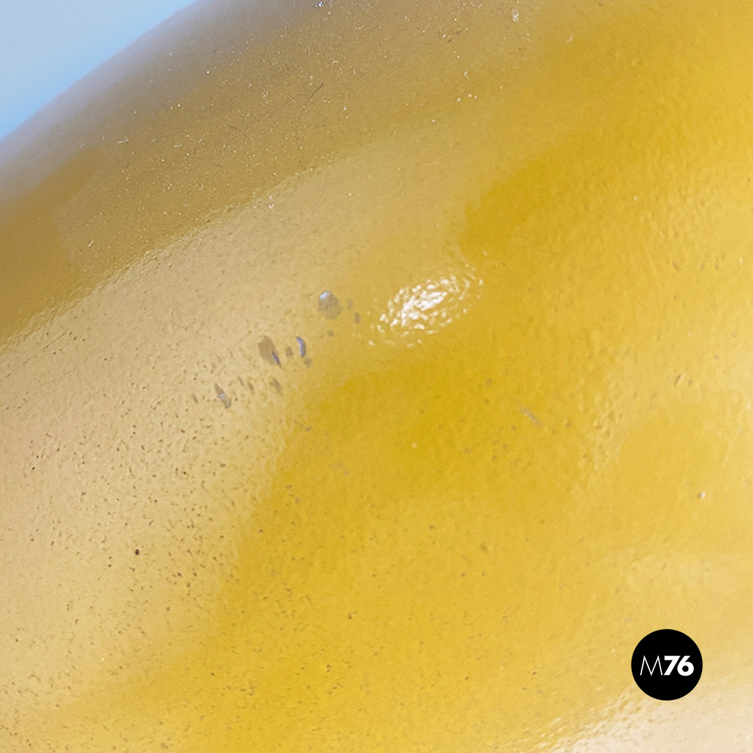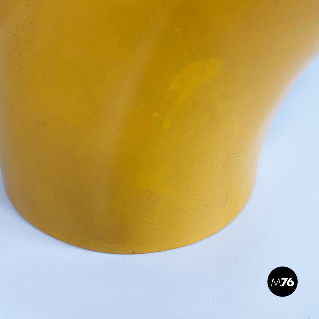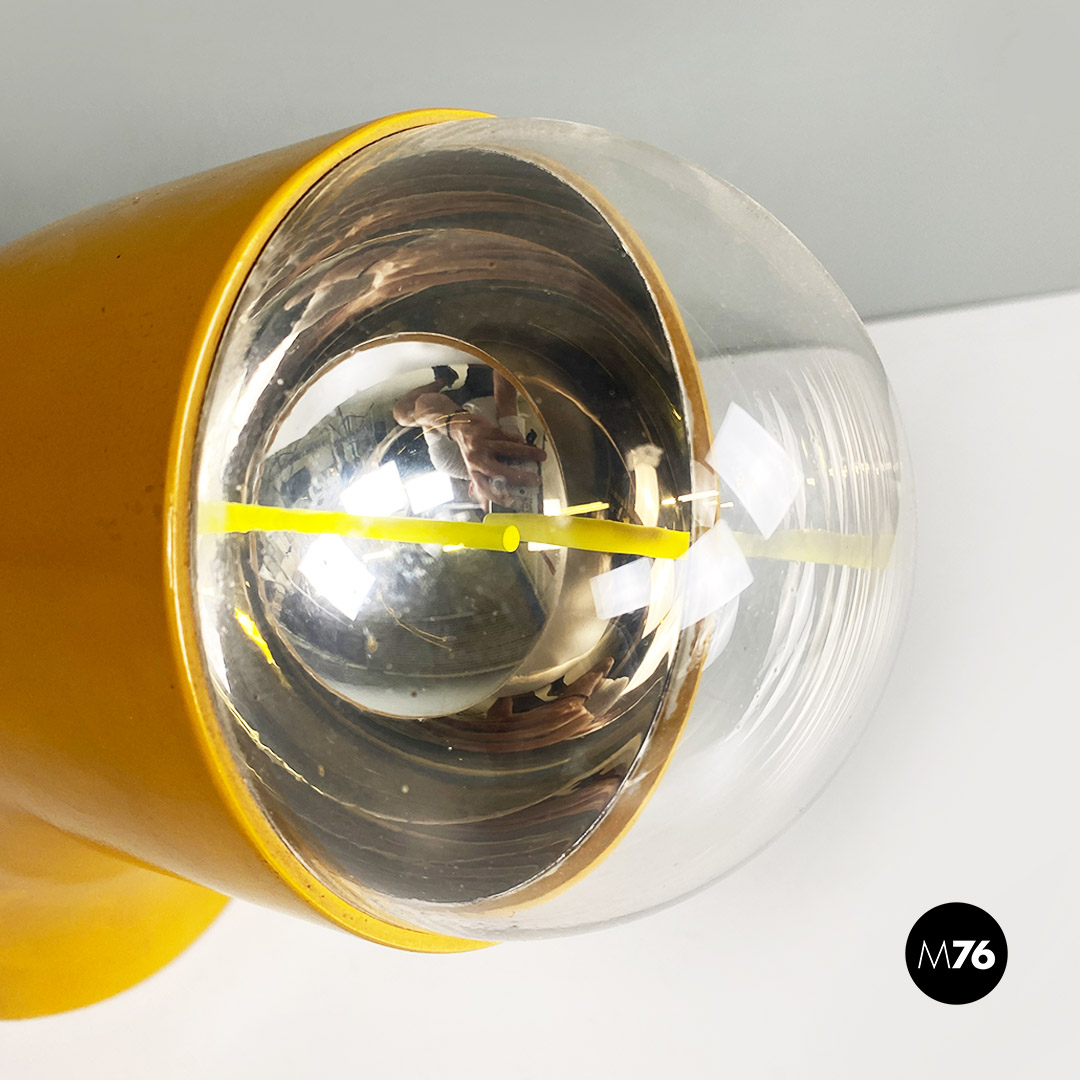 Scultura cinetica composta da un tubolare in plastica giallo senape e una sfera con all’interno una bacchetta di radio che genera fasci di colore giallo.