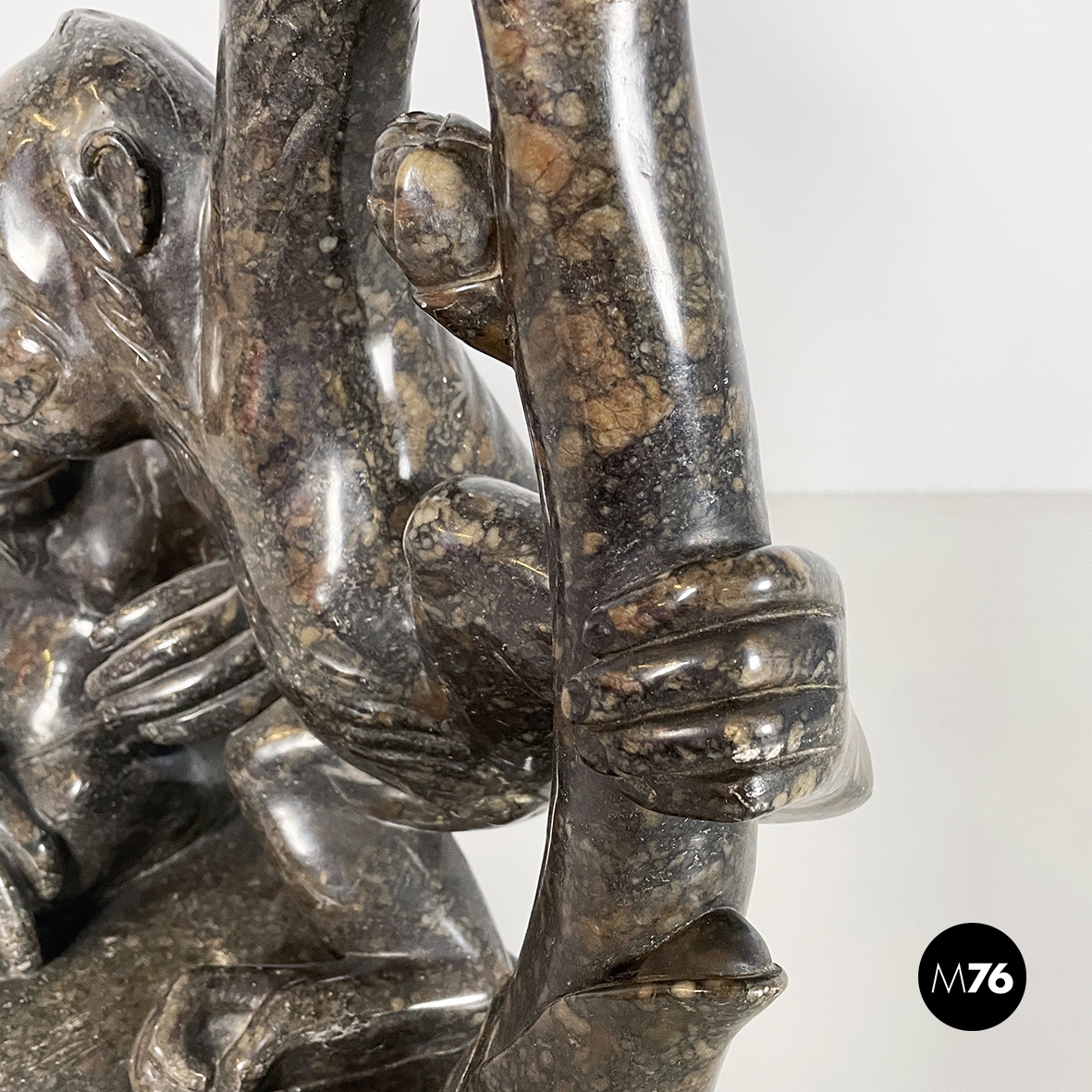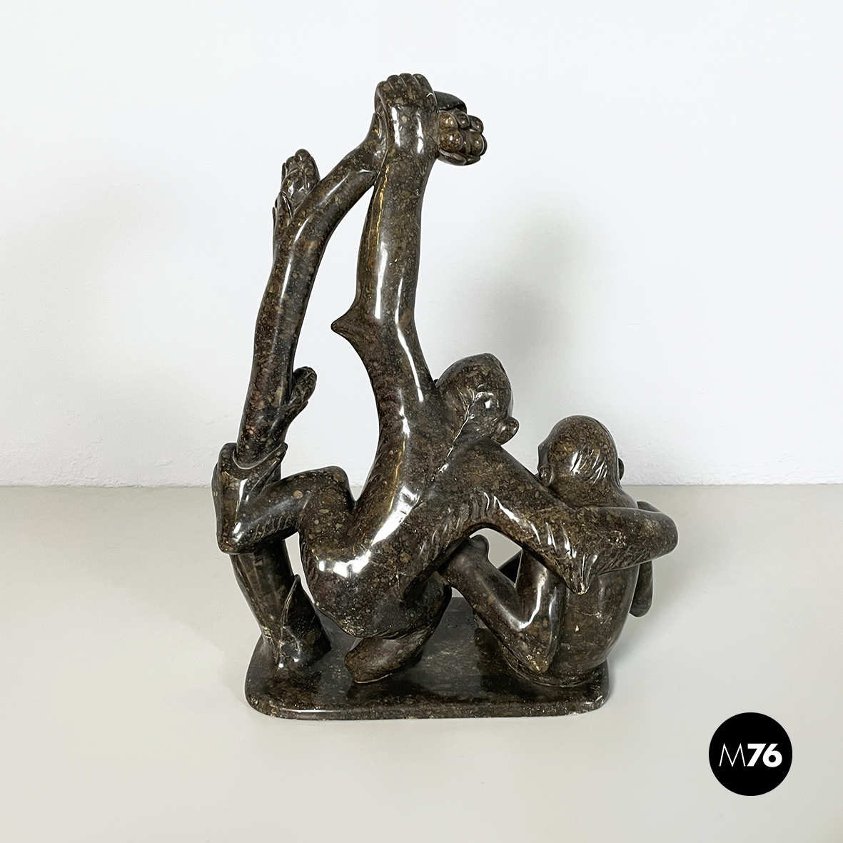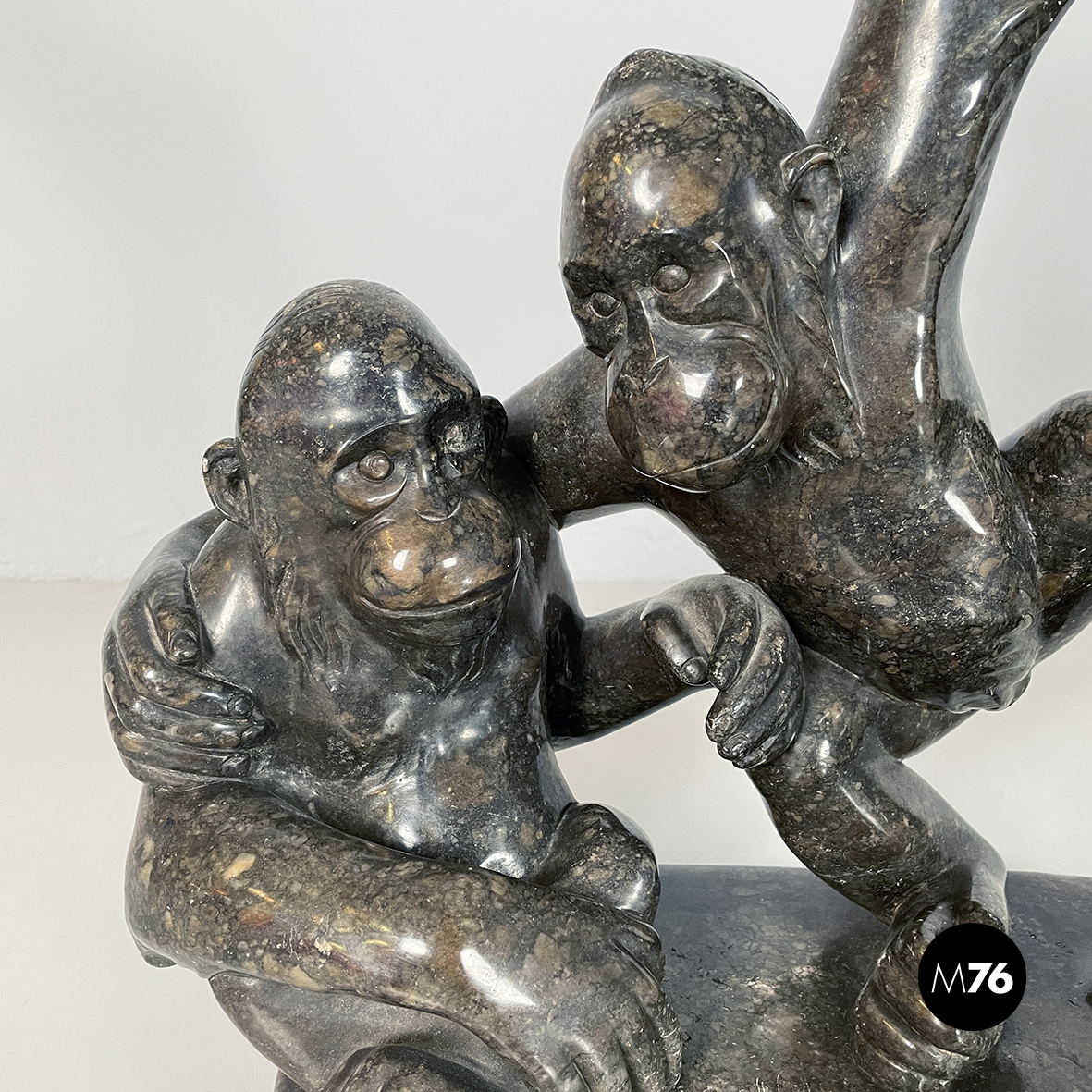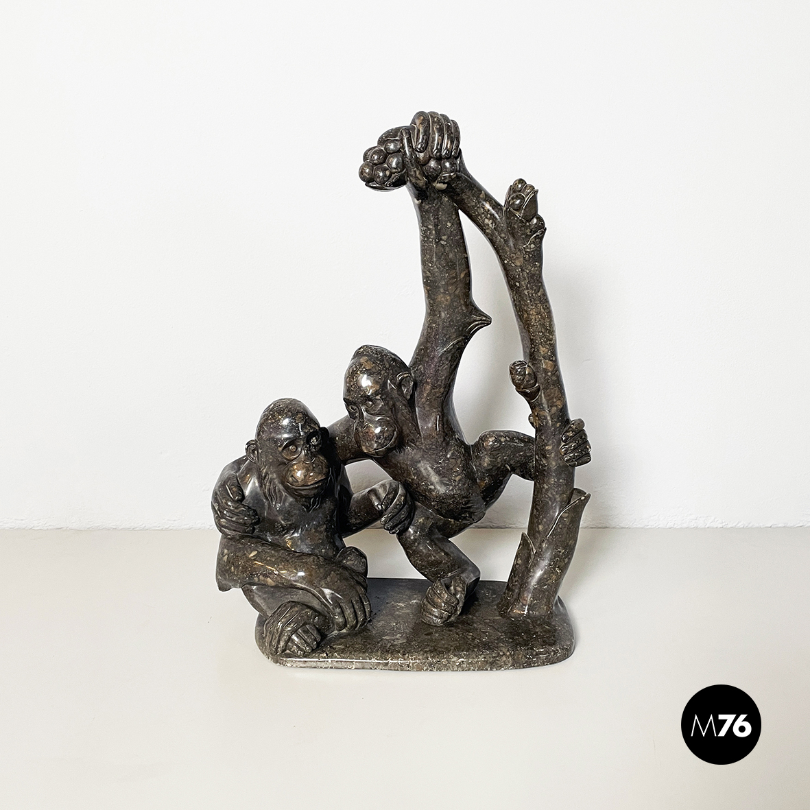 Scultura raffigurante due scimmie interamente in marmo scuro finemente lavorato. La prima scimmia è seduta a terra e la seconda è appesa ad un ramo mentre si protende verso la prima.