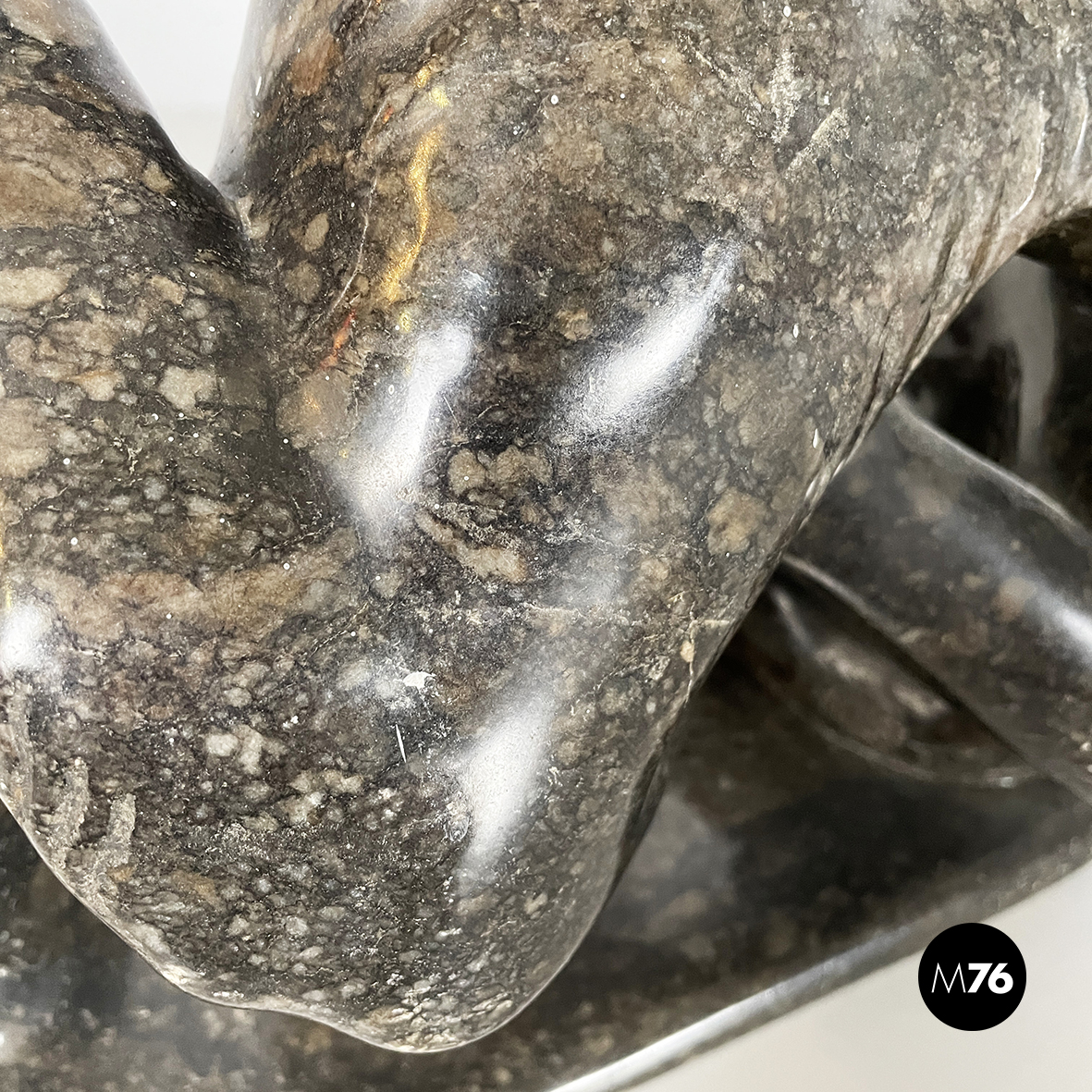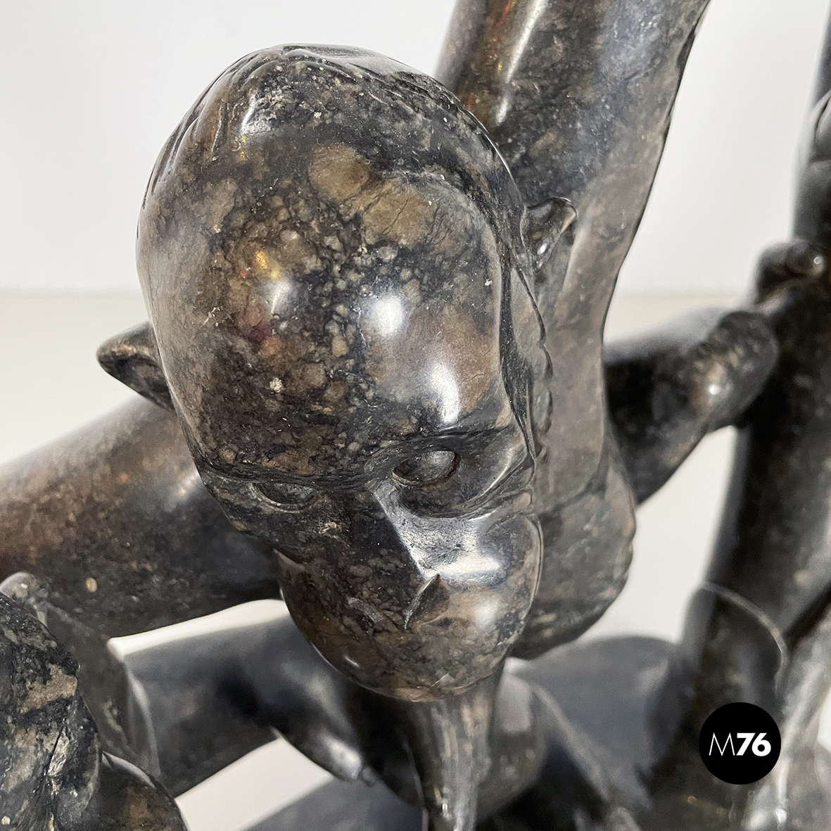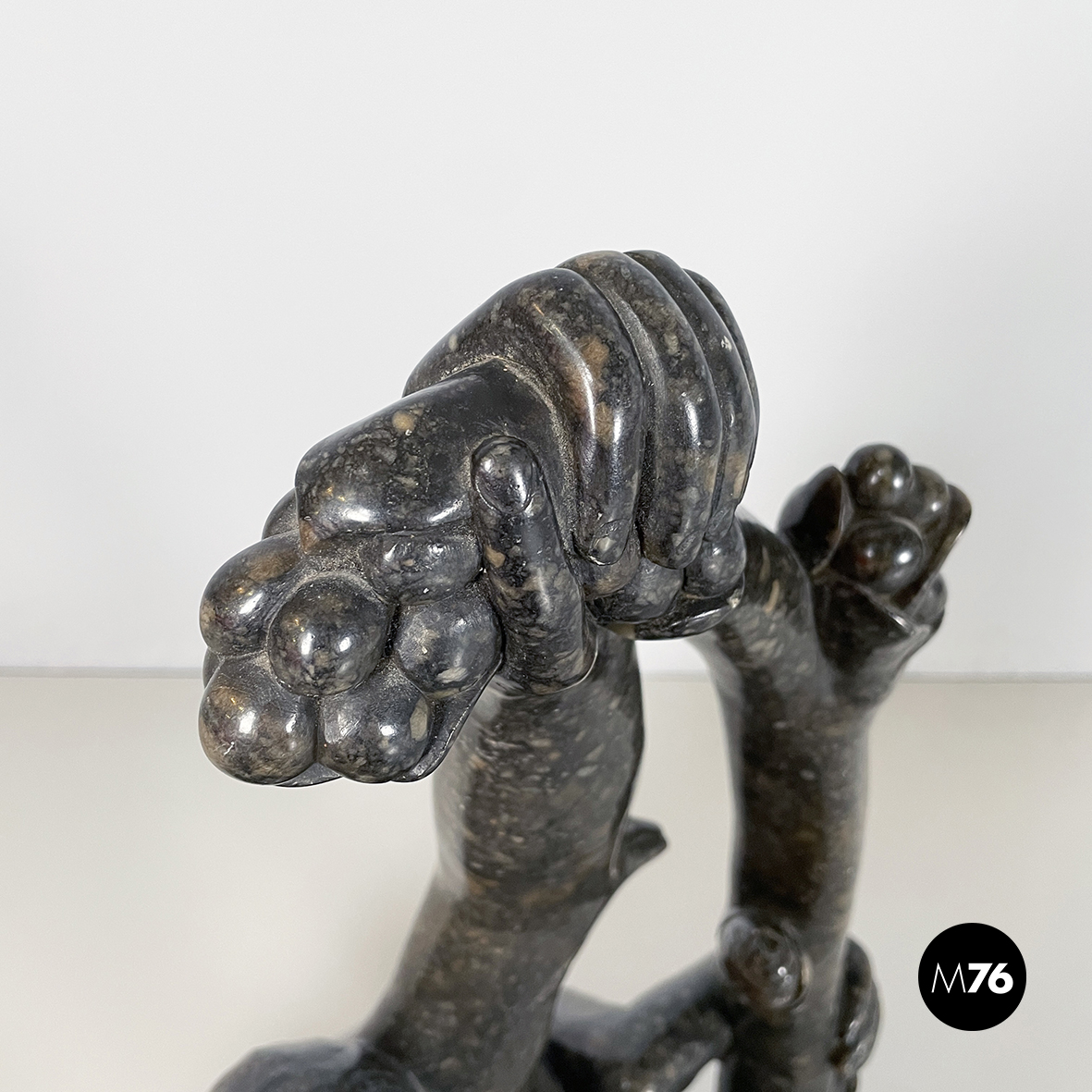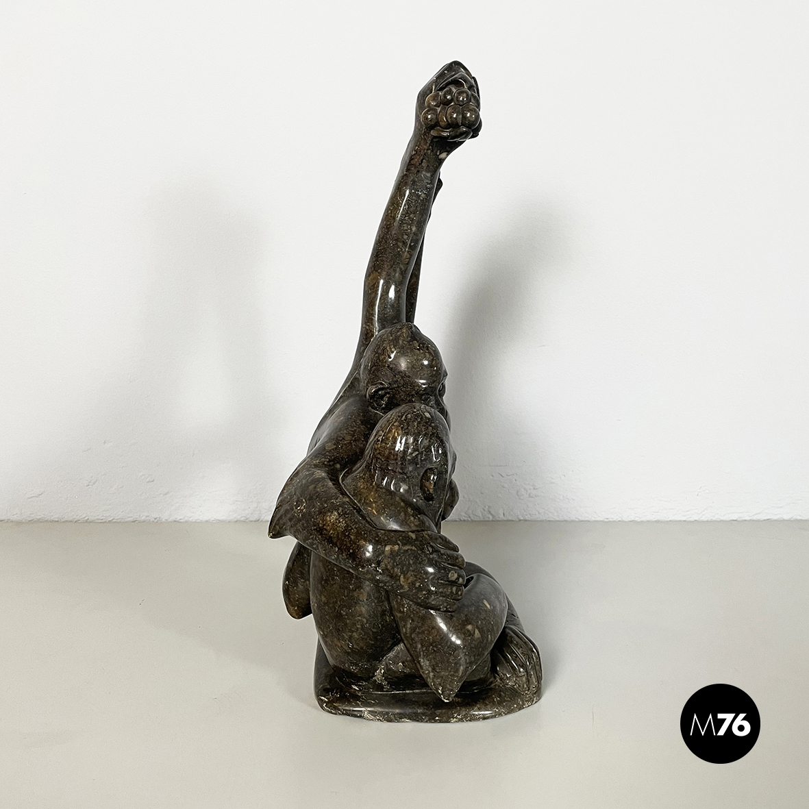 Scultura raffigurante due scimmie interamente in marmo scuro finemente lavorato. La prima scimmia è seduta a terra e la seconda è appesa ad un ramo mentre si protende verso la prima.