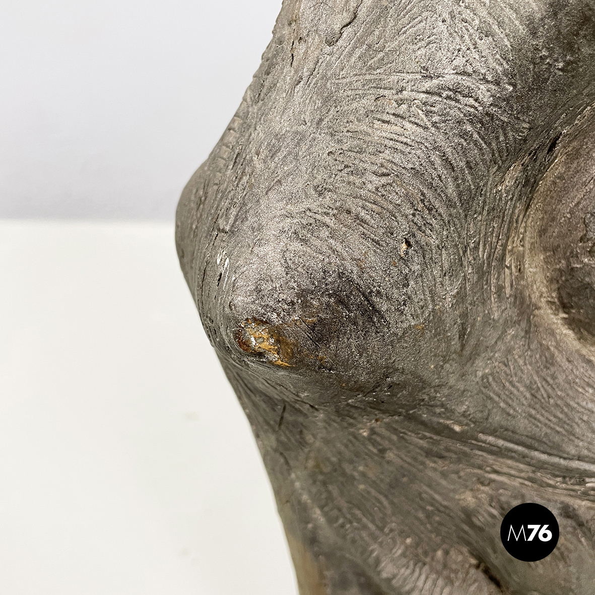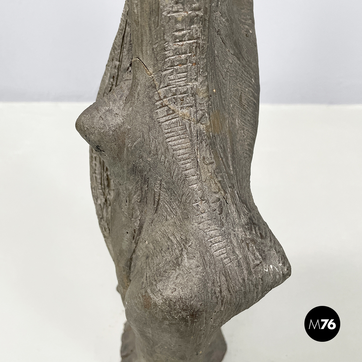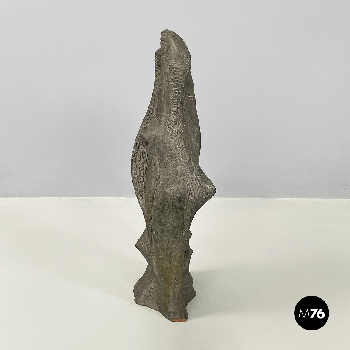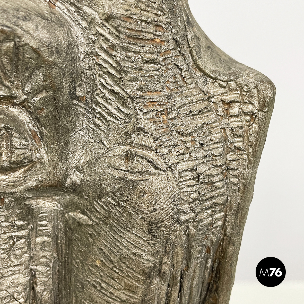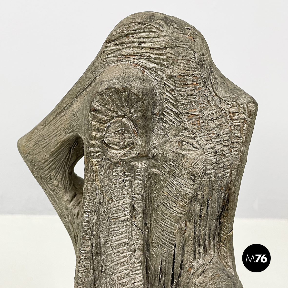 Scultura in terracotta dipinta di grigio scuro. La forma della scultura è organica e tondeggiante. Nella parte alta è visibile un occhio. Su tutta l’opera sono presenti delle incisioni decorativa.