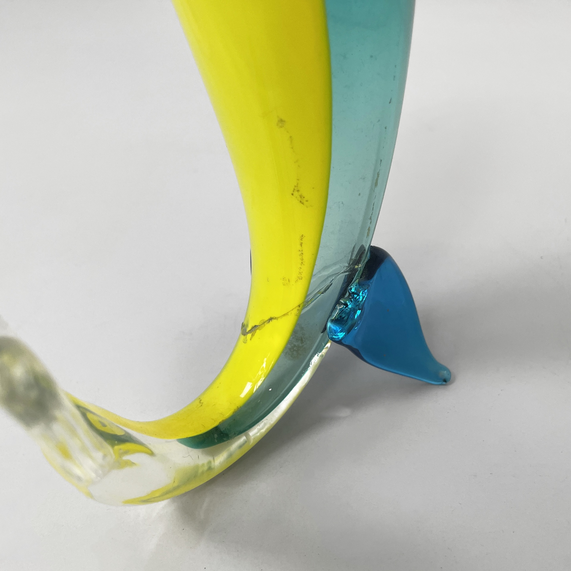 Scultura a forma di pesce, interamente in vetro di Murano. La bocca aperta verso l’altro è gialla, mentre il corpo è sui toni del verde e azzurro con una linea decorativa gialla. Le pinne azzurre sorreggono il pesce. Occhi tondi in vetro rosso.