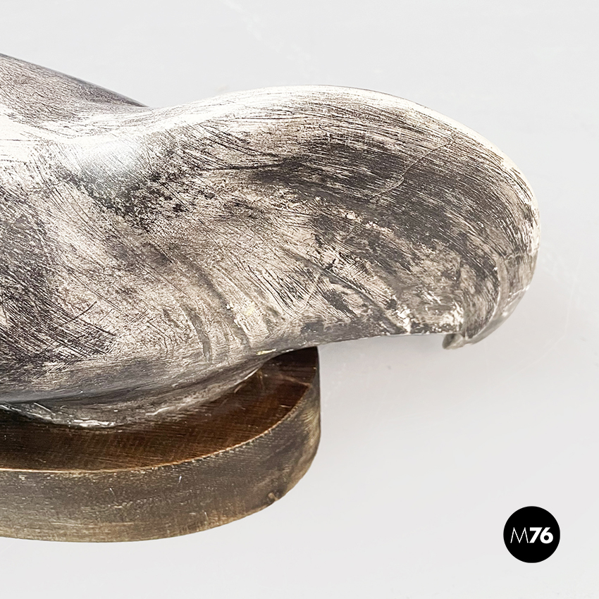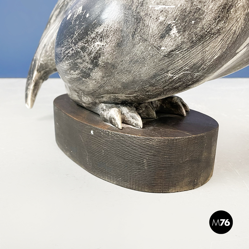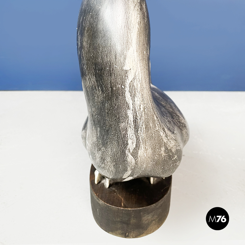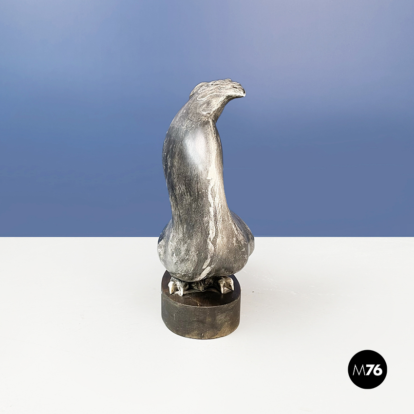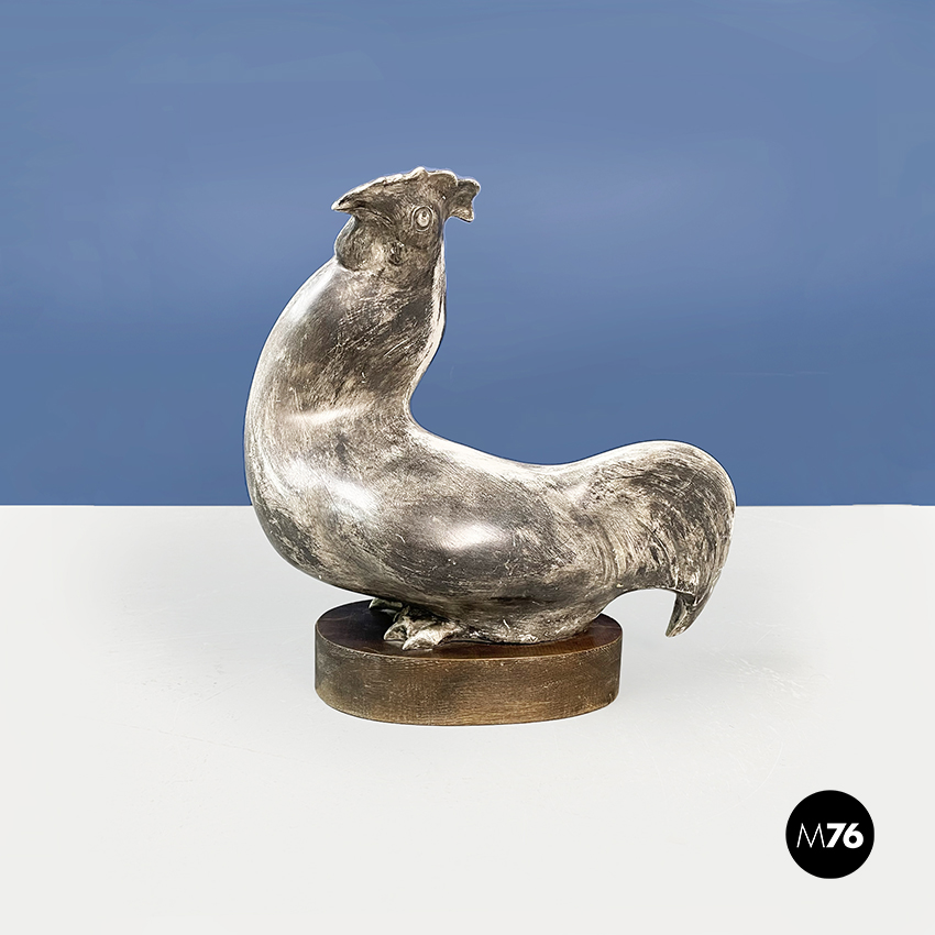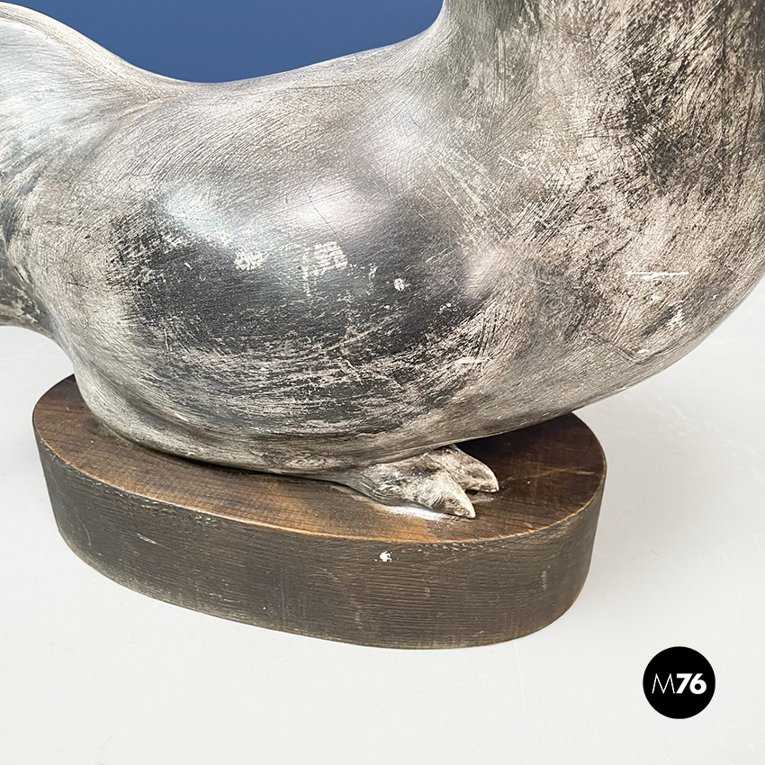 Statua di gallo dalla forma sinuosa in ceramica verniciata in grigio. Finemente lavorata. Piedistallo ovale in legno.