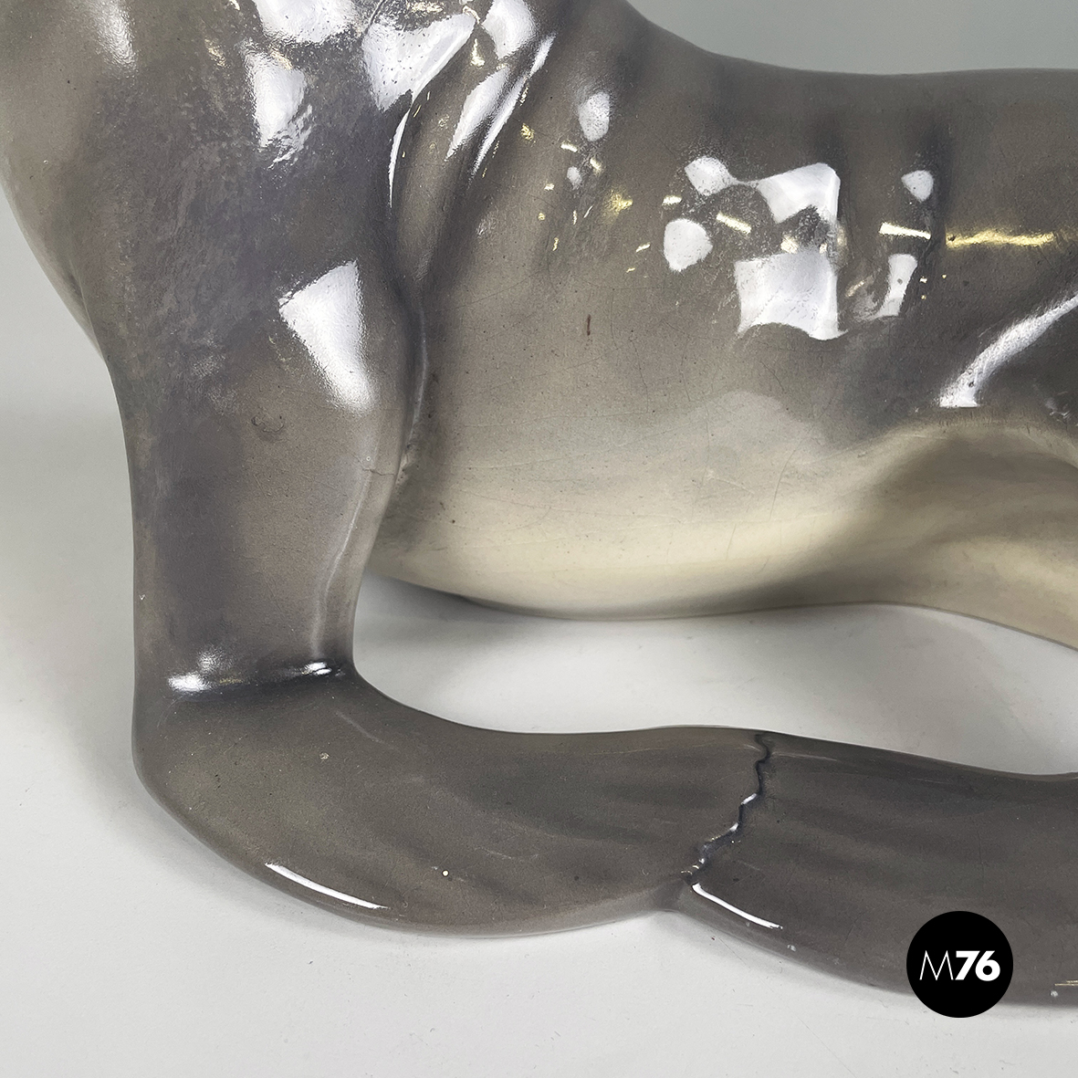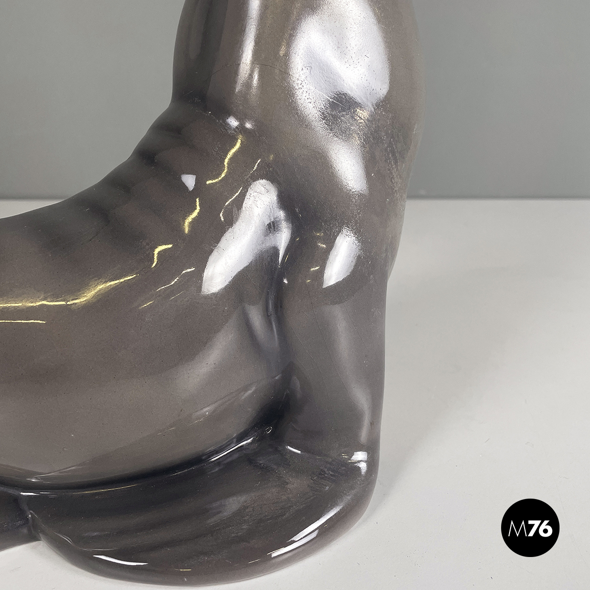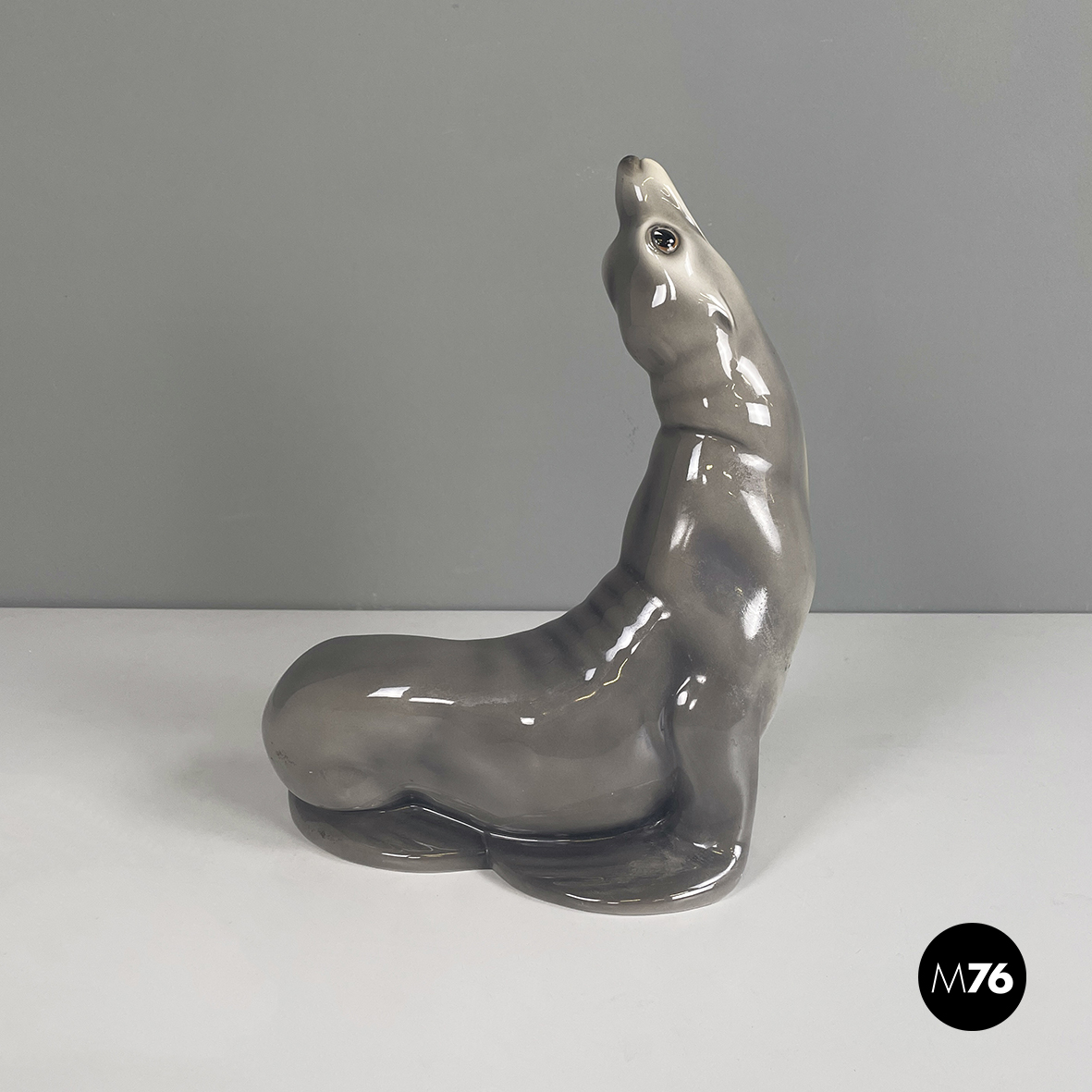 Scultura in ceramica raffigurante un leone marino con il muso teso verso l’alto. Finemente lavorata e dipinta.