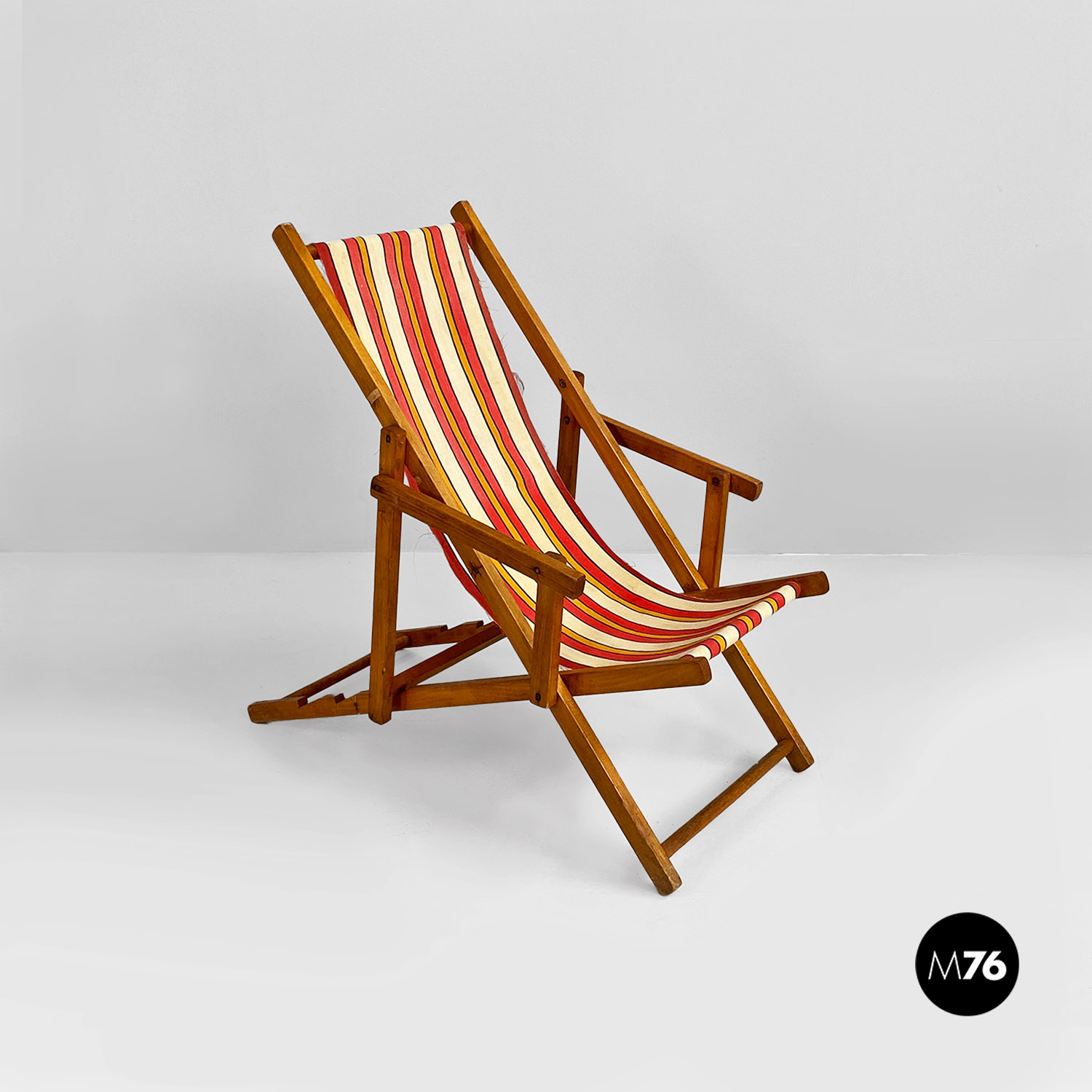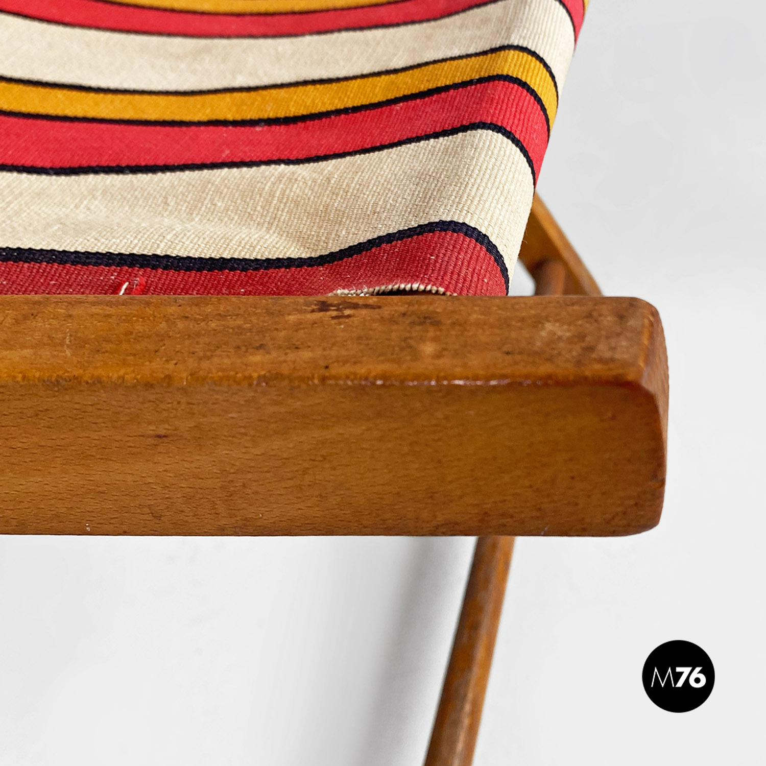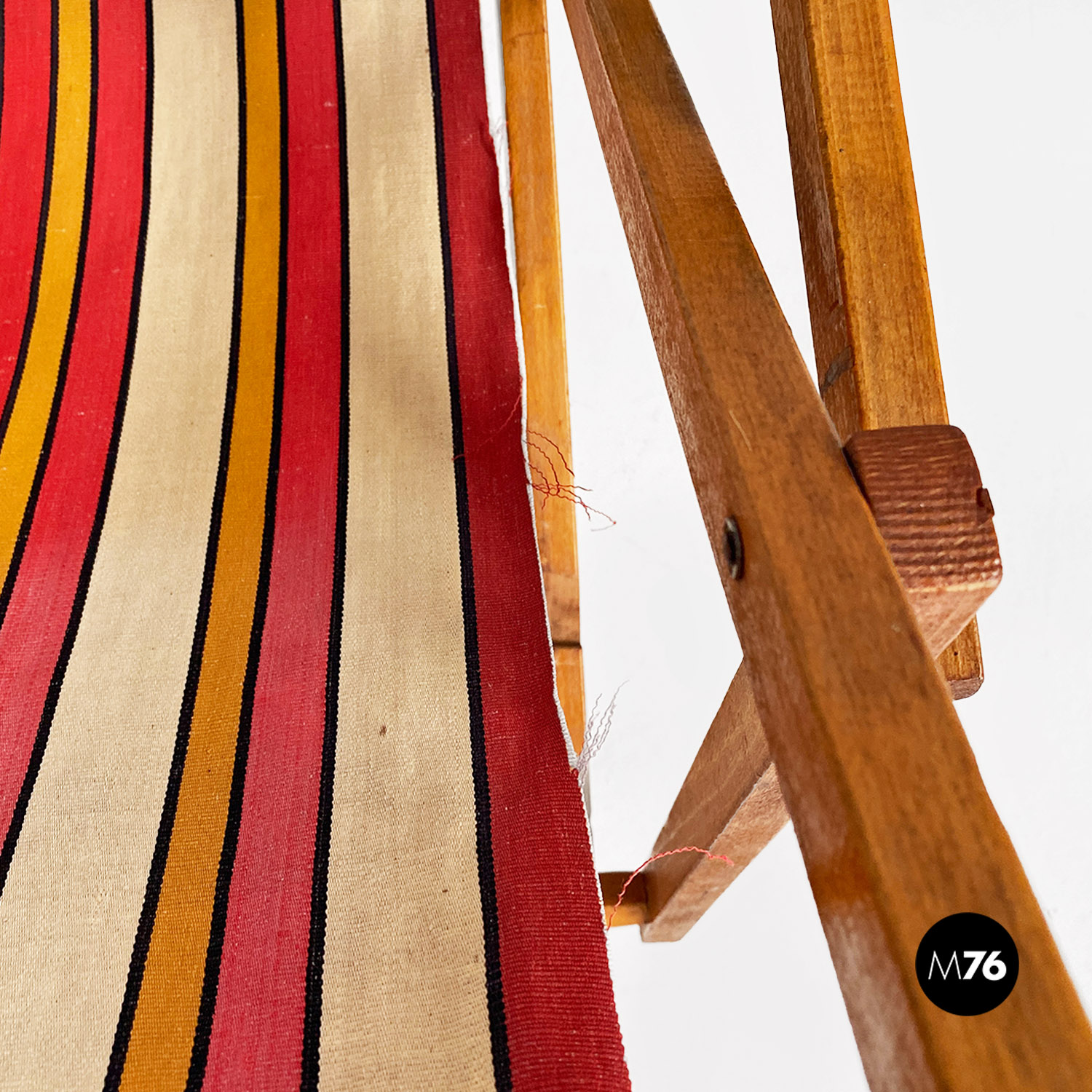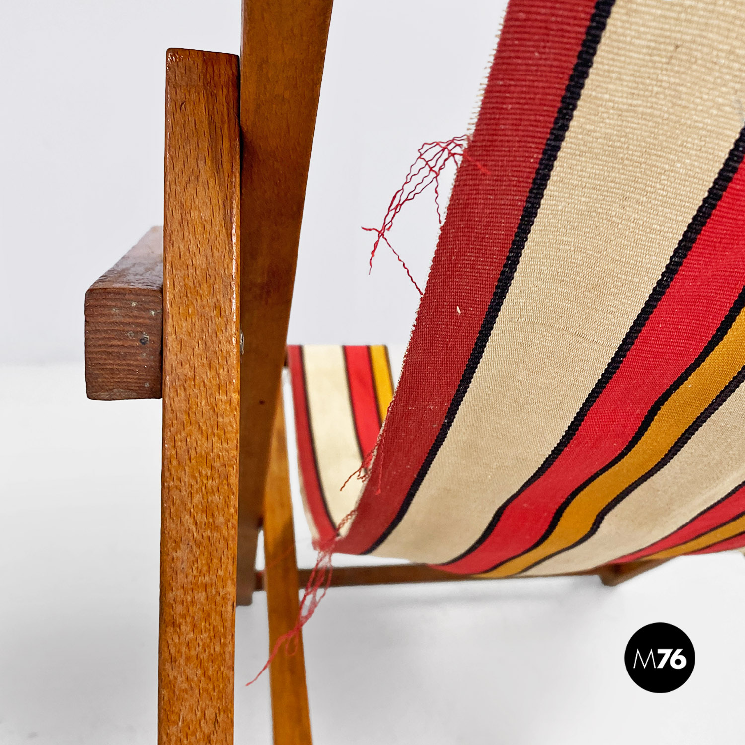 Sdraio da bambino con struttura in legno e seduta in tessuto a righe colorate rosse gialle e beige.