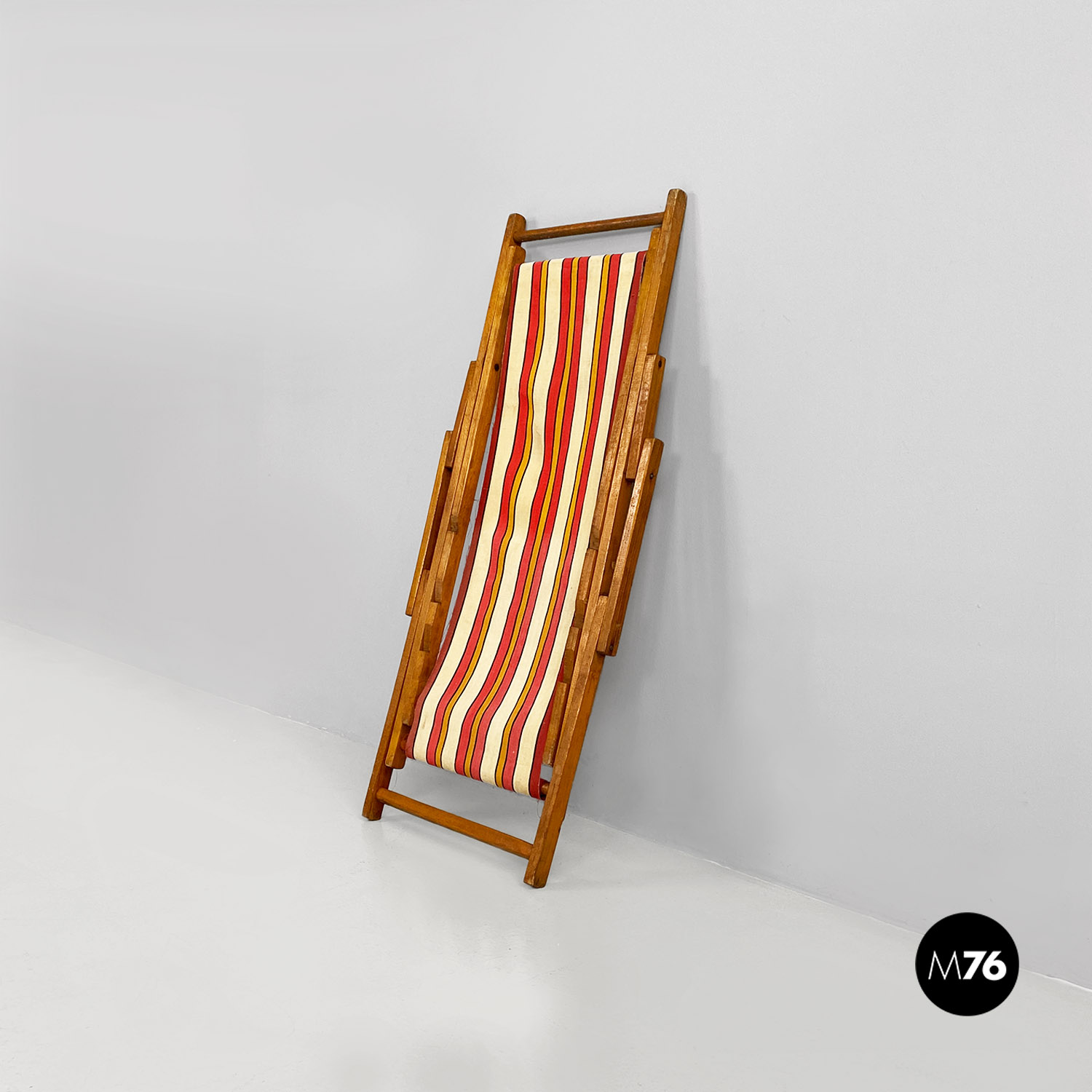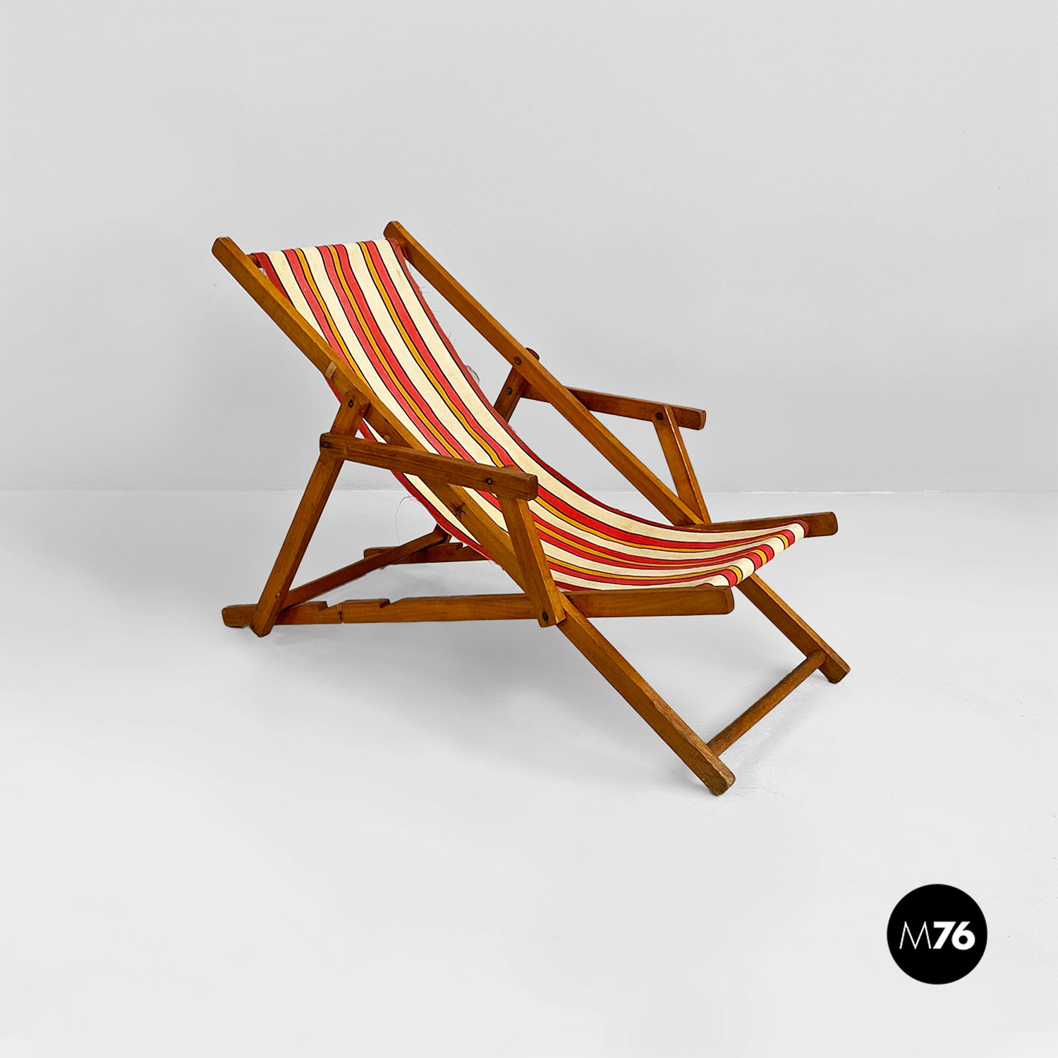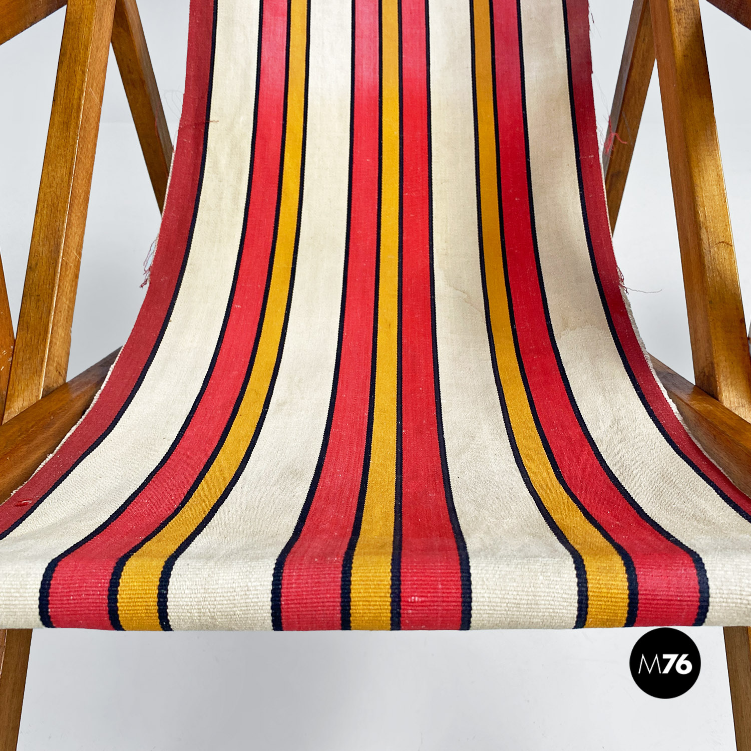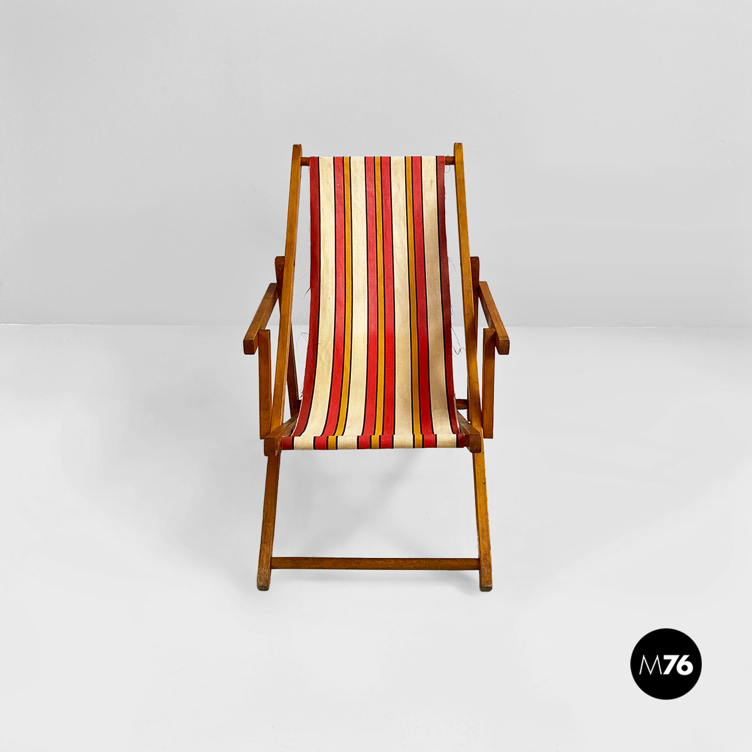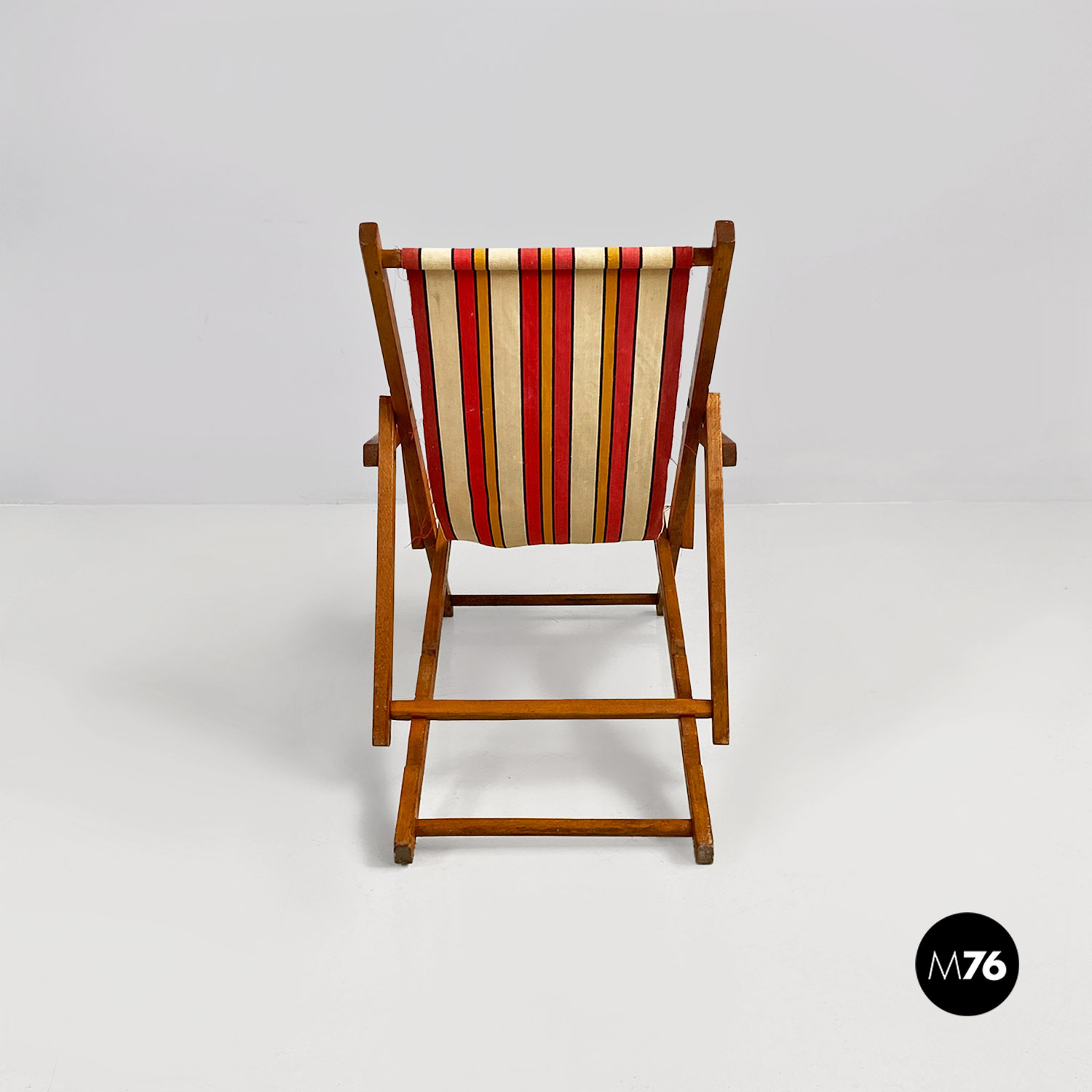 Sdraio da bambino con struttura in legno e seduta in tessuto a righe colorate rosse gialle e beige.