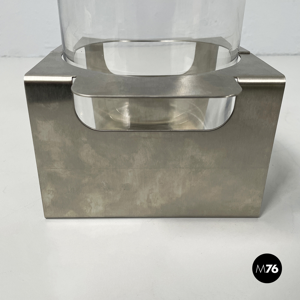 Secchiello per ghiaccio con pinza in metallo e vetro. Il secchiello è composto da un cestino cilindrico in vetro spesso inserito in una struttura di metallo. La struttura presenta delle piccole maniglie per poterlo trasportare senza toccare il contenitore del ghiaccio. Le pinze in metallo inossidabile presentano un foro tondo verso la punta.