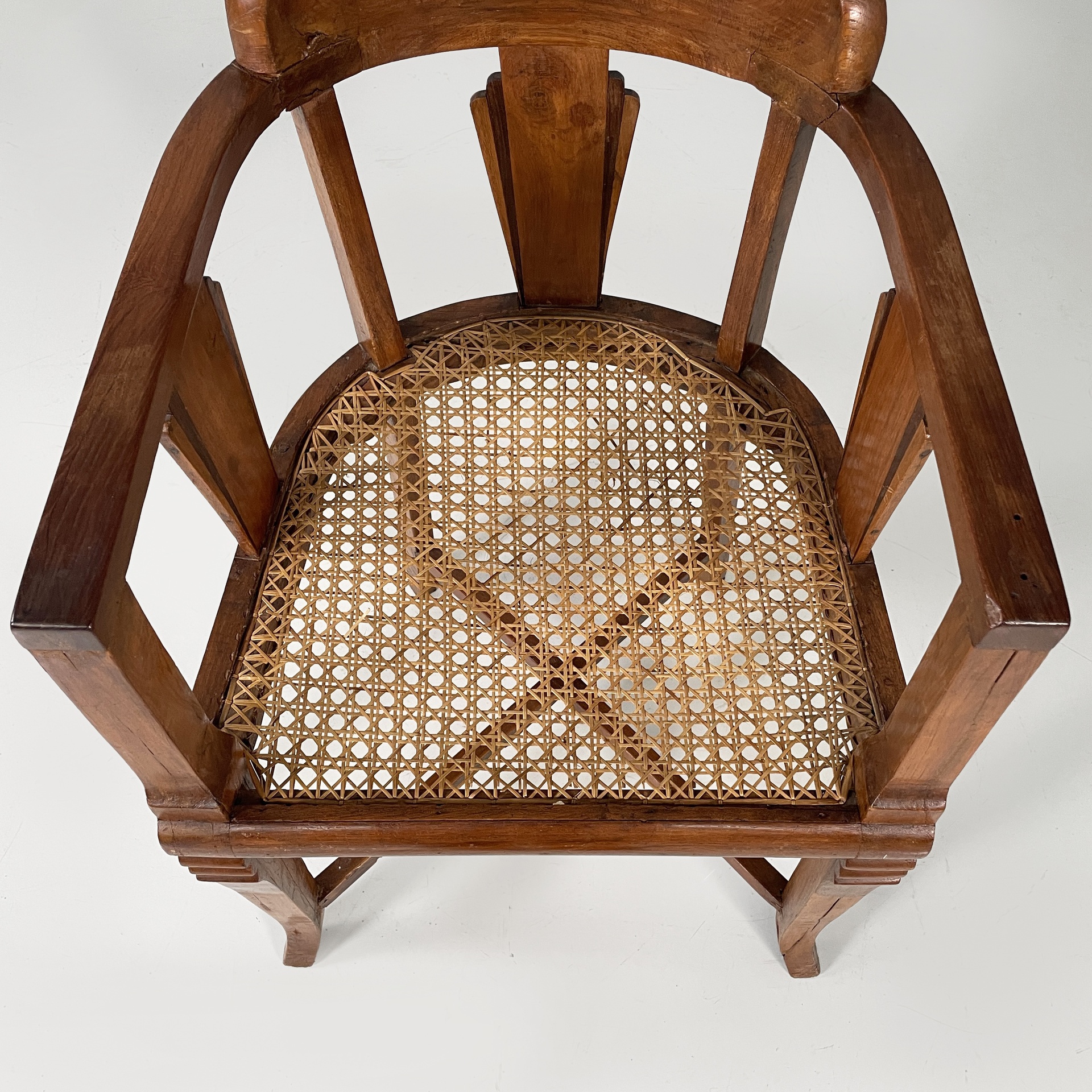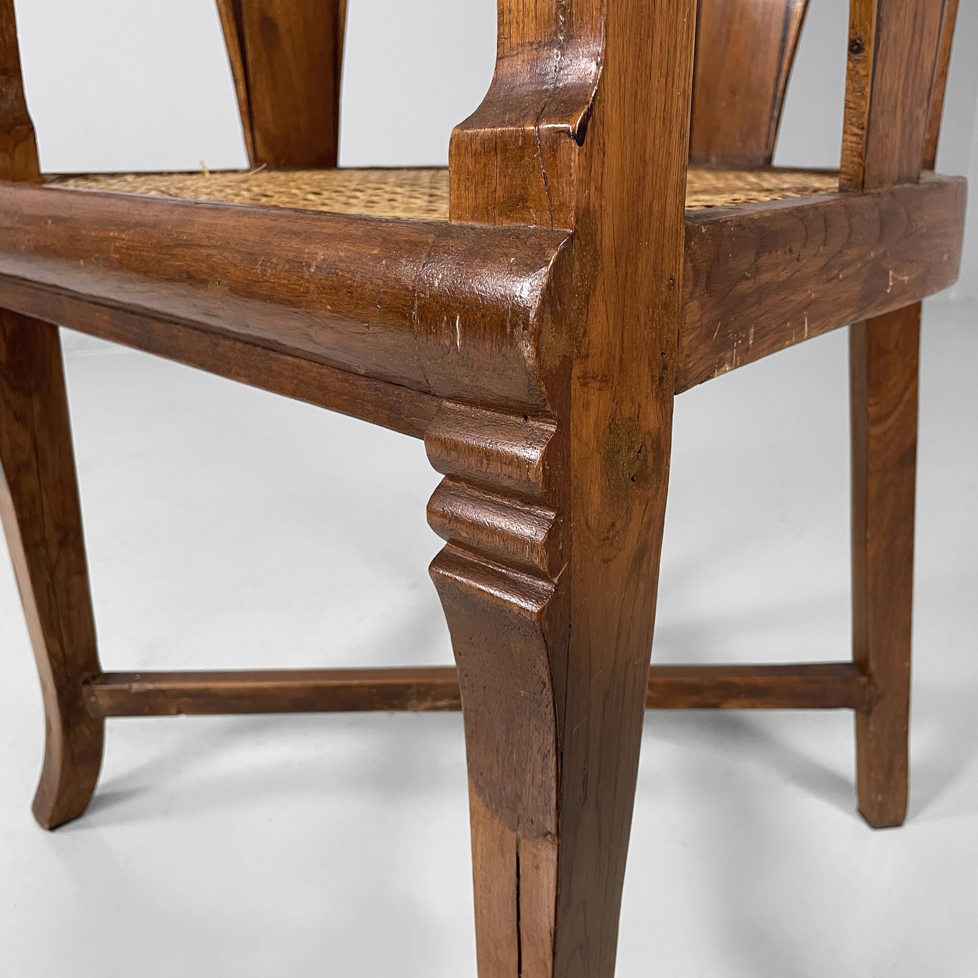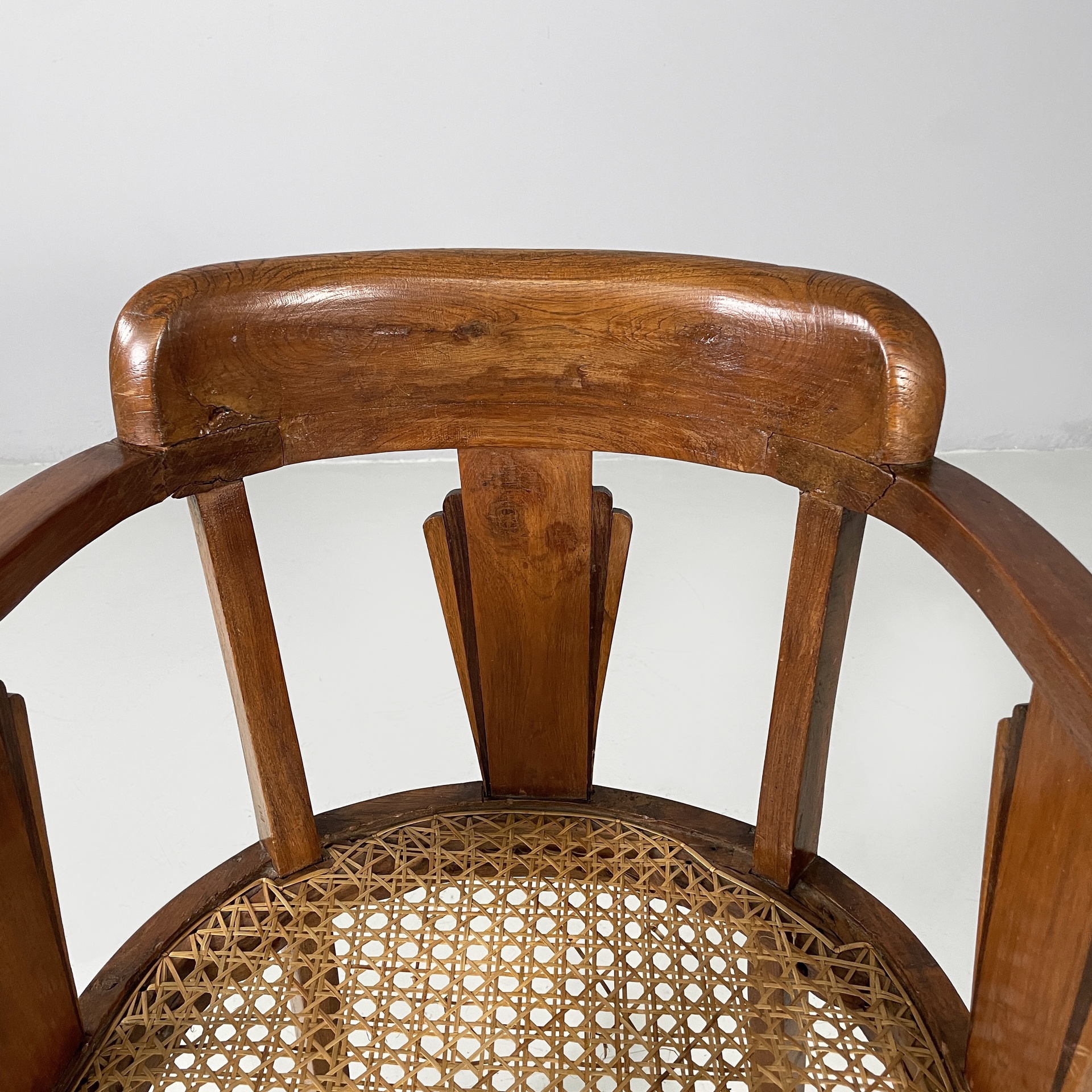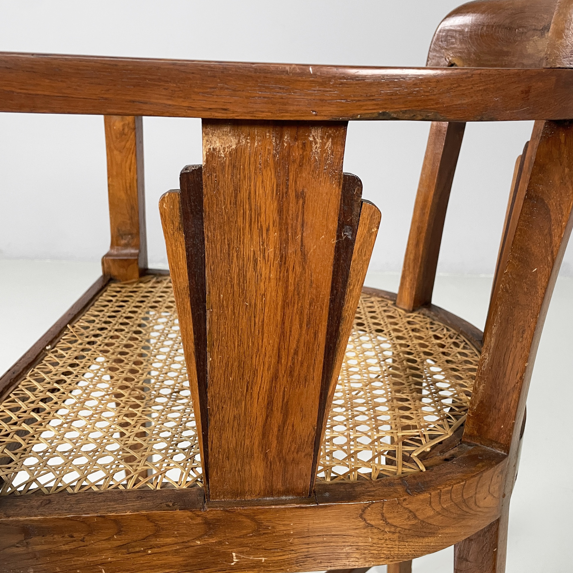 Sedia a pozzetto con seduta in paglia. Lo schienale, i braccioli e le zampe sono in legno. In stile Art Nouveau-Liberty.