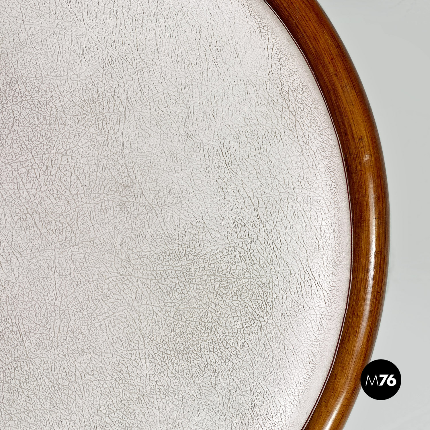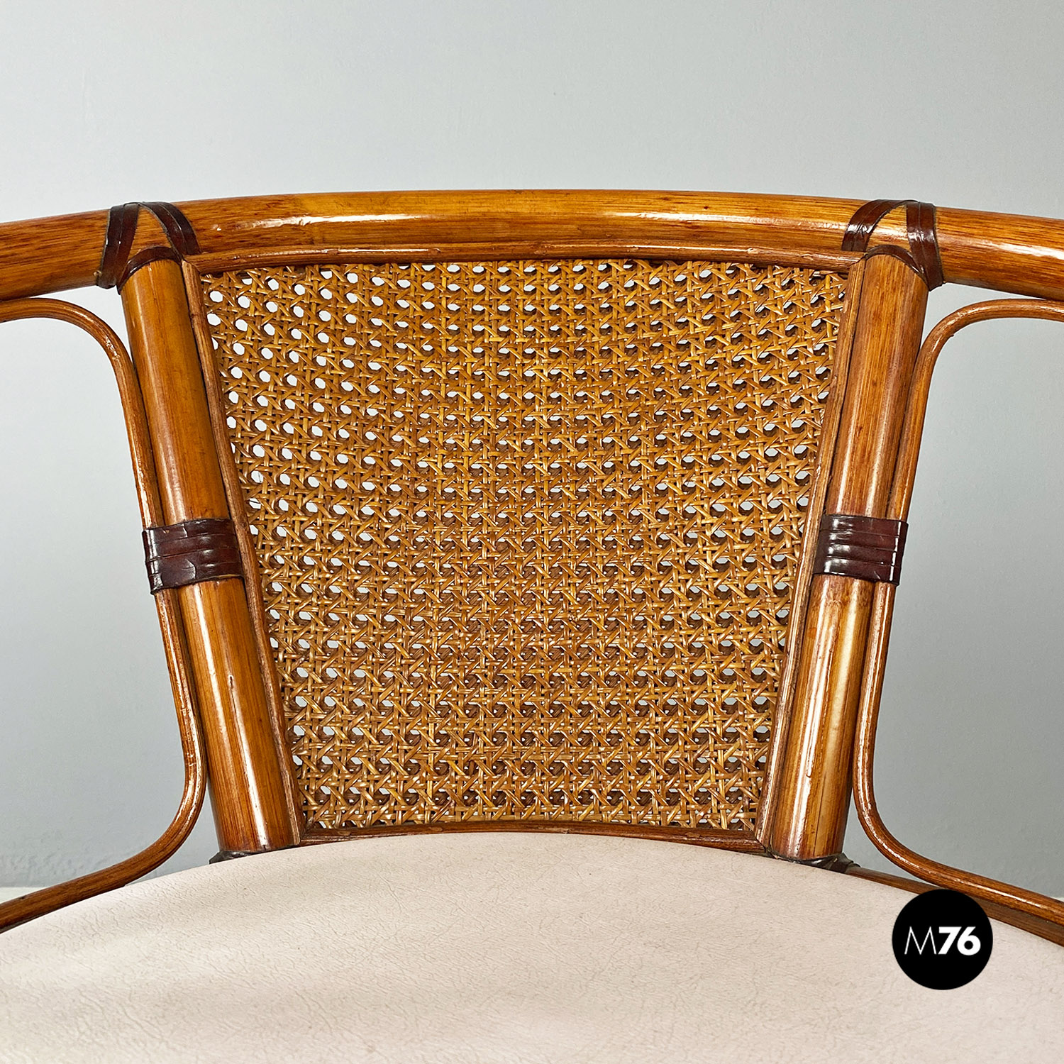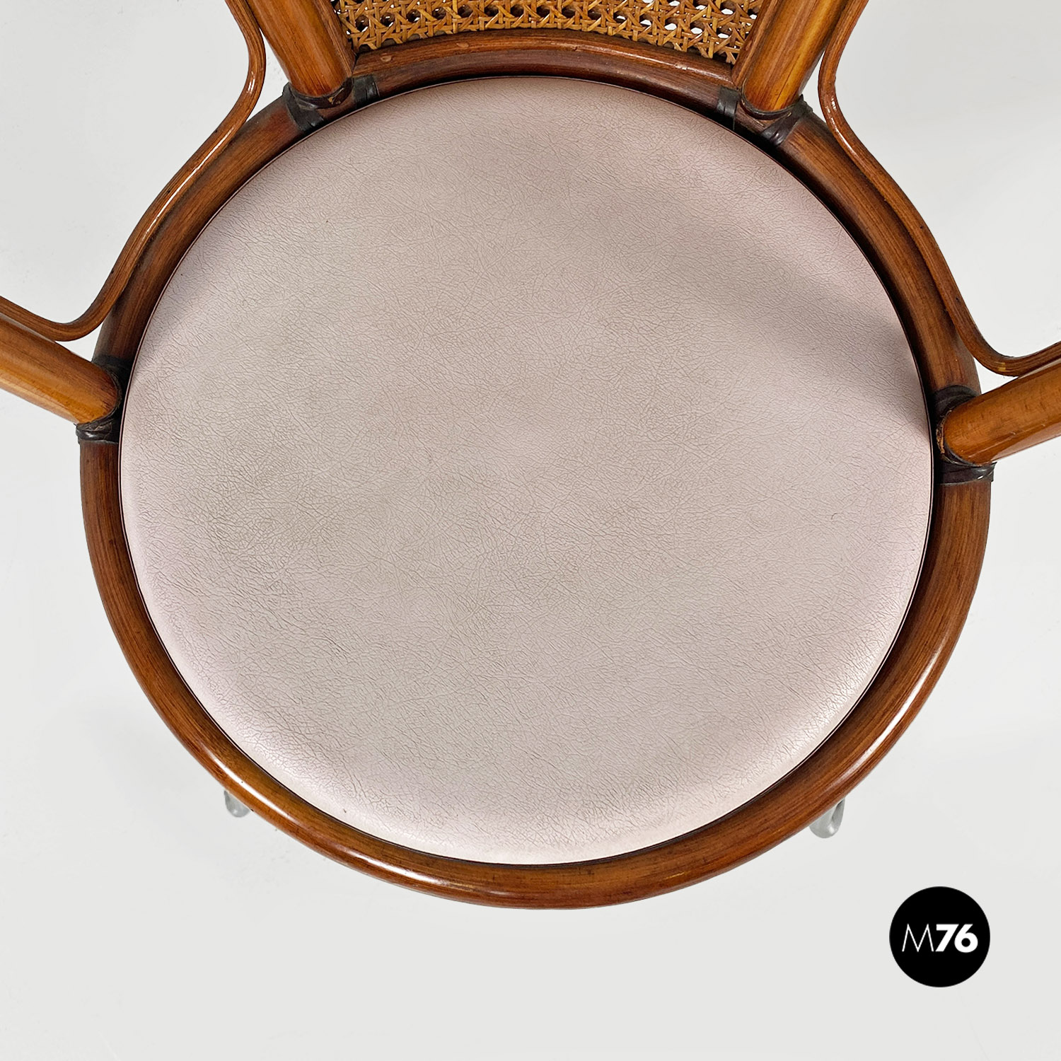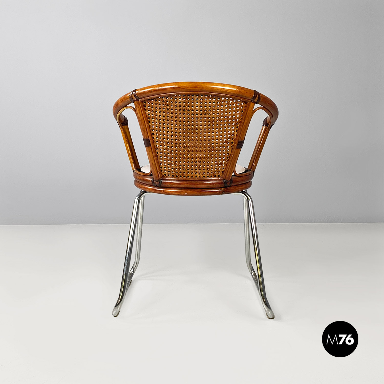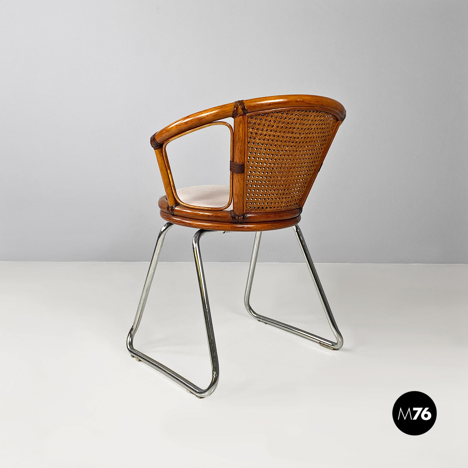 Sedia a pozzetto con seduta e schienale in paglia di Vienna e legno curvato. Sulla seduta è presente un cuscino tondo bianco. Braccioli presenti. Le gambe dalla forma trapezoidale sono in tubolare di metallo cromato.