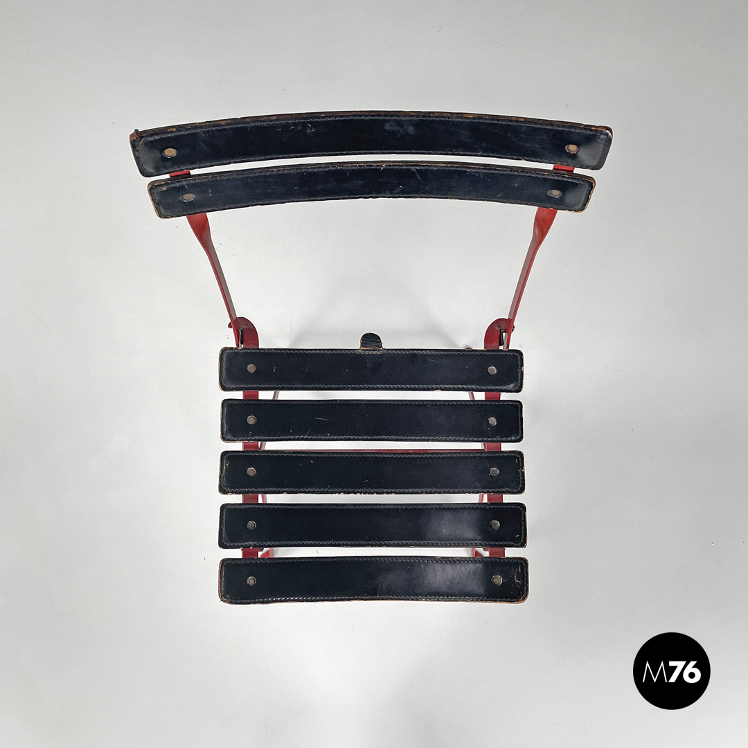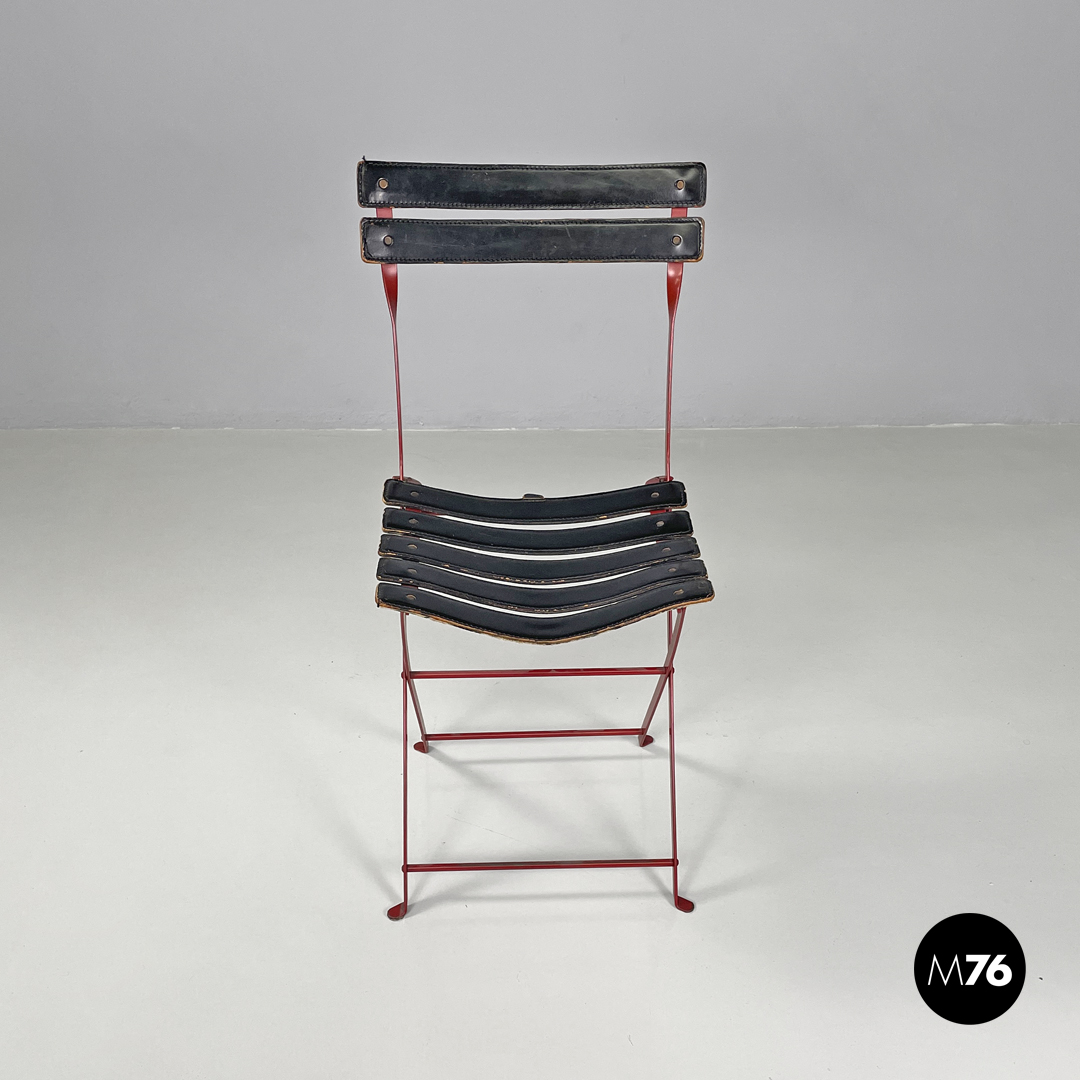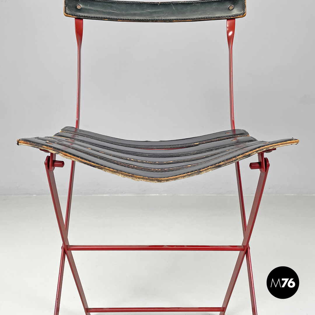 Sedia modello Celestina pieghevole. La struttura in metallo è verniciata di rosso lo schienale e la seduta sono formati da fasce rivestite di pelle nera.