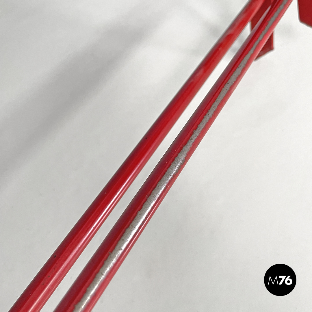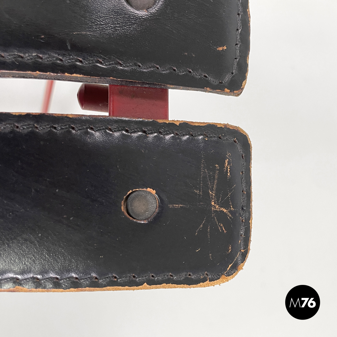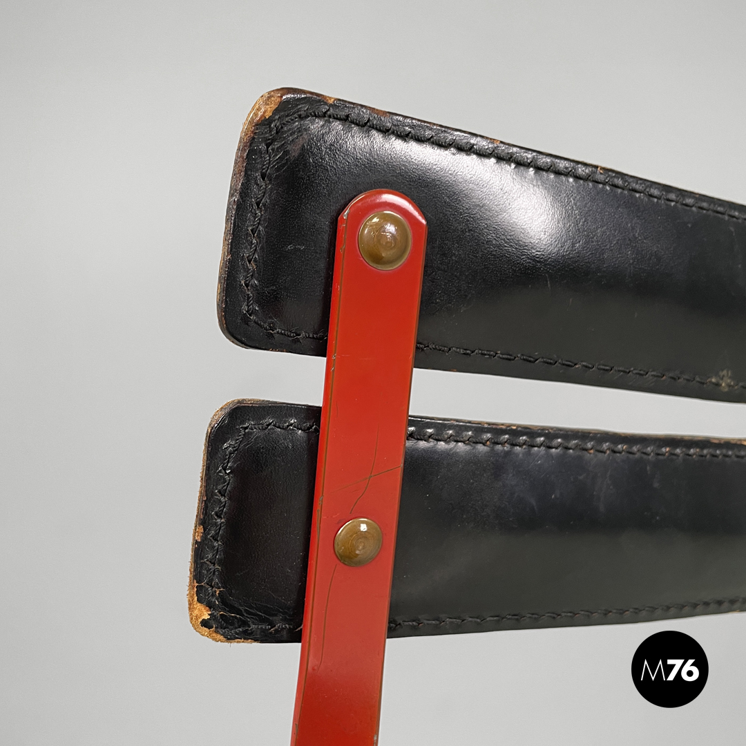 Sedia modello Celestina pieghevole. La struttura in metallo è verniciata di rosso lo schienale e la seduta sono formati da fasce rivestite di pelle nera.