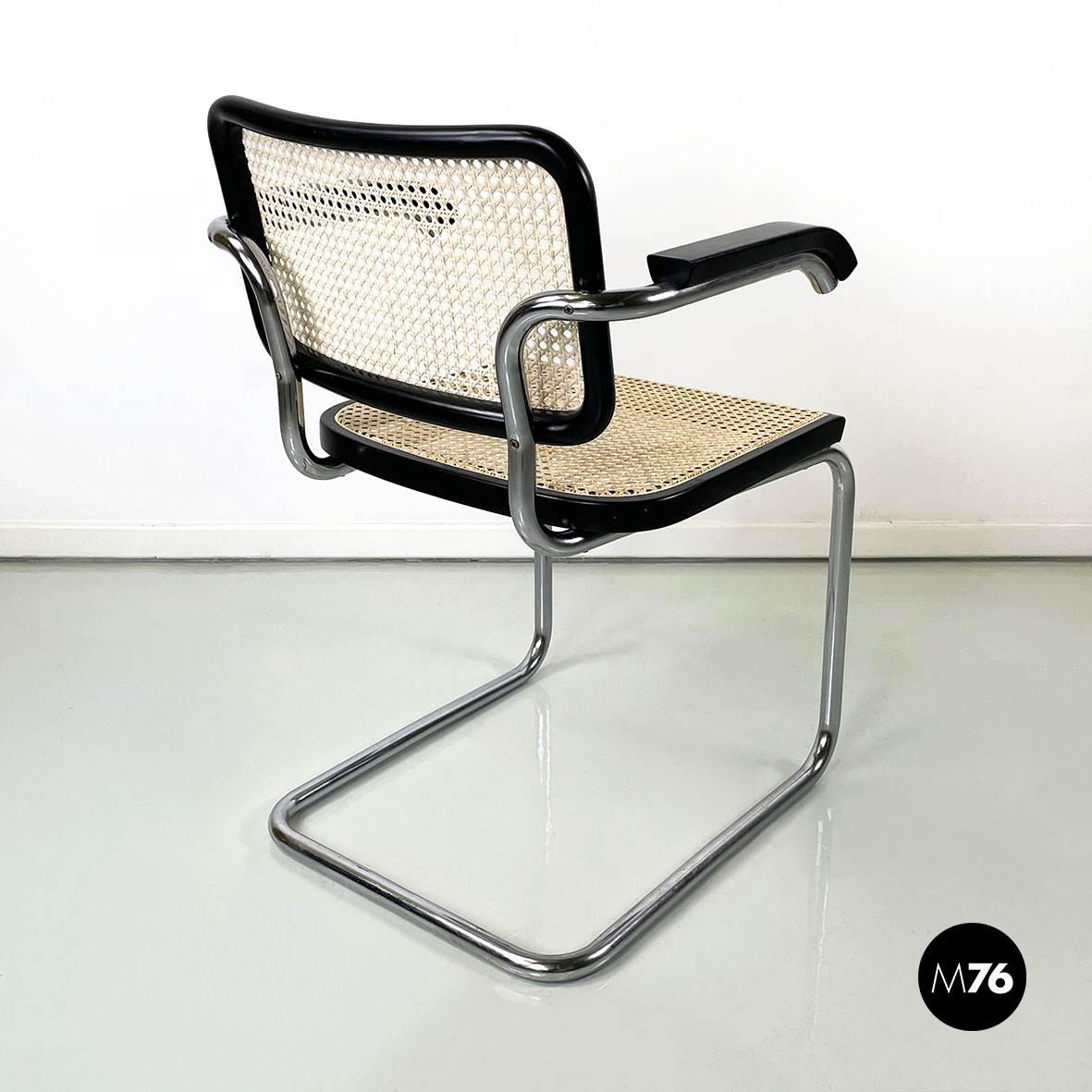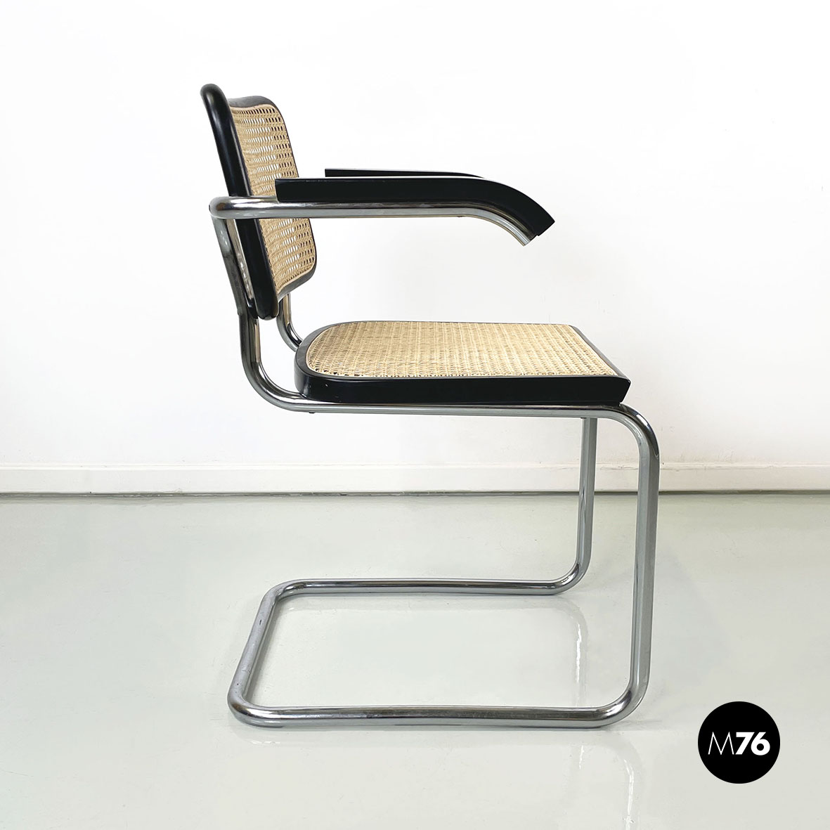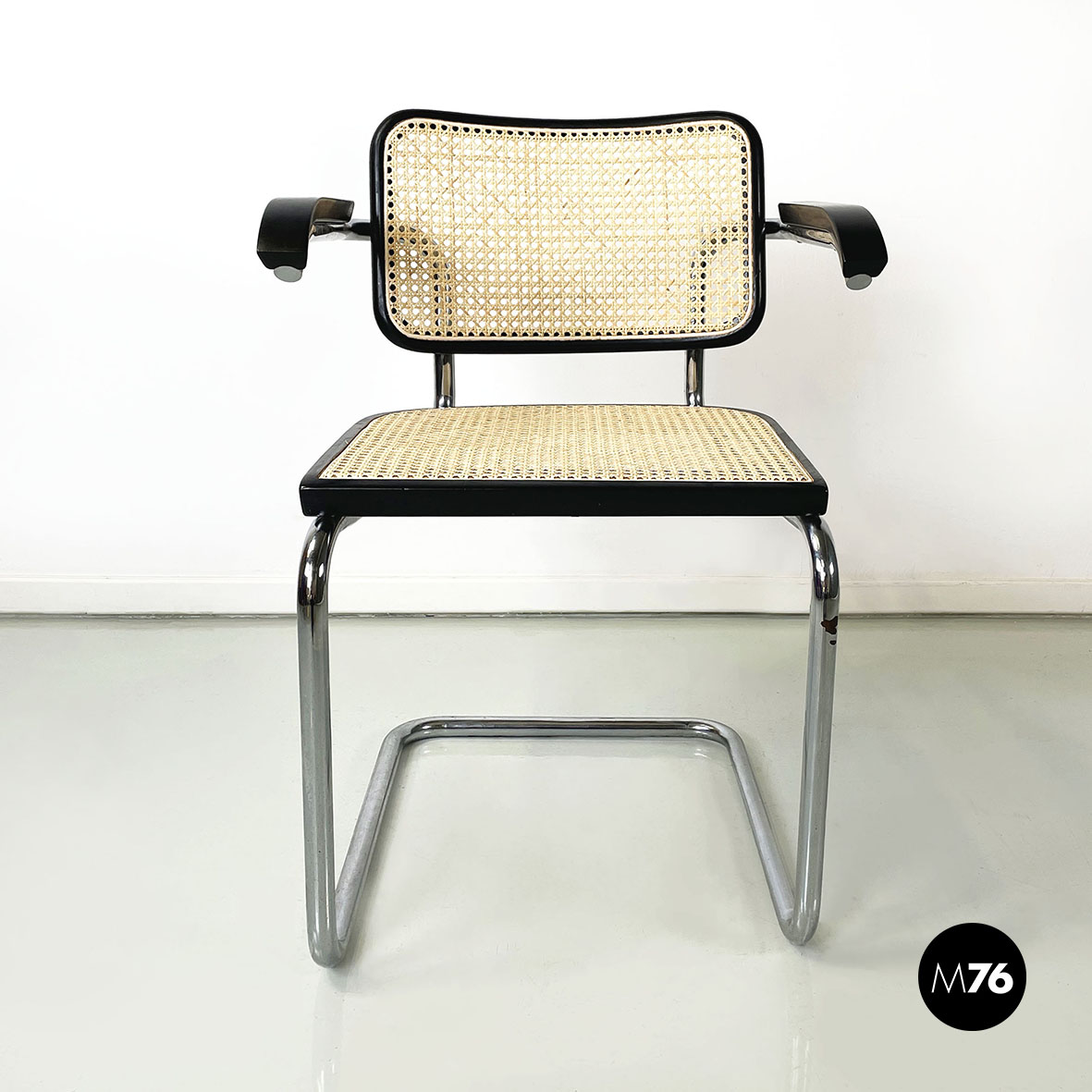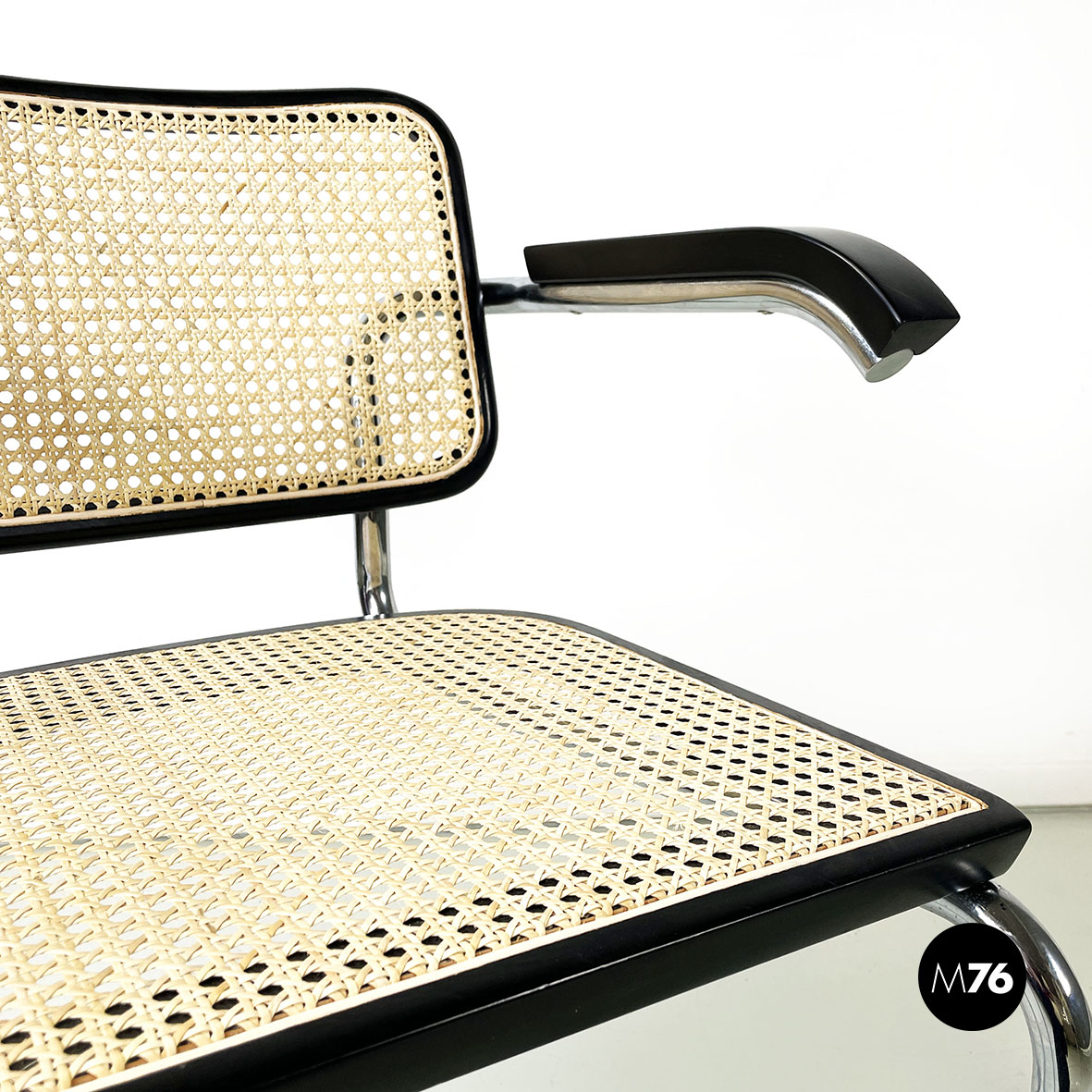 Sedia con braccioli modello Cesca  con seduta e schienale in paglia chiara di Vienna e profili in legno verniciato nero. La struttura è in tubolare d’acciaio. I braccioli sono in legno verniciato nero.
