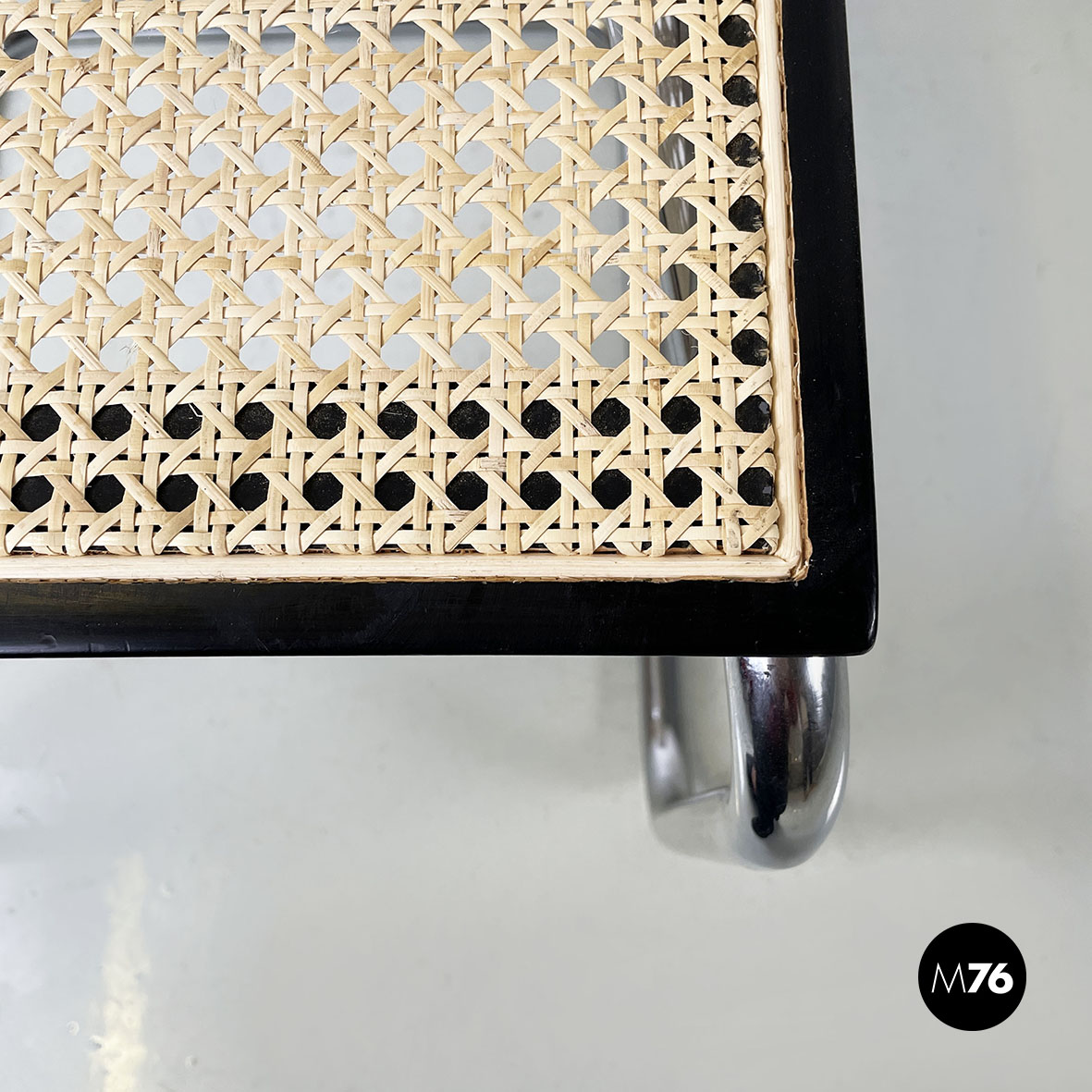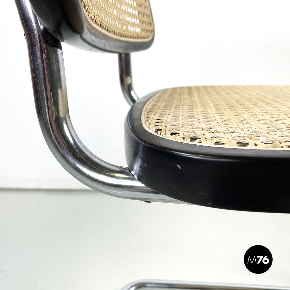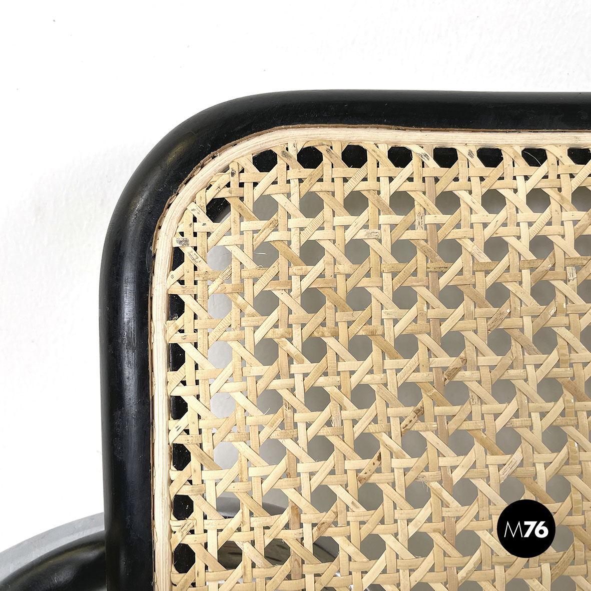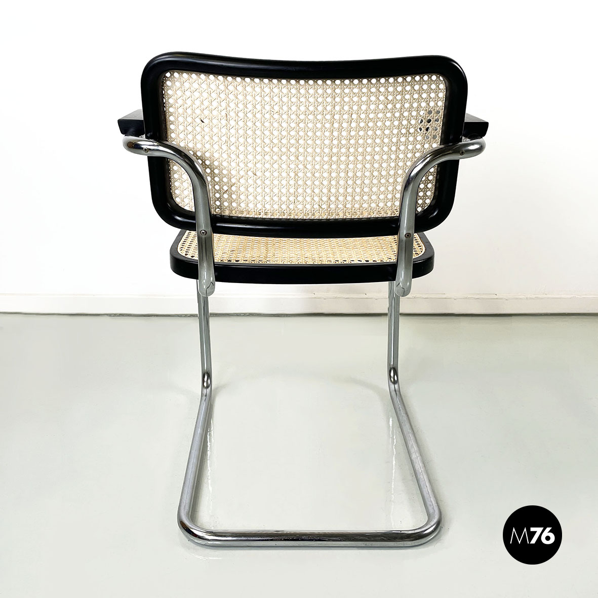 Sedia con braccioli modello Cesca  con seduta e schienale in paglia chiara di Vienna e profili in legno verniciato nero. La struttura è in tubolare d’acciaio. I braccioli sono in legno verniciato nero.