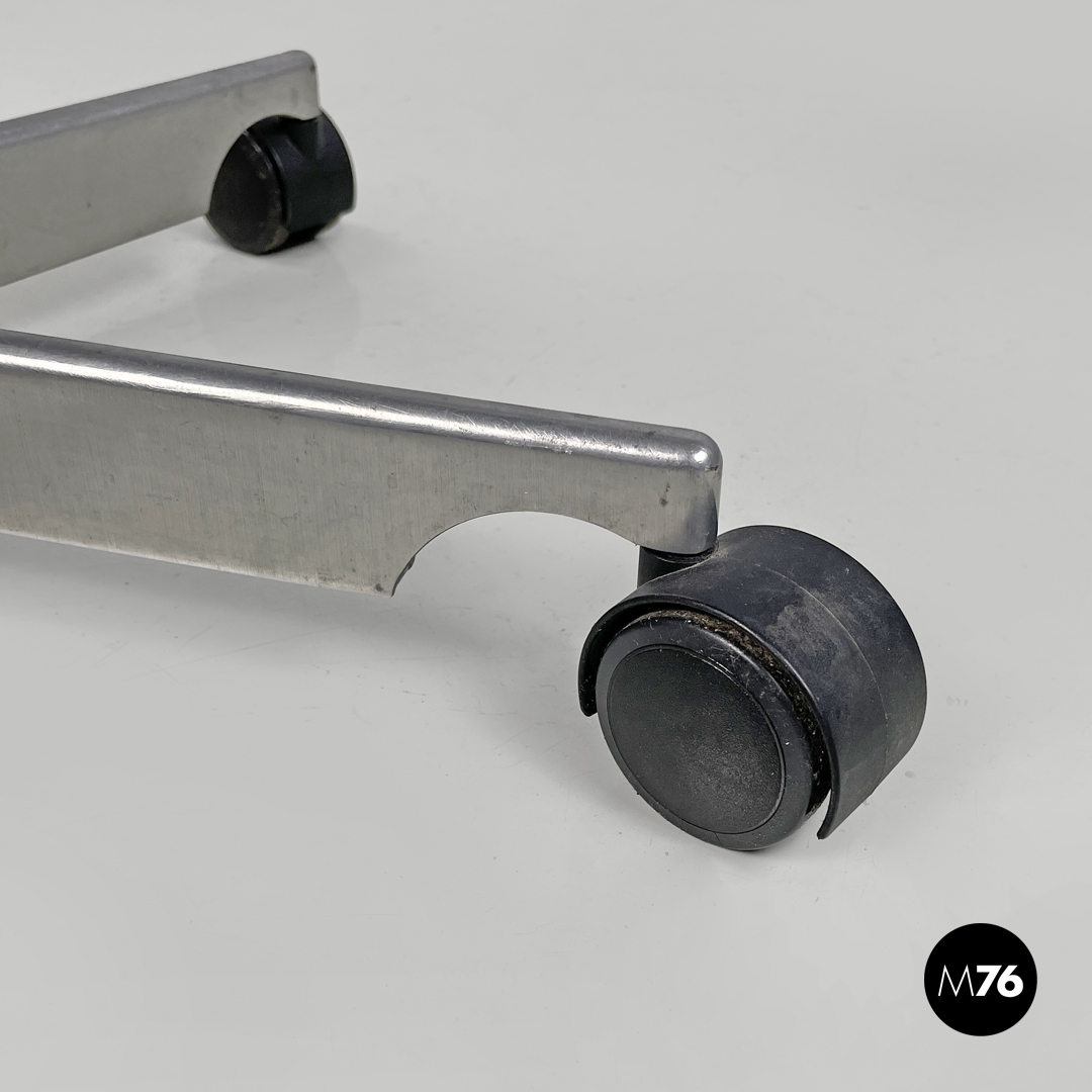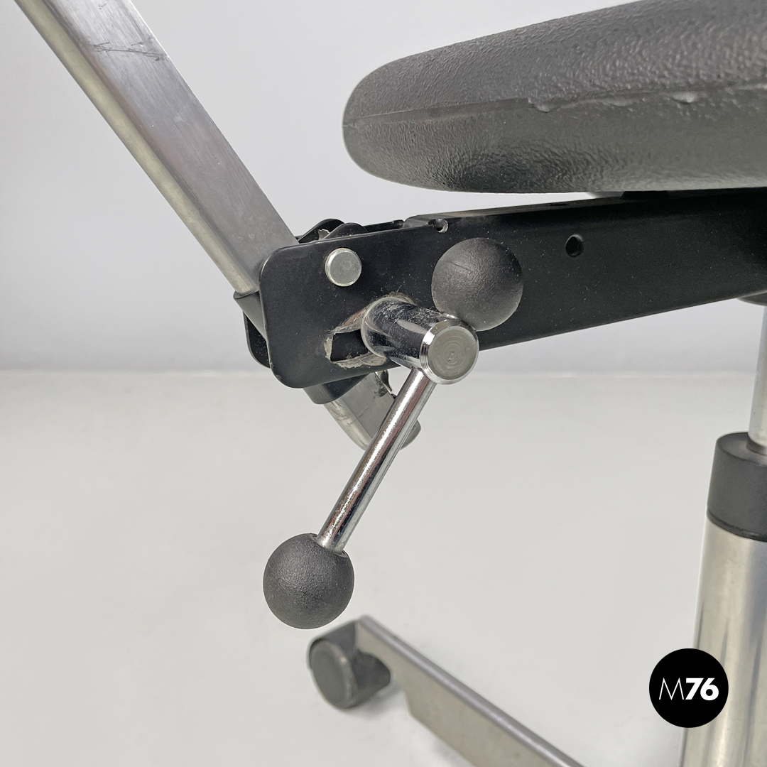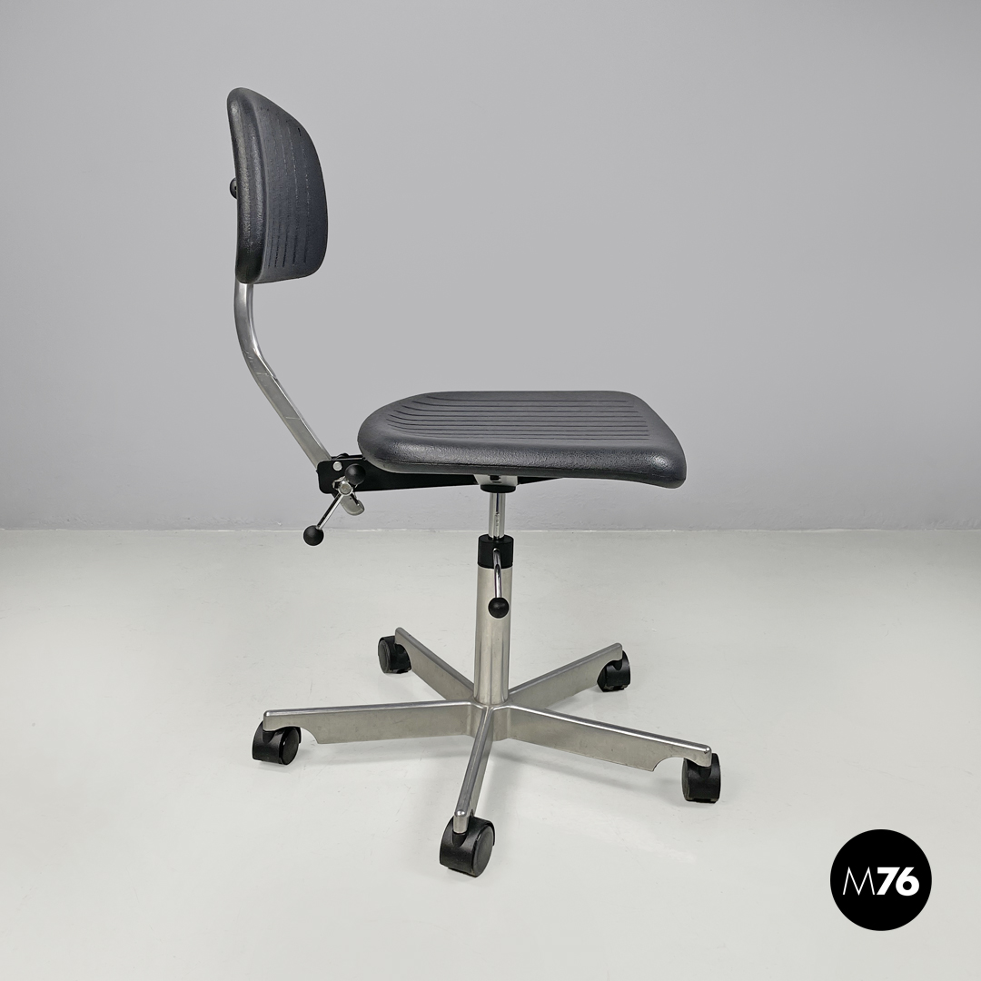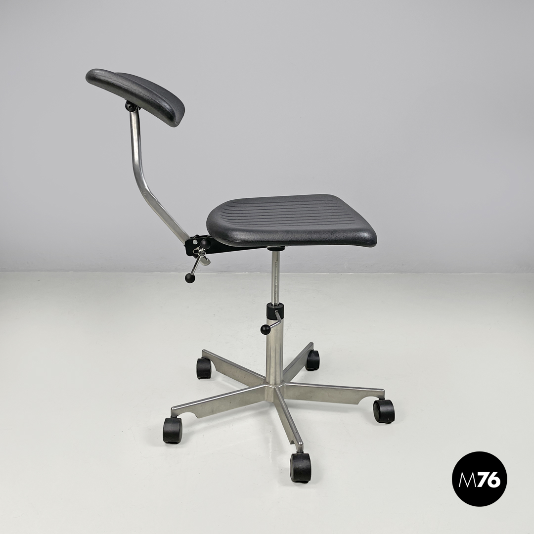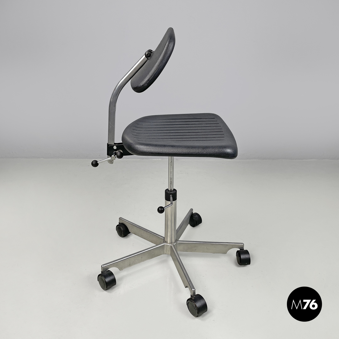 Sedia da ufficio con ruote e struttura in metallo. La seduta e lo schienali tondeggianti sono in gomma nera con scanalature verticali e texture “a puntini”. Lo schienale è modulabile grazie ad un meccanismo sotto la seduta è modificabile anche l’altezza sempre tramite un meccanismo sullo stelo centrale. Con cinque razze che terminano con ruote in plastica nera.