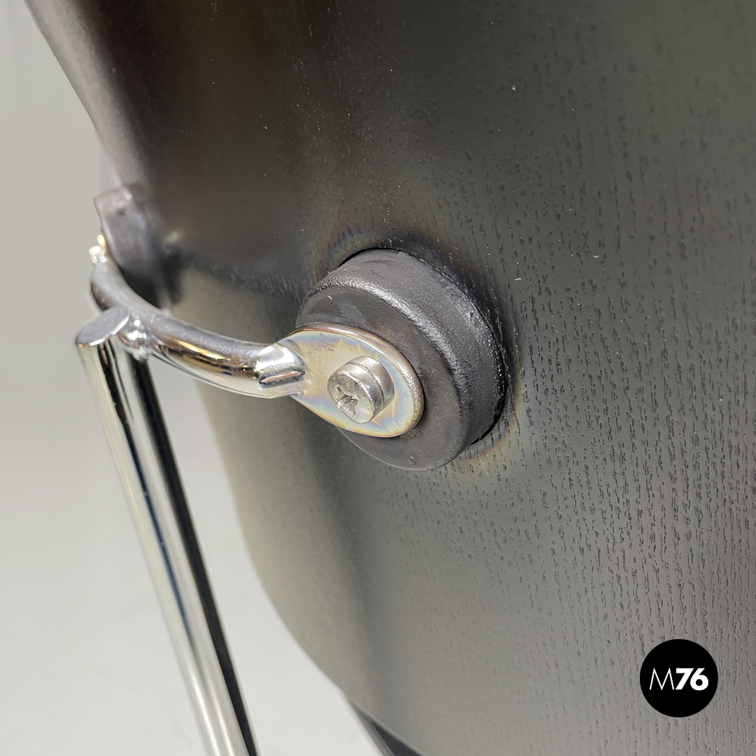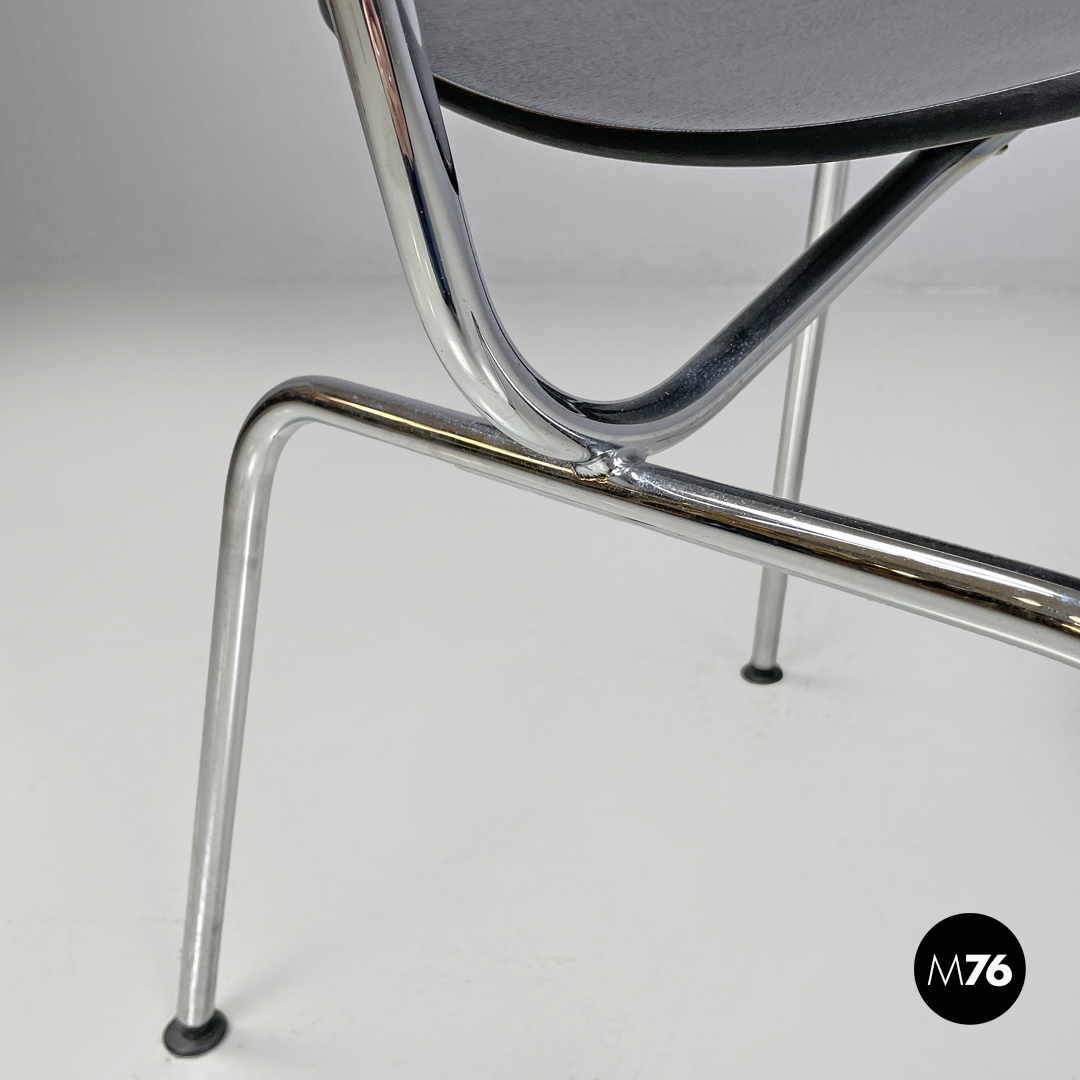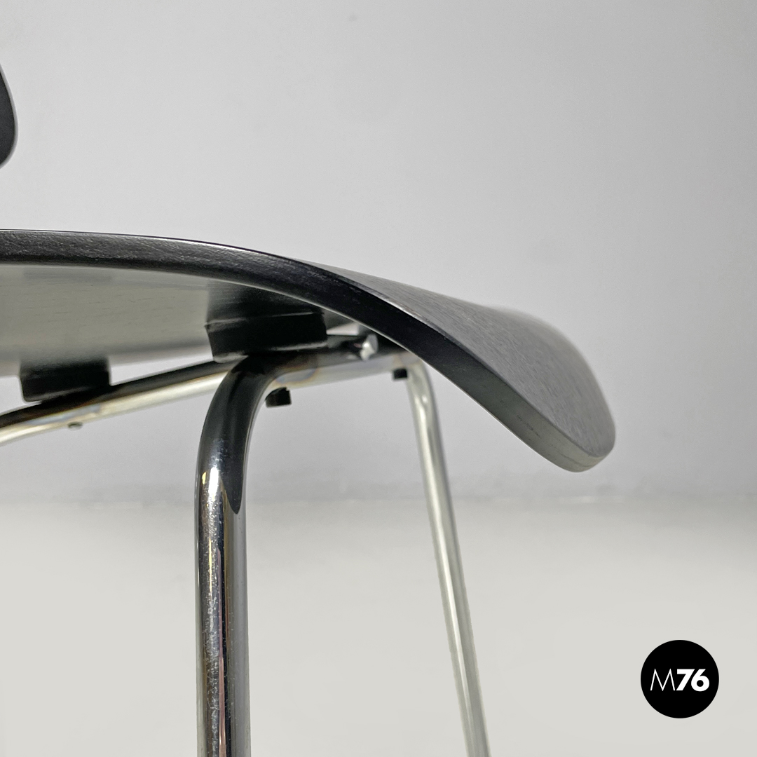 Sedia modello DCM in legno nero. La seduta e lo schienale sono stondati con lati avvolgenti la struttura è in tondino di metallo cromato. Con quattro piedini in plastica nera.