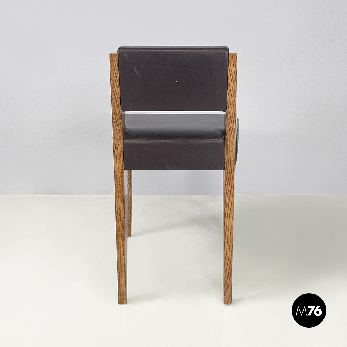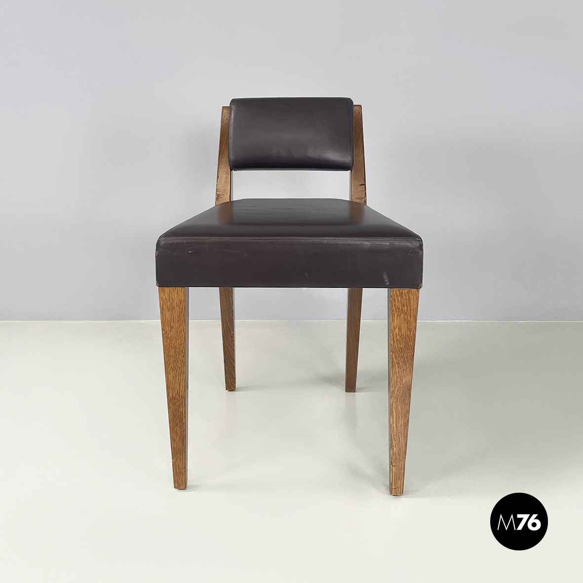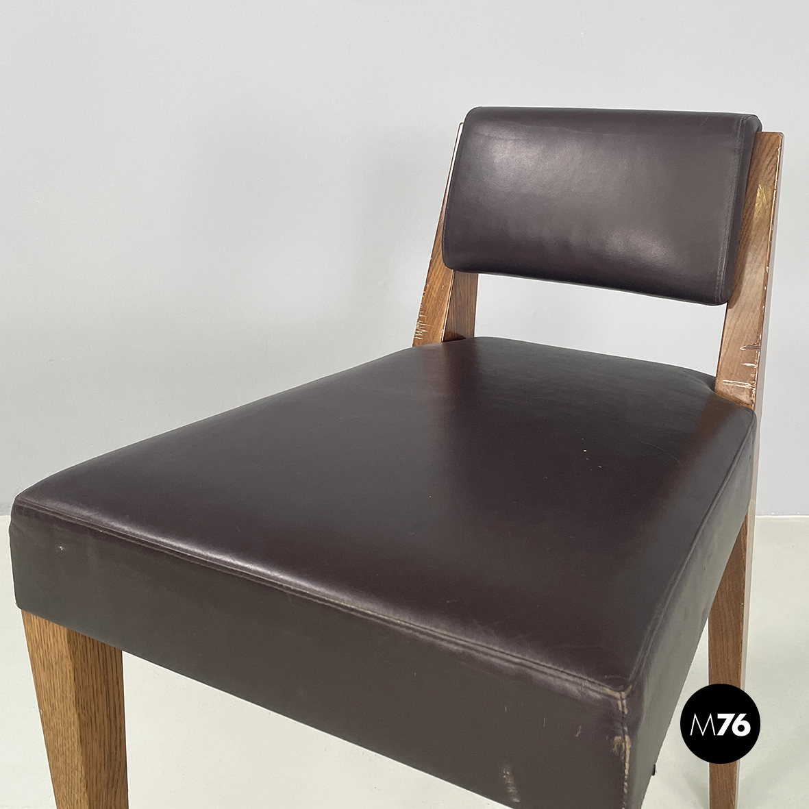 Sedia con seduta e schienale squadrati imbottiti e rivestiti in pelle marrone scuro. La struttura a sezione quadrata è in legno.