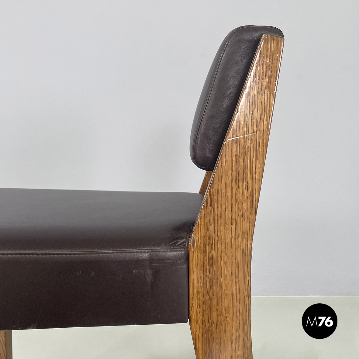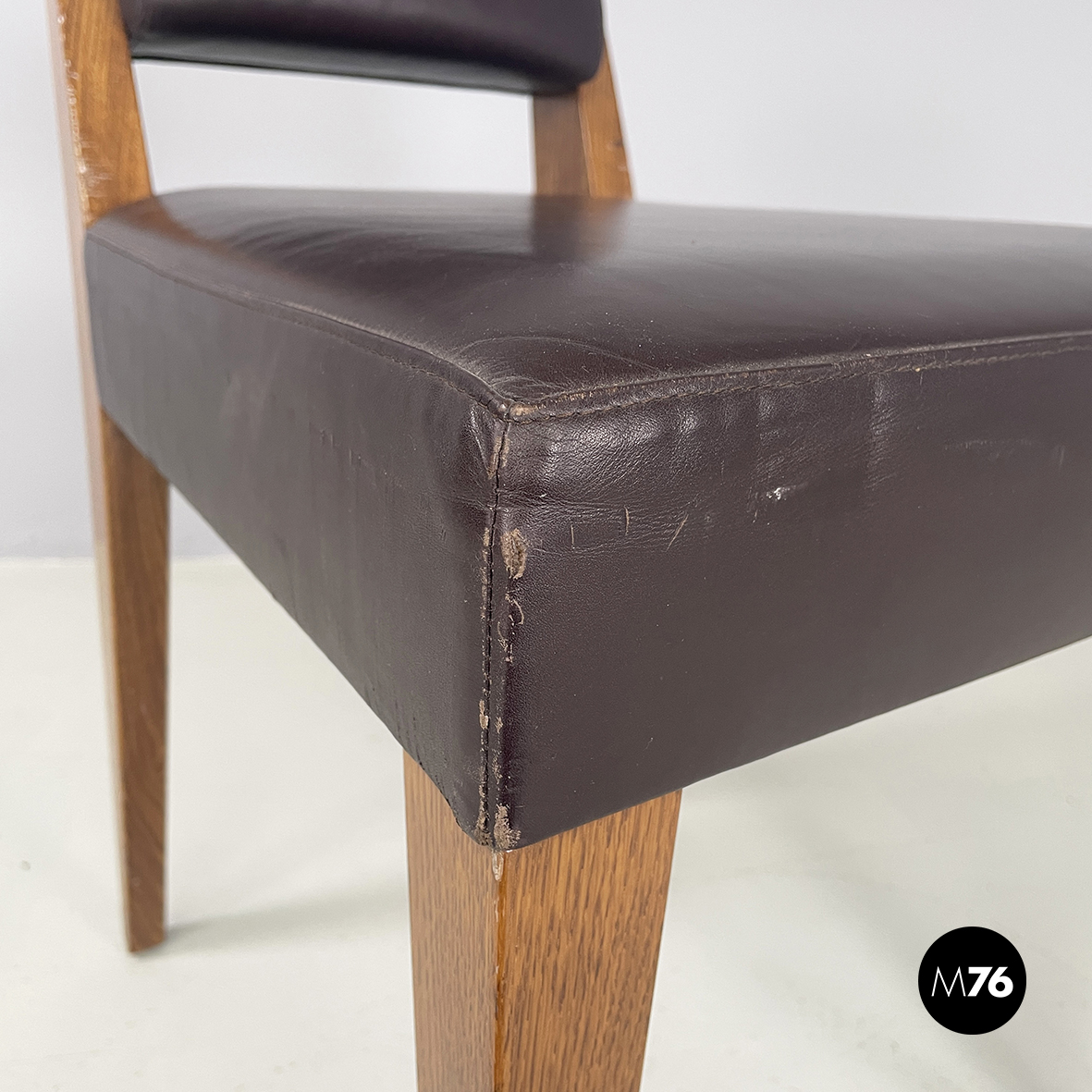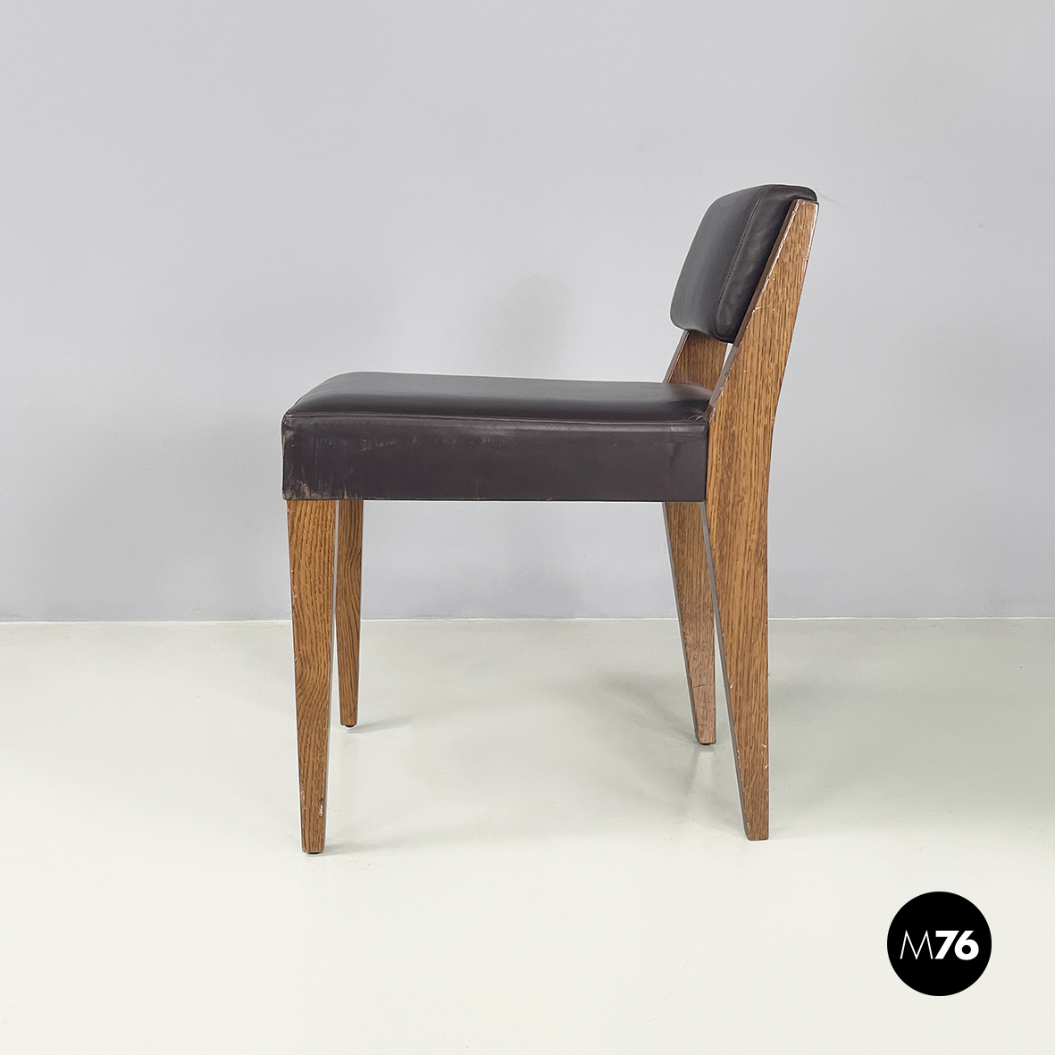 Sedia con seduta e schienale squadrati imbottiti e rivestiti in pelle marrone scuro. La struttura a sezione quadrata è in legno.