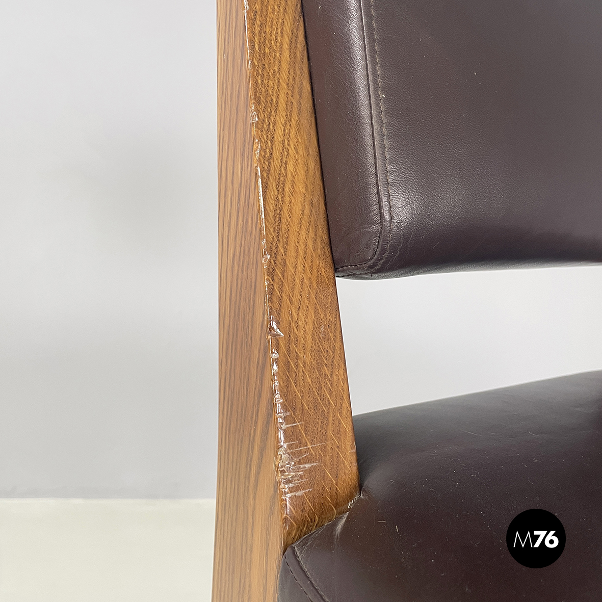 Discrete condizioni. La pelle presenta segni sparsi dati dall’utilizzo. Il legno presenta dei segni sullo schienale e alla fine delle zampe.