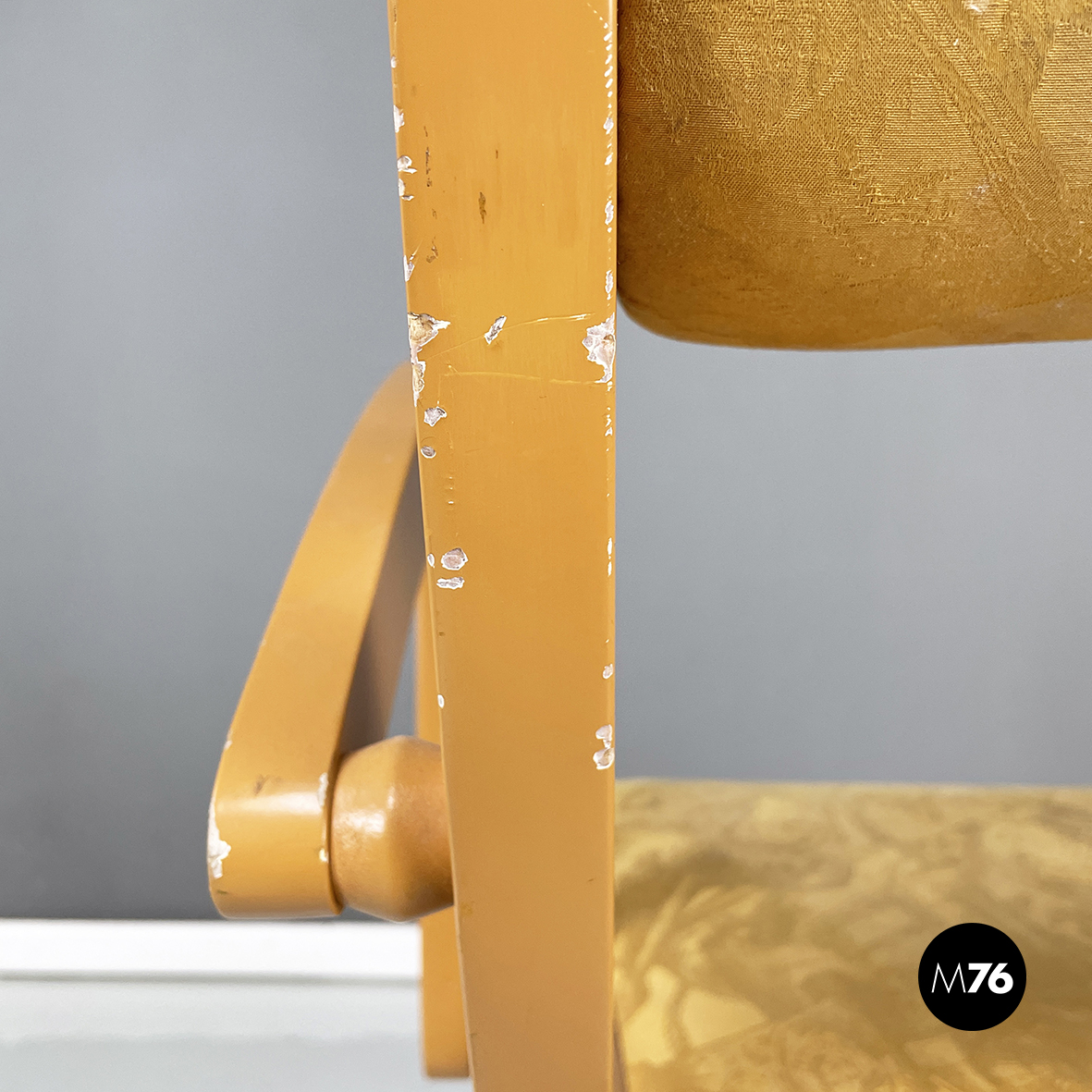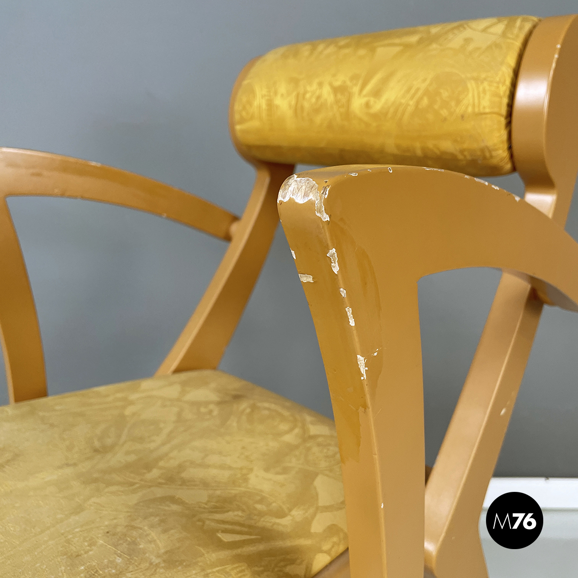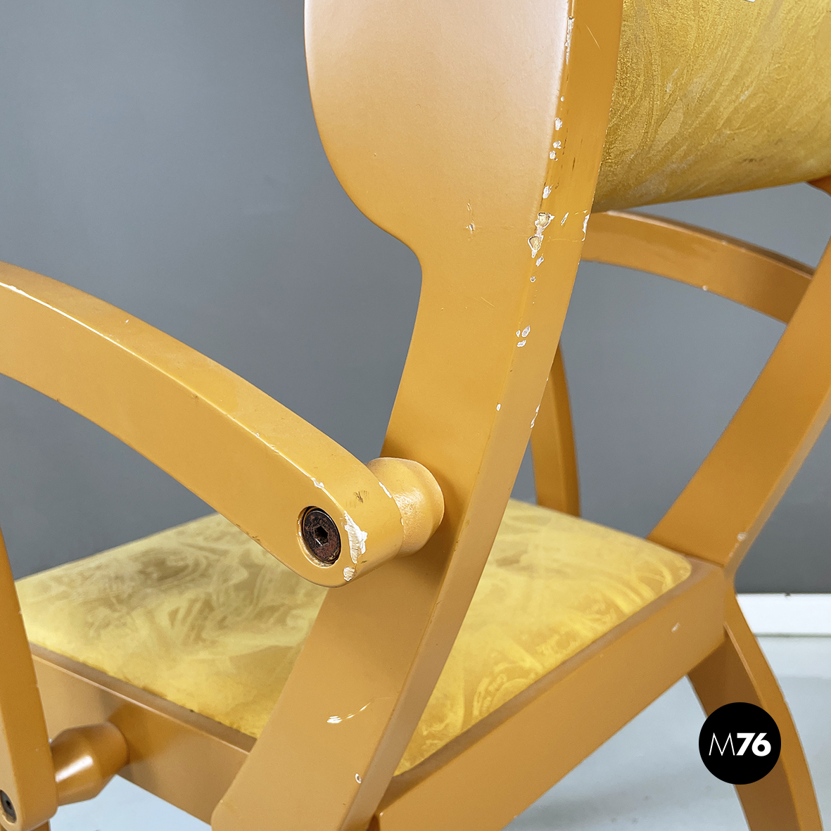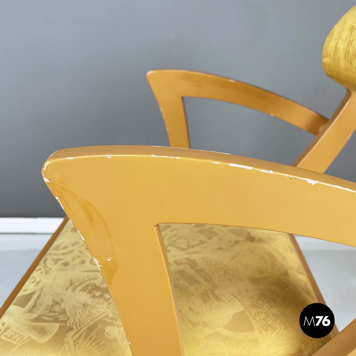 Sedia con struttura in legno verniciato giallo. Lo schienale imbottito e rivestito in tessuto giallo lavorato è di forma cilindrica. La seduta squadrata è anche essa imbottita e rivestita in tessuto lavorato giallo. Braccioli triangolai presenti.