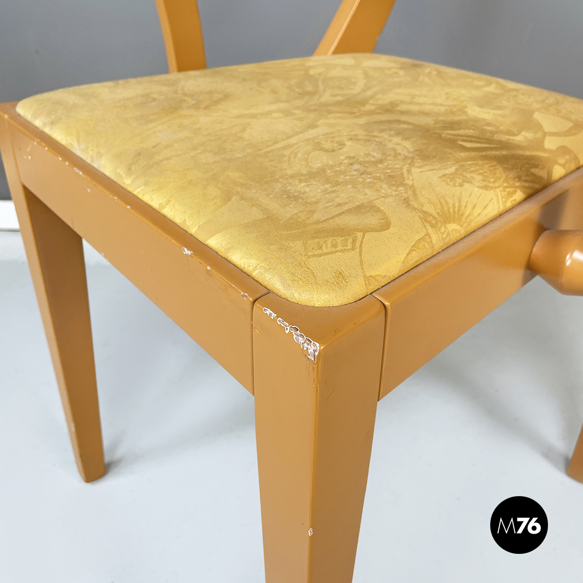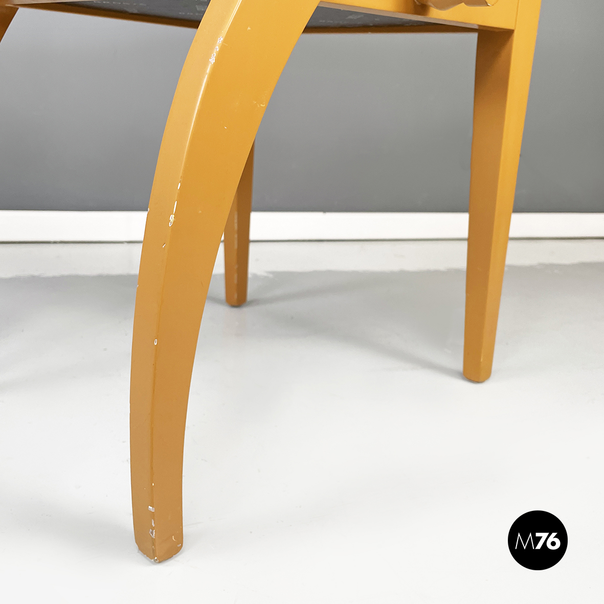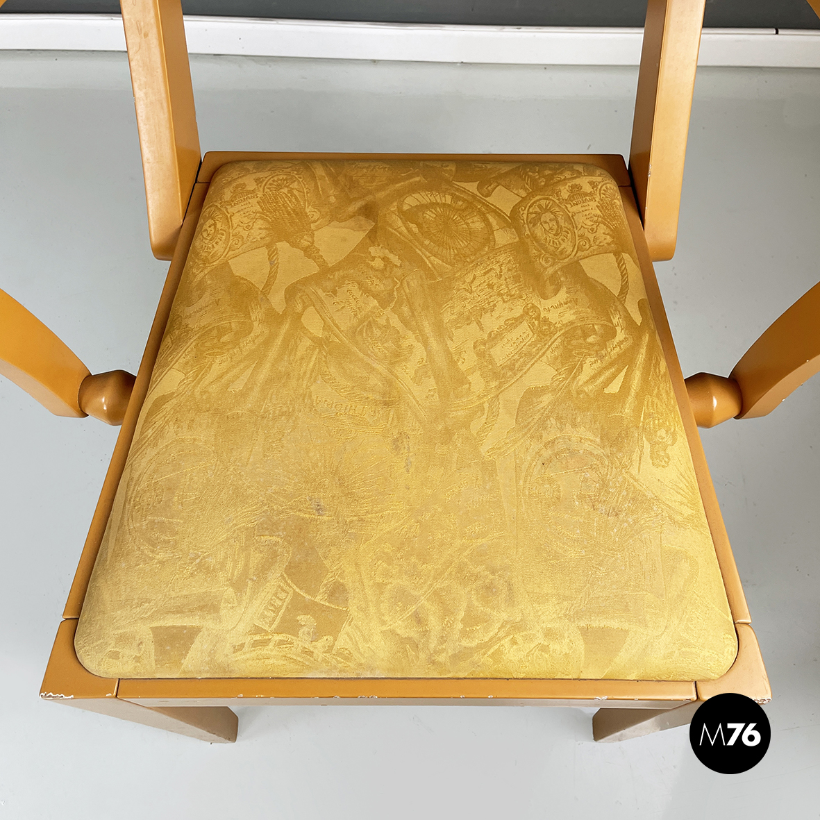 Sedia con struttura in legno verniciato giallo. Lo schienale imbottito e rivestito in tessuto giallo lavorato è di forma cilindrica. La seduta squadrata è anche essa imbottita e rivestita in tessuto lavorato giallo. Braccioli triangolai presenti.