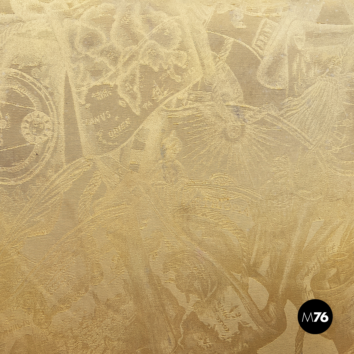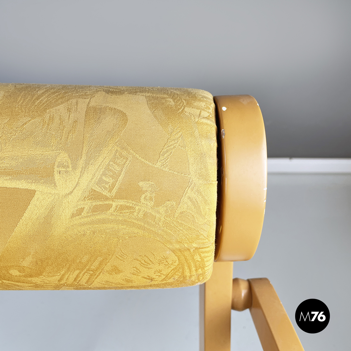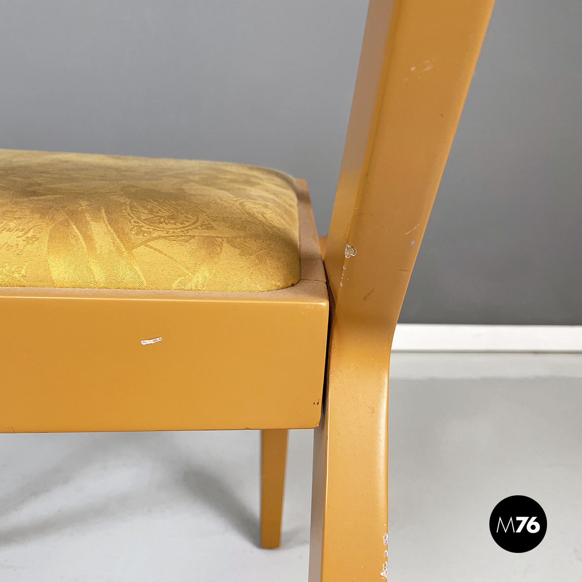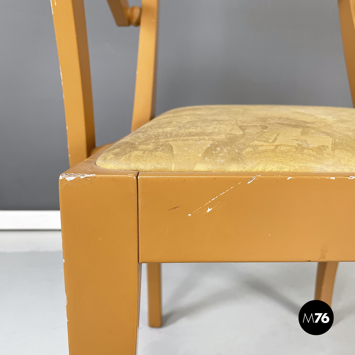 Sedia con struttura in legno verniciato giallo. Lo schienale imbottito e rivestito in tessuto giallo lavorato è di forma cilindrica. La seduta squadrata è anche essa imbottita e rivestita in tessuto lavorato giallo. Braccioli triangolai presenti.