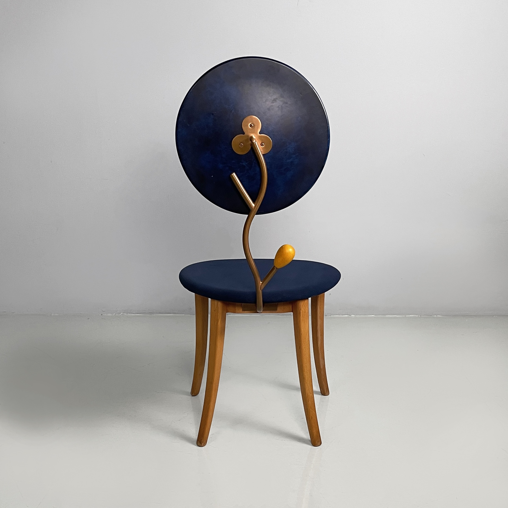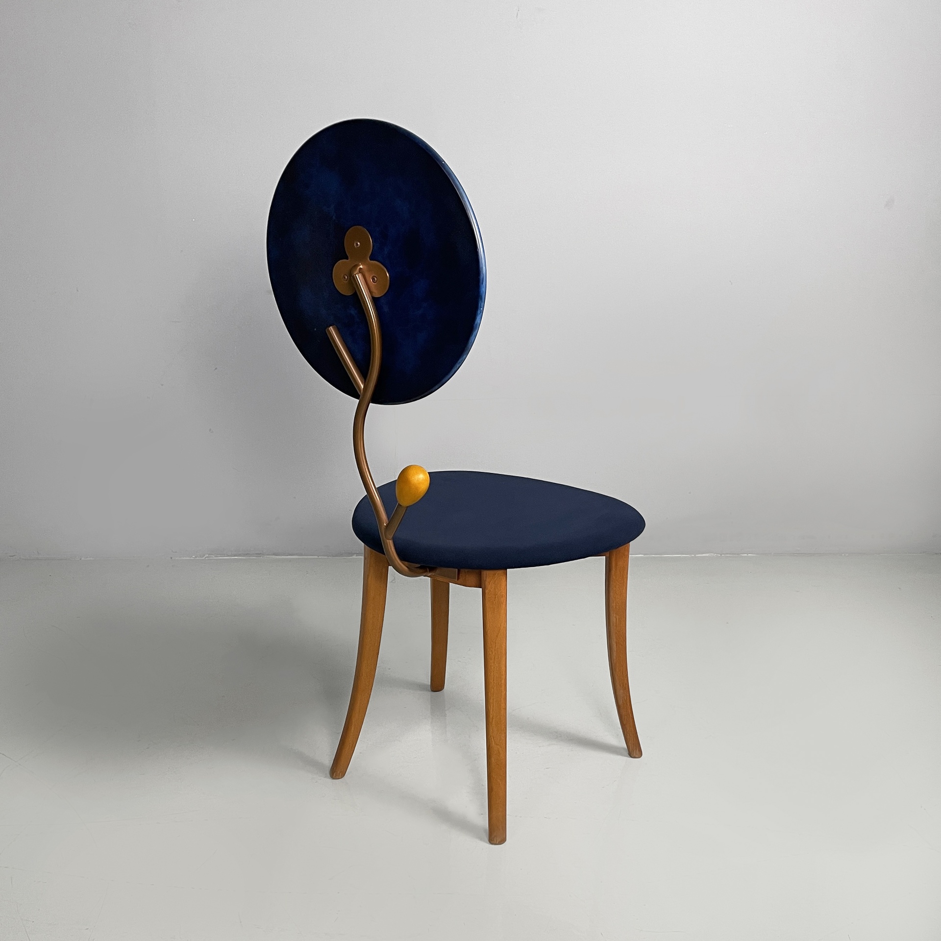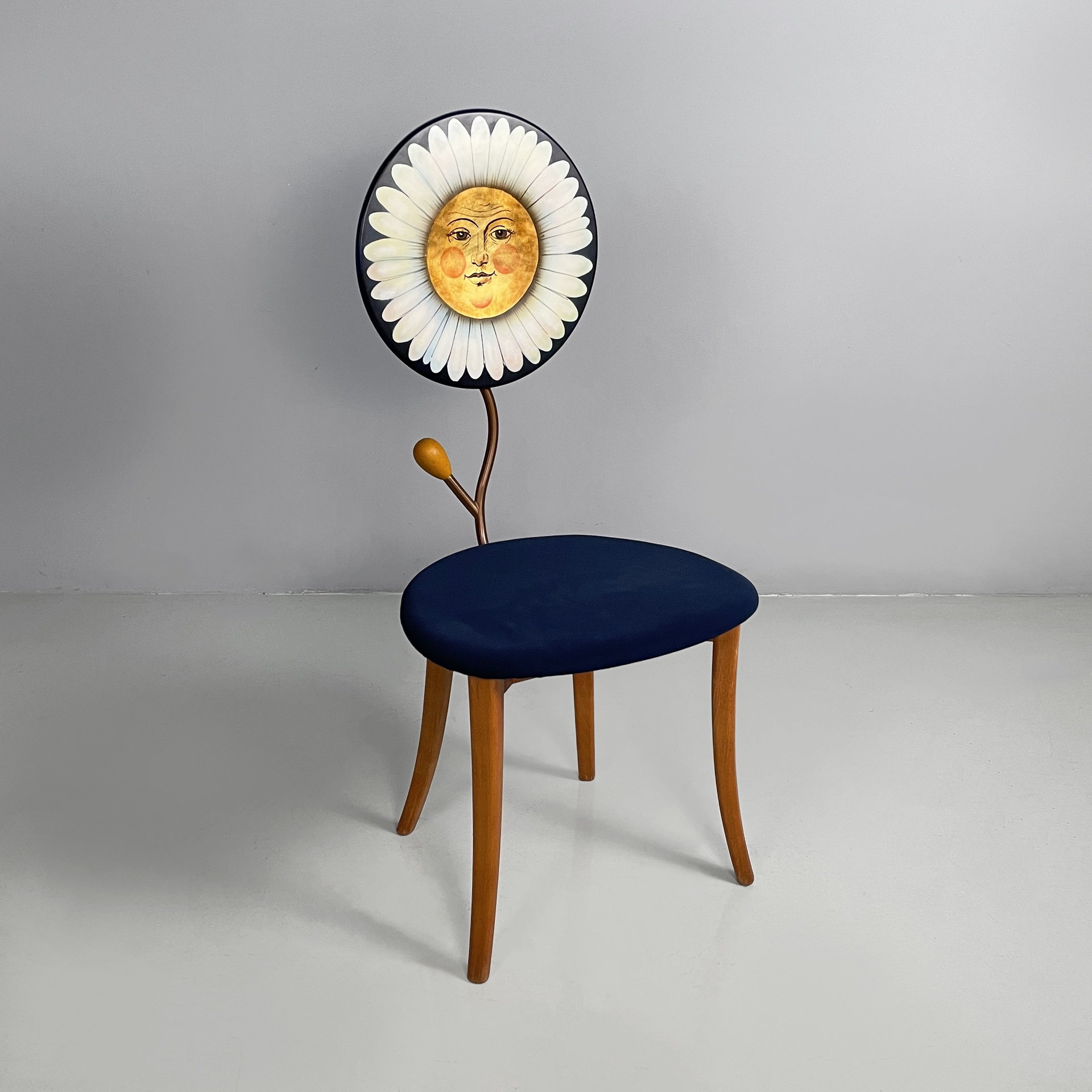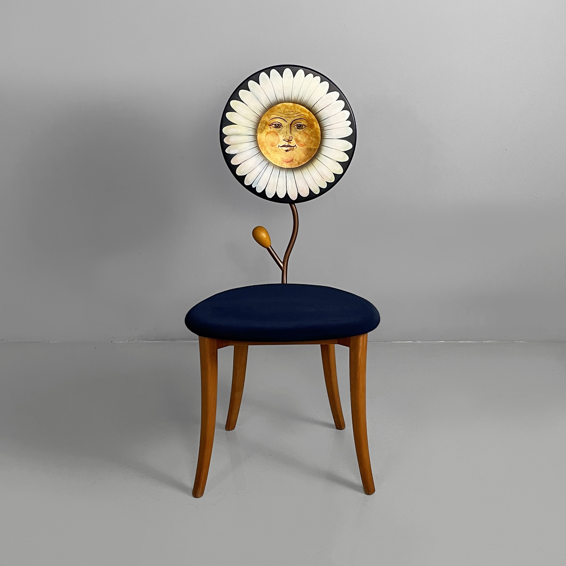 Sedia in legno chiaro, metallo e tessuto blu. Lo schienale tondo è in legno verniciato blu con disegno di margherita con al centro un volto sorridente, rifinito in foglia d’oro. La struttura dello schienale è in tondino di metallo curvato con elemento in legno decorativo. La seduta è imbottita e rivestita in tessuto blu. Le zampe a sezione squadrata son in legno.