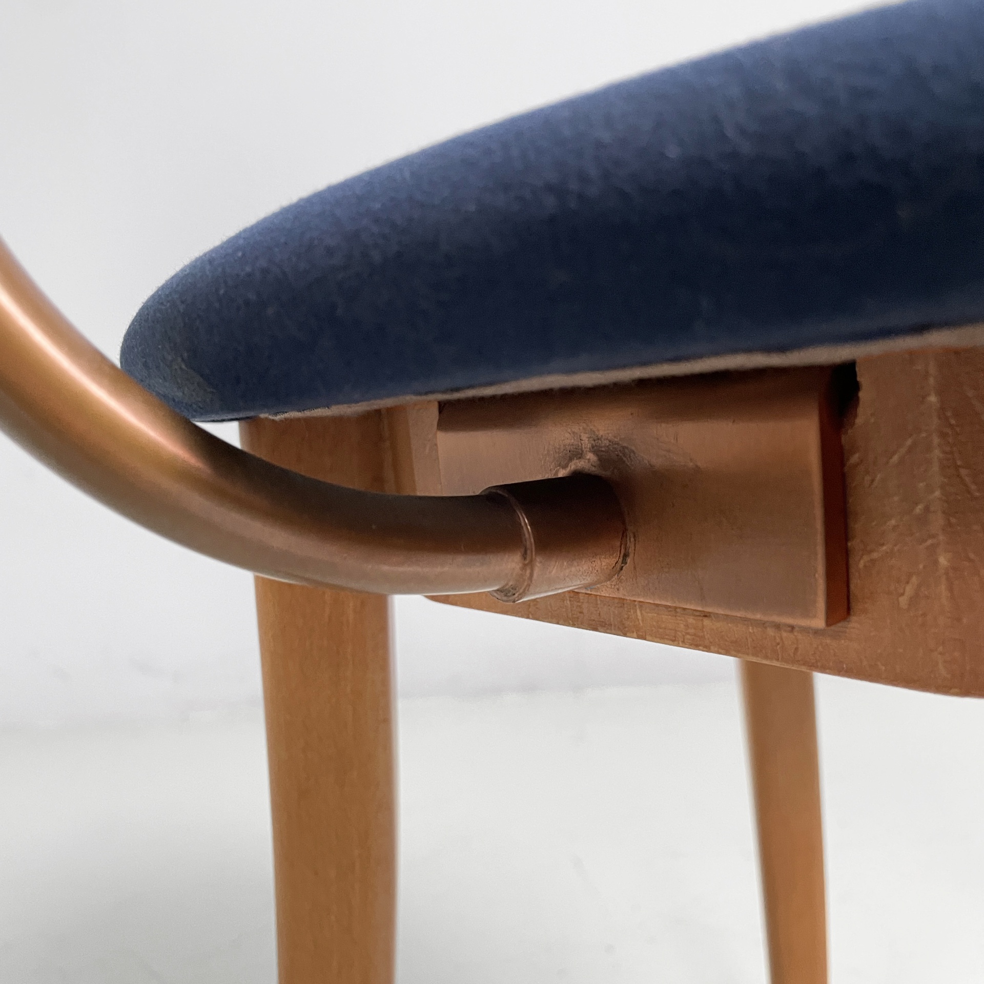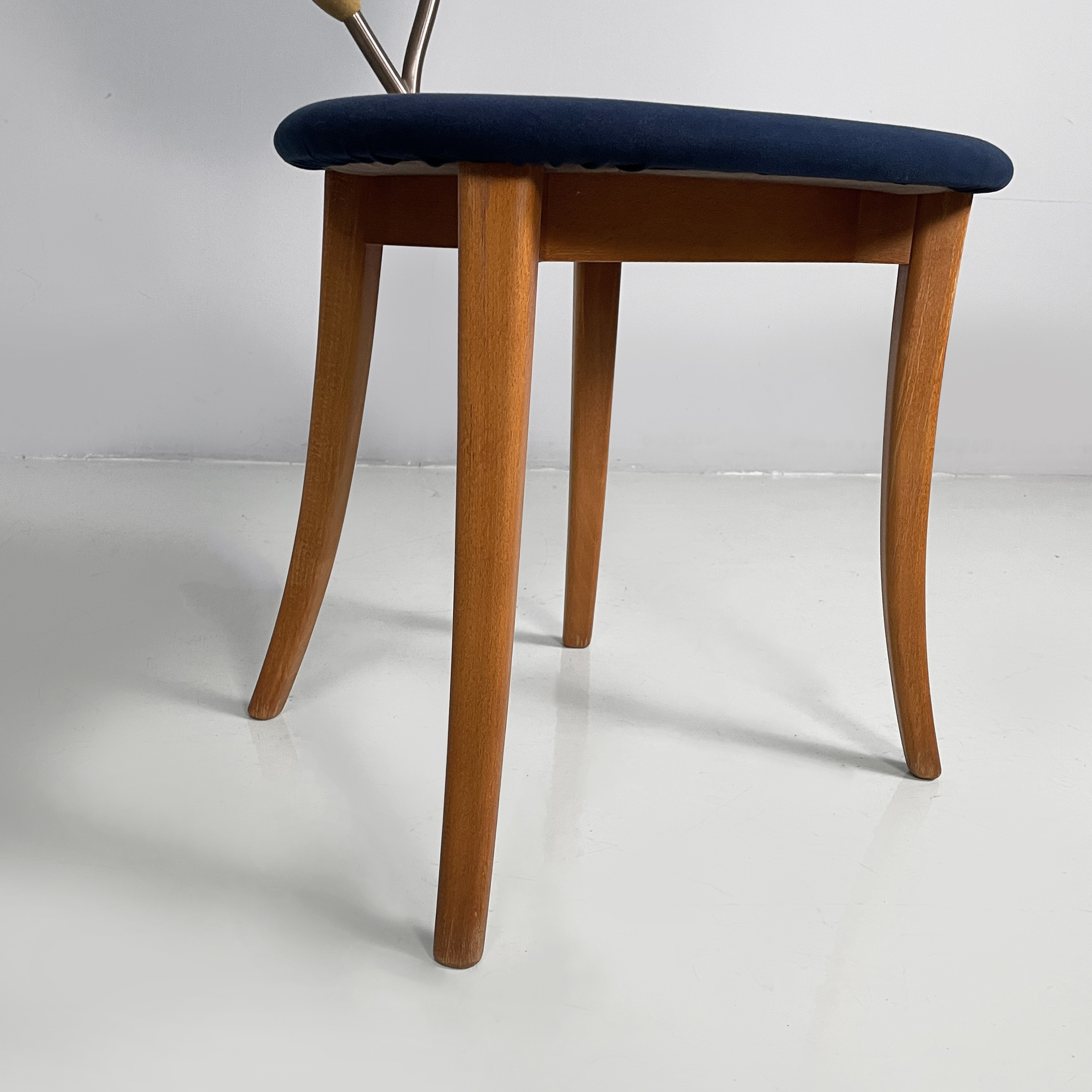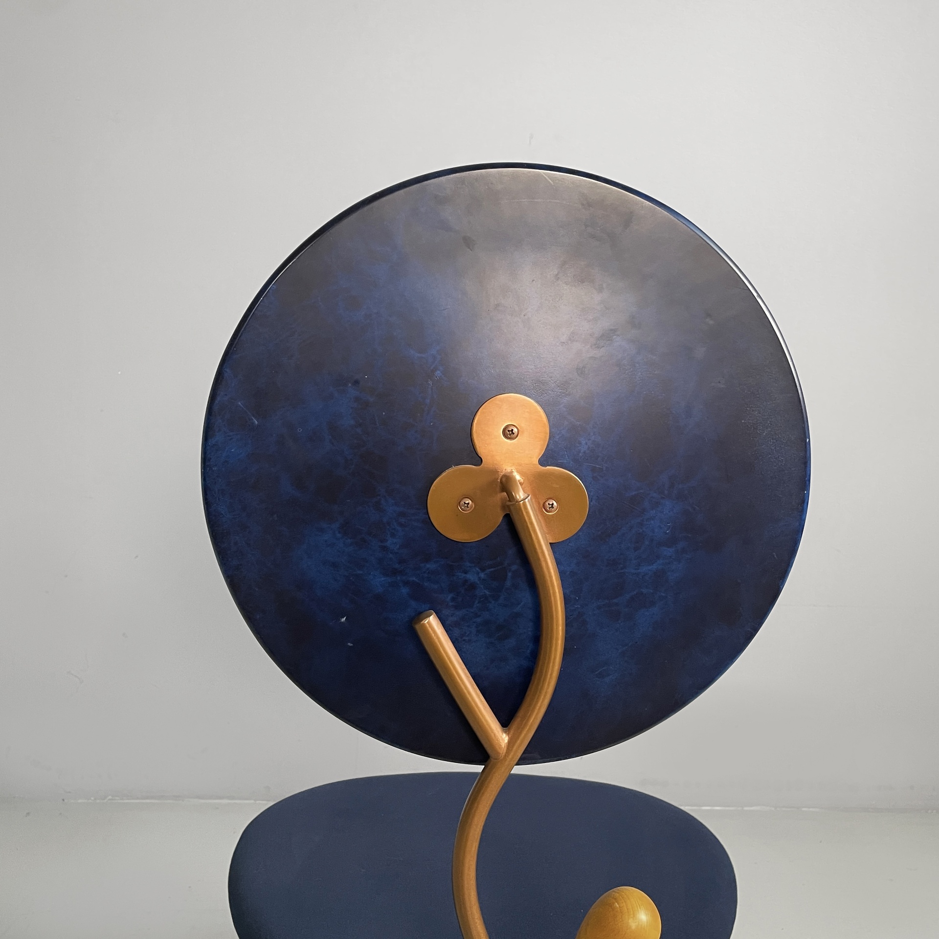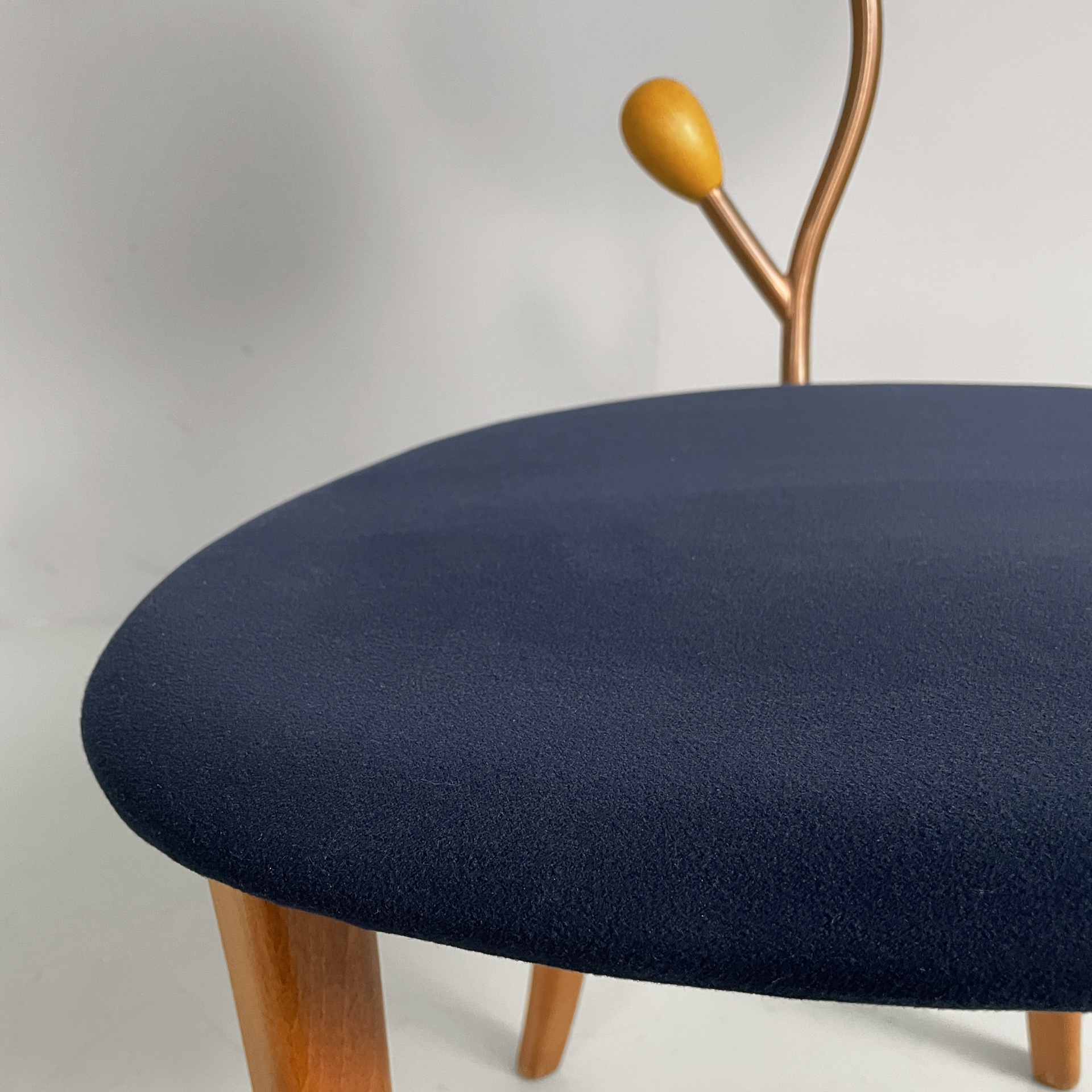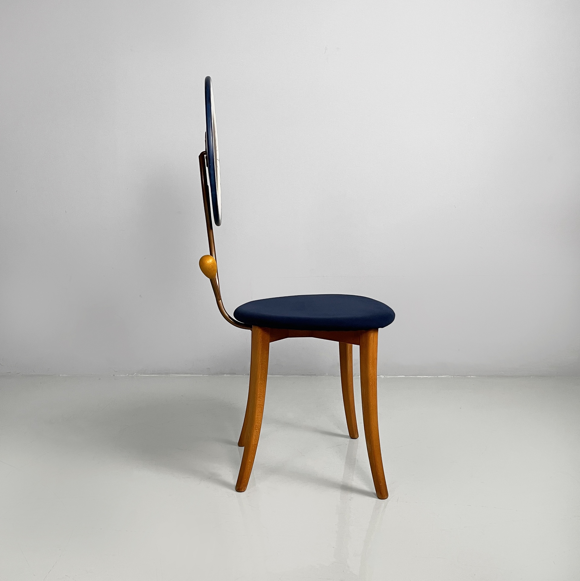 Sedia in legno chiaro, metallo e tessuto blu. Lo schienale tondo è in legno verniciato blu con disegno di margherita con al centro un volto sorridente, rifinito in foglia d’oro. La struttura dello schienale è in tondino di metallo curvato con elemento in legno decorativo. La seduta è imbottita e rivestita in tessuto blu. Le zampe a sezione squadrata son in legno.