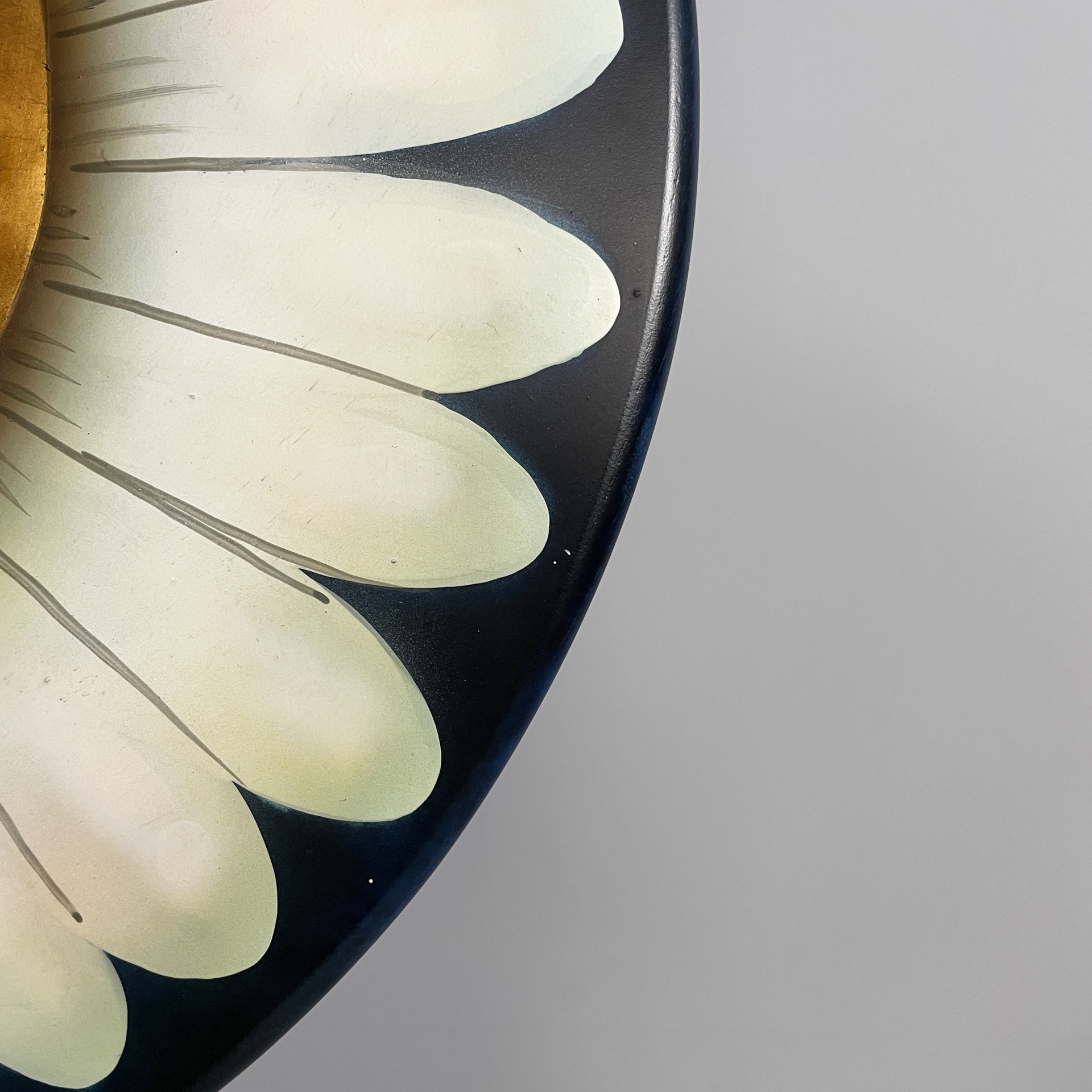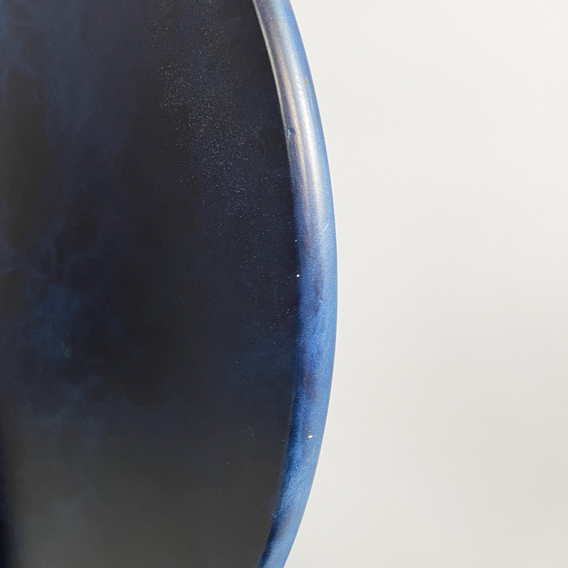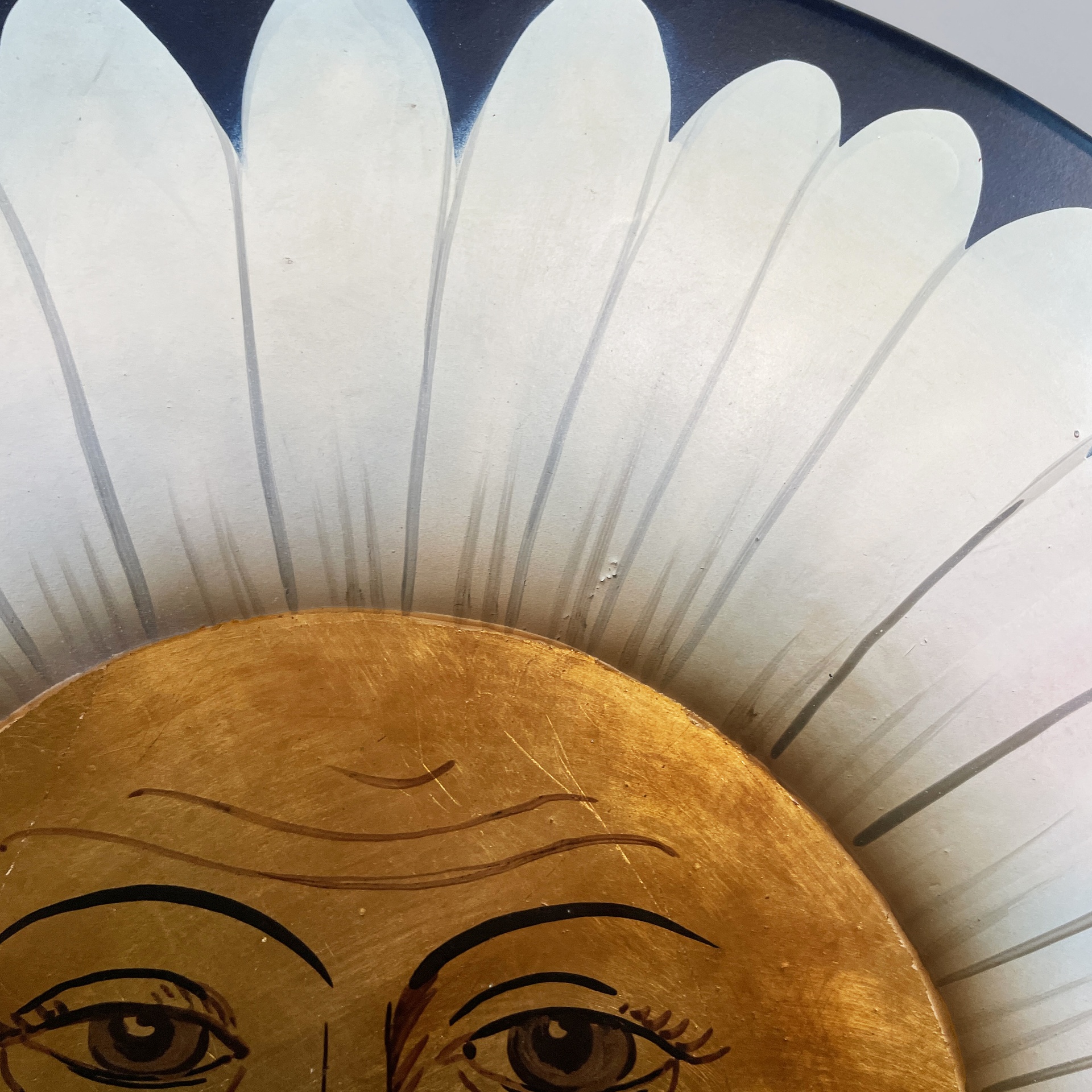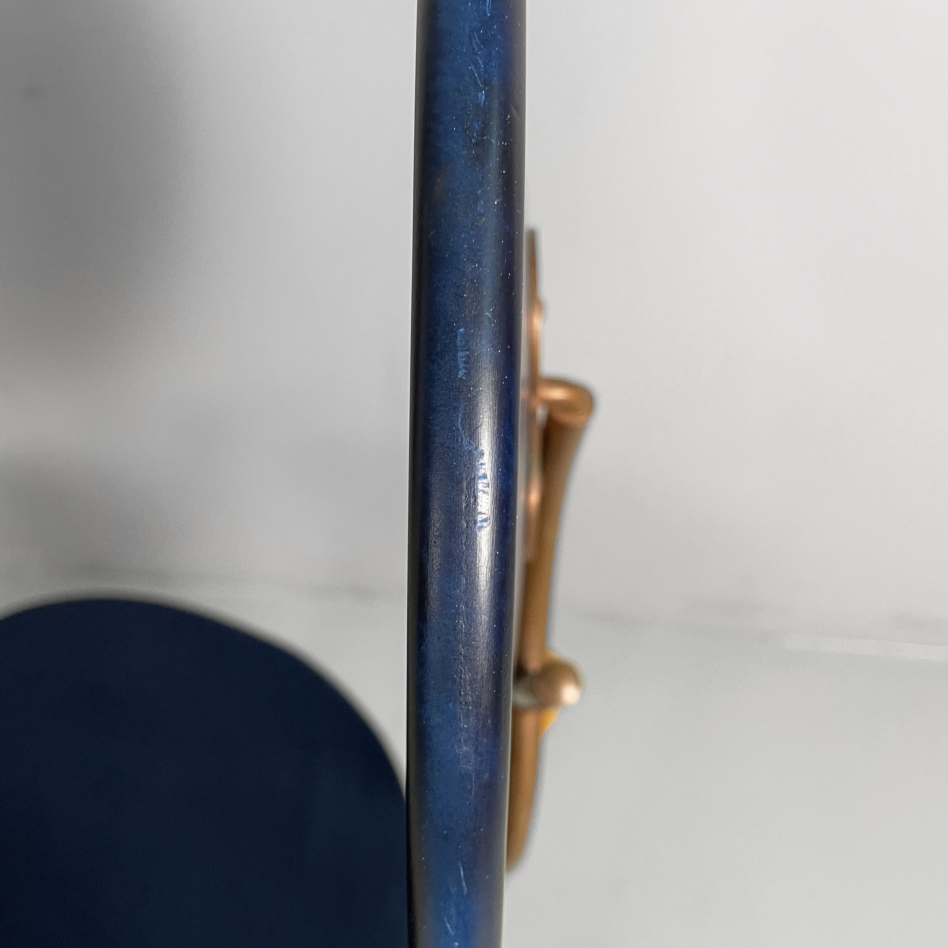 Sedia in legno chiaro, metallo e tessuto blu. Lo schienale tondo è in legno verniciato blu con disegno di margherita con al centro un volto sorridente, rifinito in foglia d’oro. La struttura dello schienale è in tondino di metallo curvato con elemento in legno decorativo. La seduta è imbottita e rivestita in tessuto blu. Le zampe a sezione squadrata son in legno.