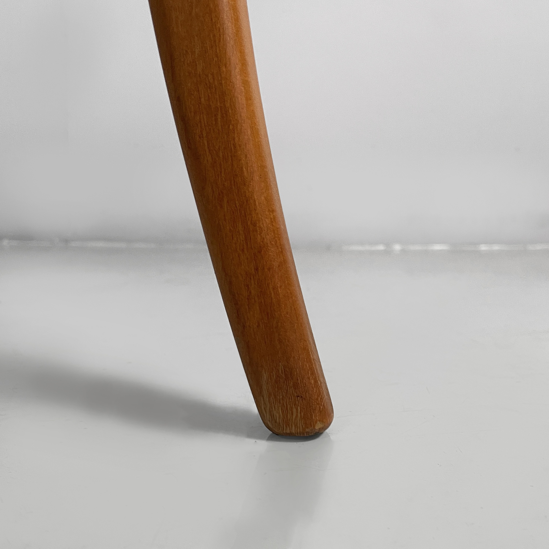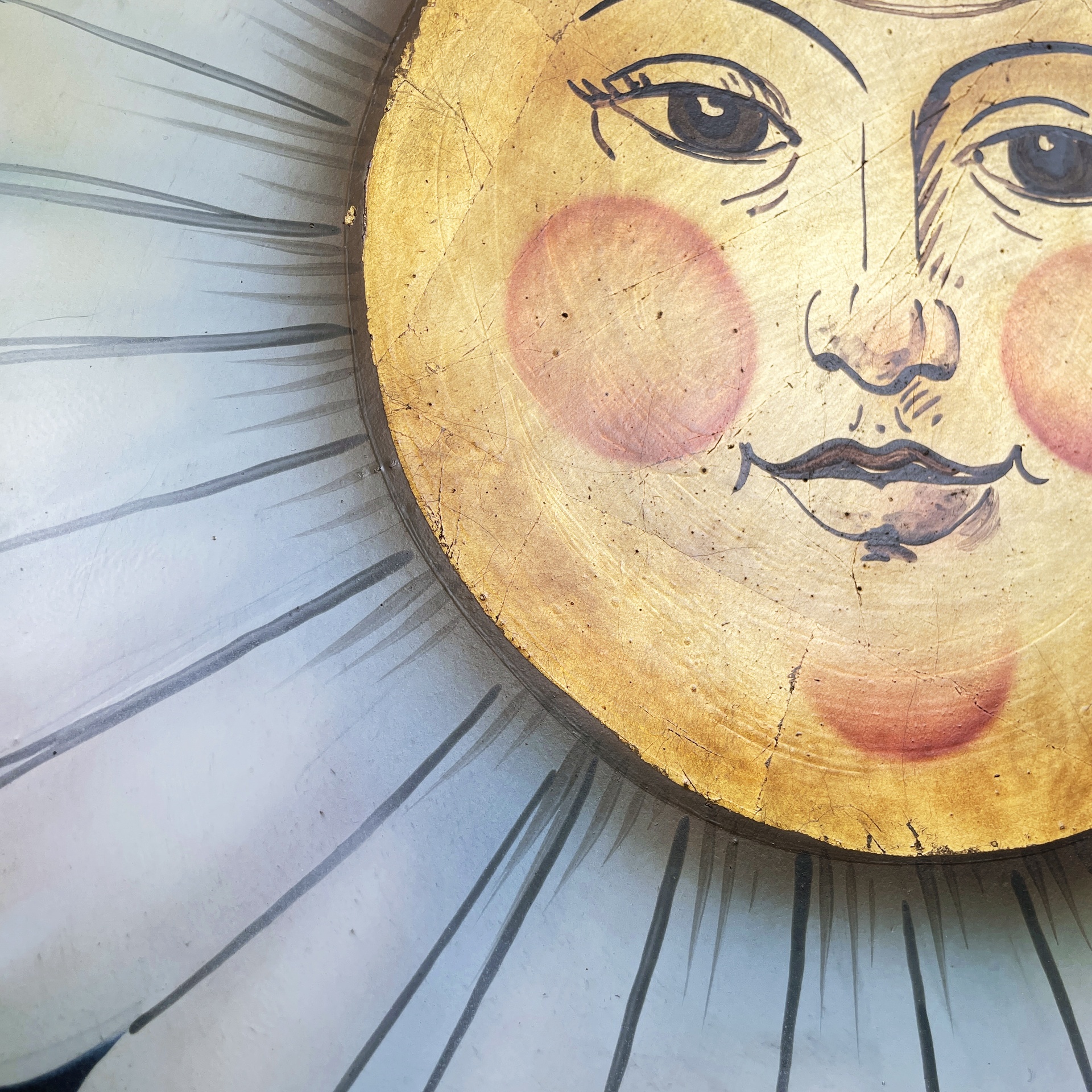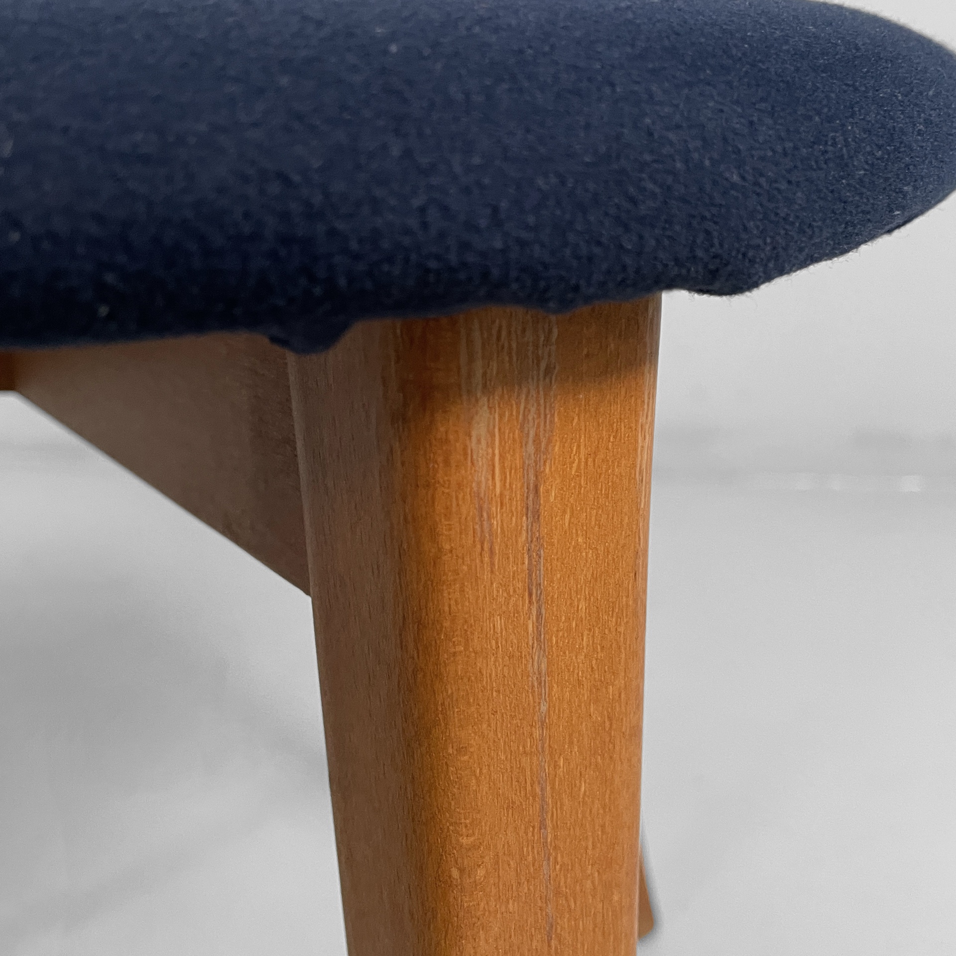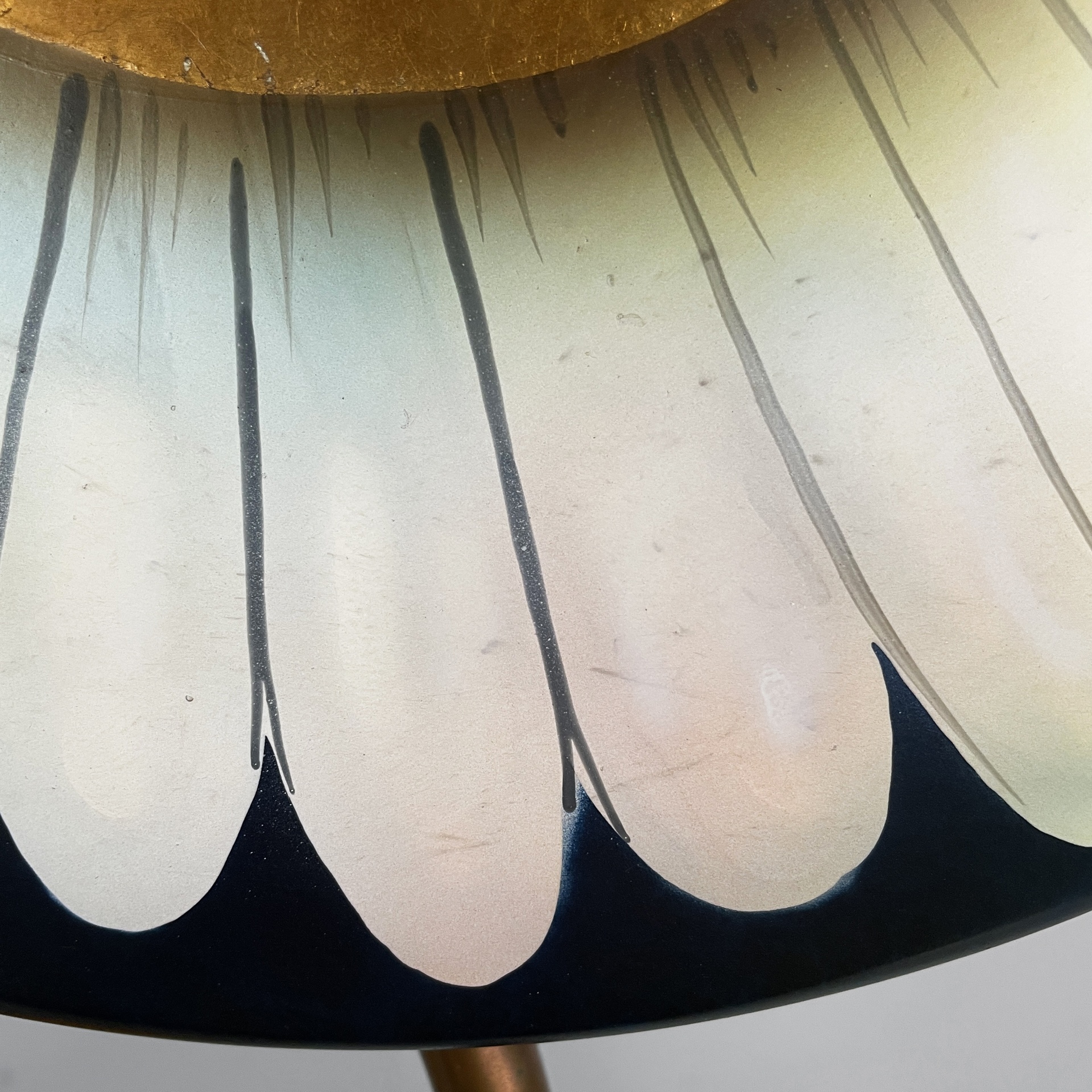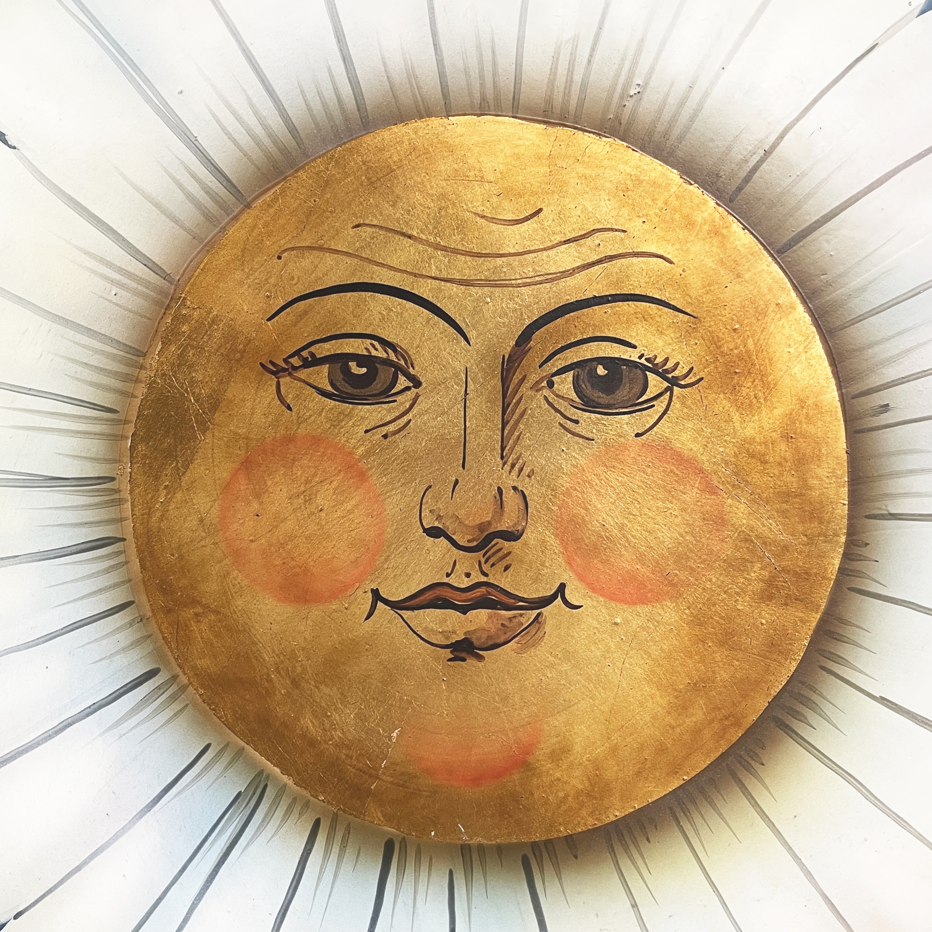 Sedia in legno chiaro, metallo e tessuto blu. Lo schienale tondo è in legno verniciato blu con disegno di margherita con al centro un volto sorridente, rifinito in foglia d’oro. La struttura dello schienale è in tondino di metallo curvato con elemento in legno decorativo. La seduta è imbottita e rivestita in tessuto blu. Le zampe a sezione squadrata son in legno.
