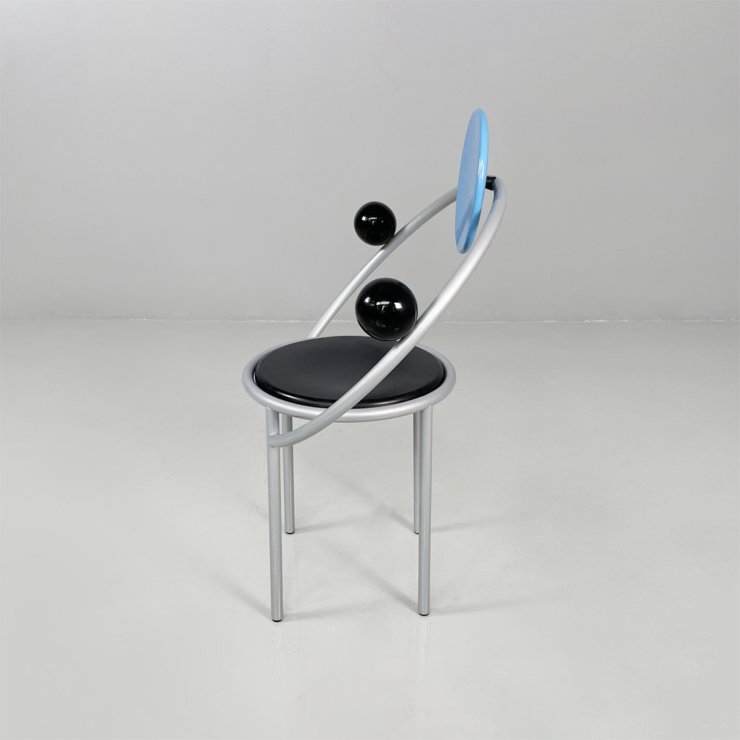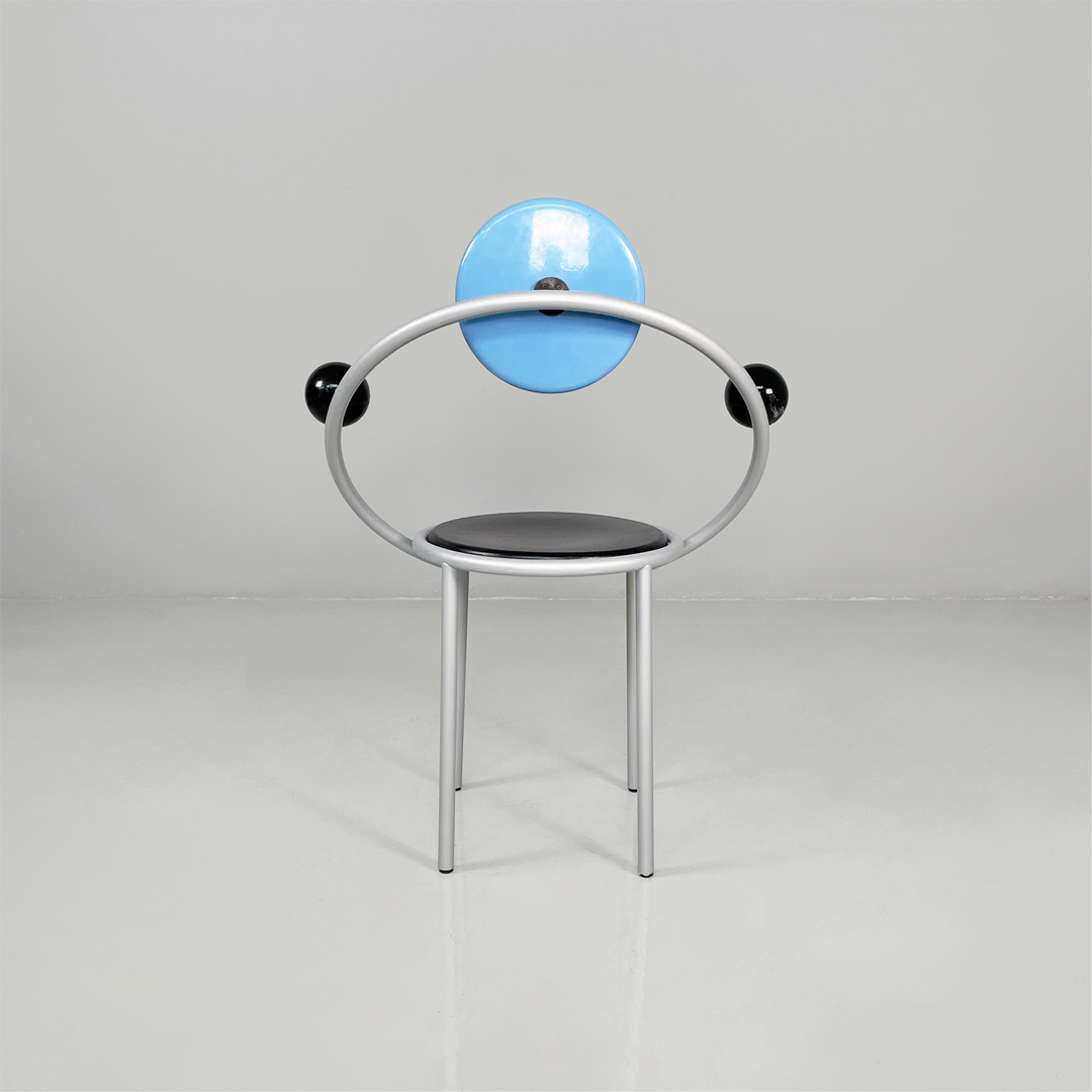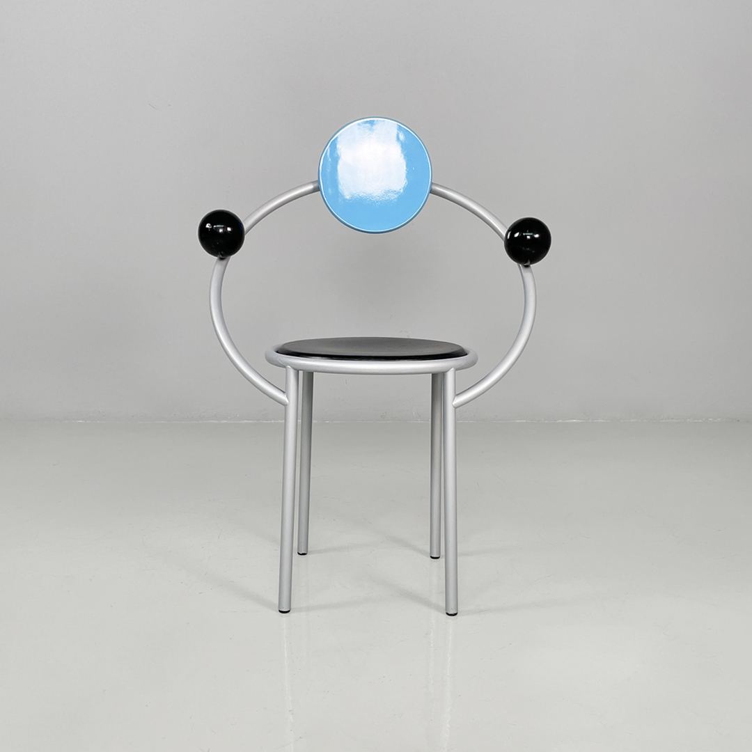 Sedia modello First in metallo e legno. La struttura è in metallo verniciato grigio. Lo schienale colore azzurro, la seduta e le sfere di colore nero sono in legno laccato.