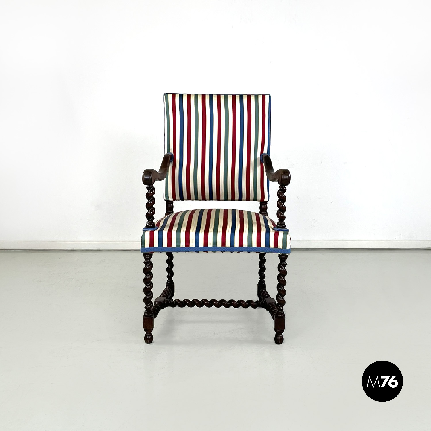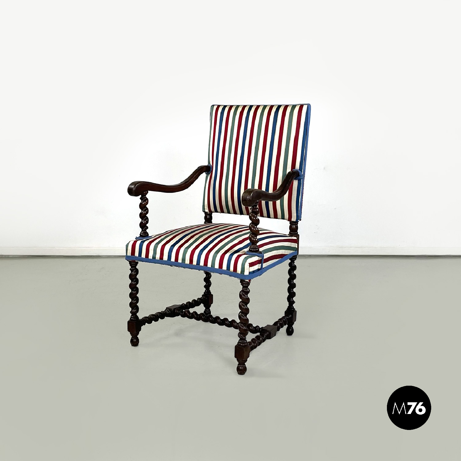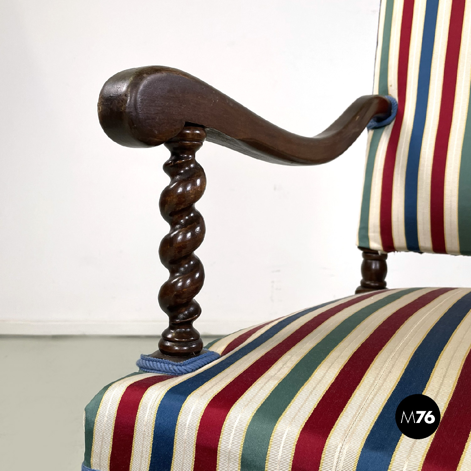 Poltrona o sedia a schienale alto o poltrona da capo tavola con braccioli con struttura in legno. La seduta e lo schienale sono imbottiti e rivestiti da un tessuto tipo seta a righe bianche rosse blu e verdi. Presenta una passamaneria celeste che segue il profilo del rivestimento di tessuto e fa da dettaglio decorativo. I braccioli le quattro gambe e la loro struttura portante sono decorati a torciglione.