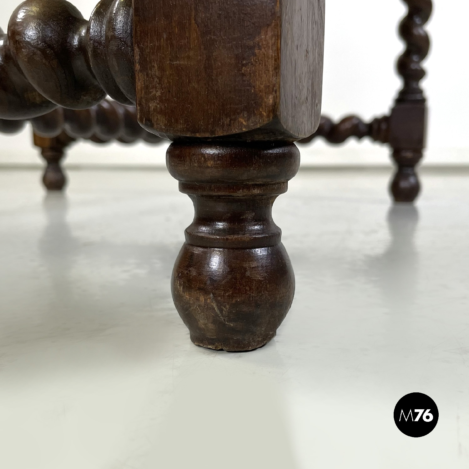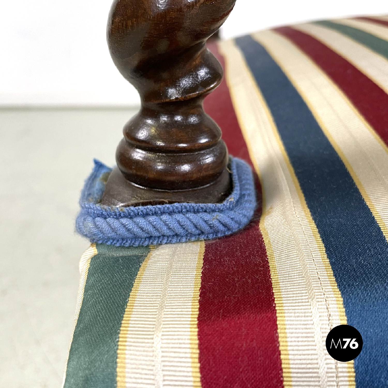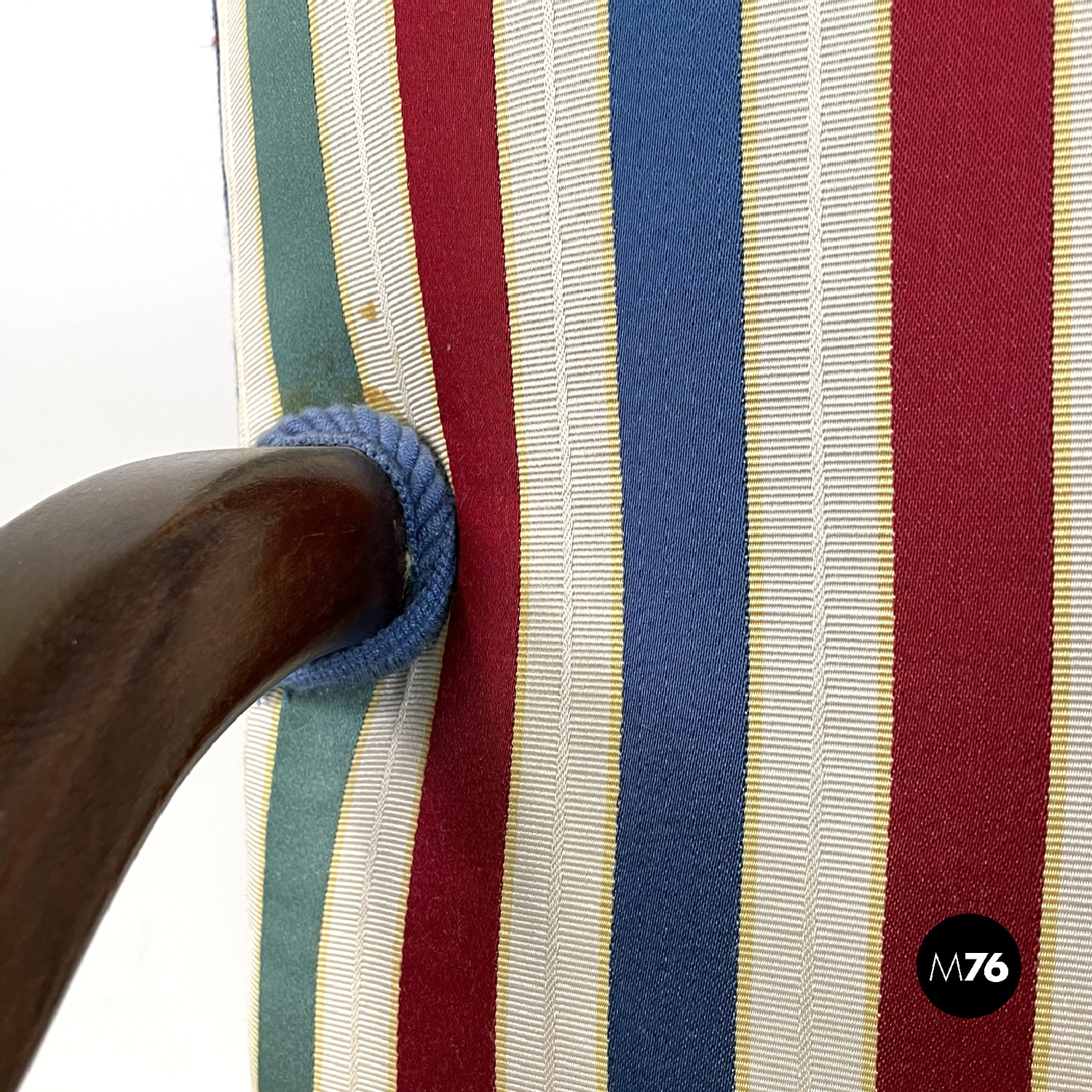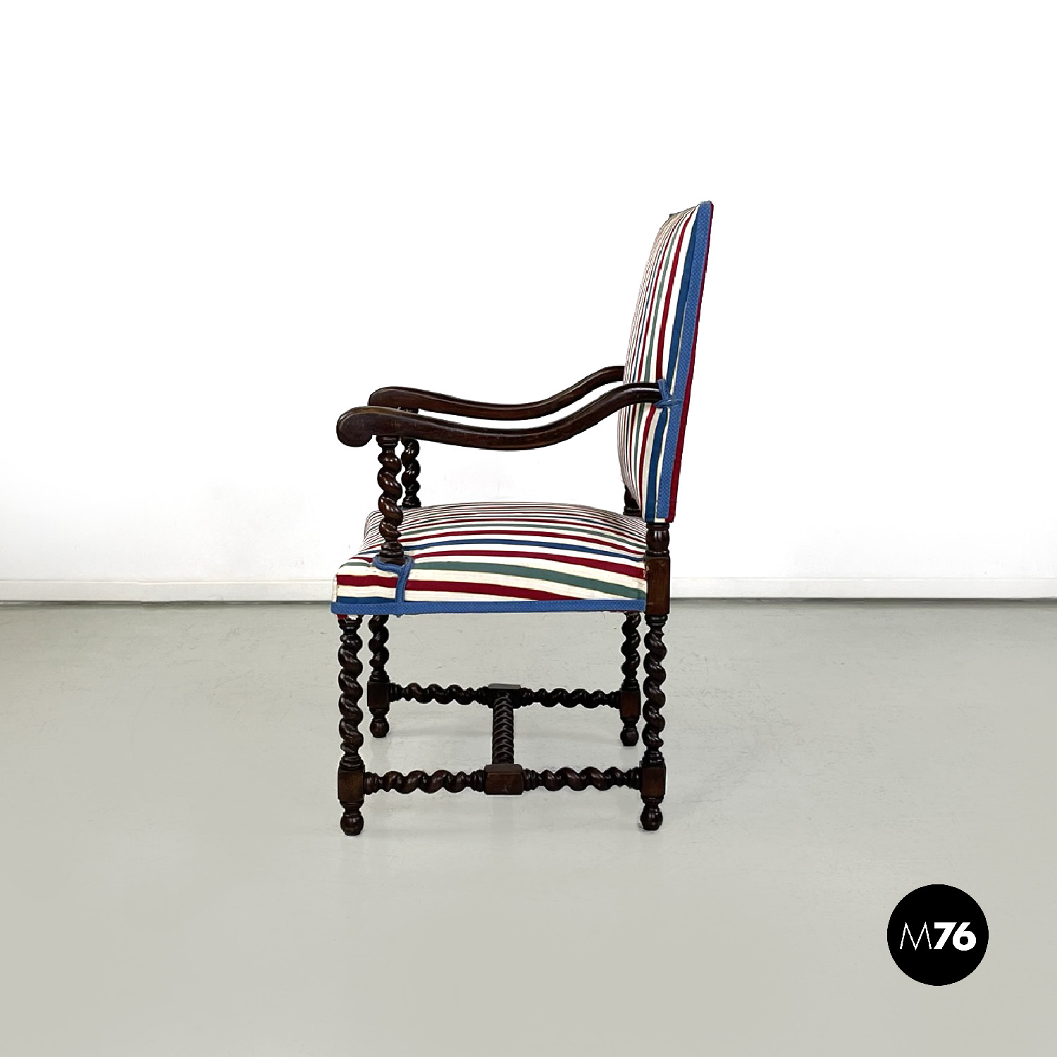 Poltrona o sedia a schienale alto o poltrona da capo tavola con braccioli con struttura in legno. La seduta e lo schienale sono imbottiti e rivestiti da un tessuto tipo seta a righe bianche rosse blu e verdi. Presenta una passamaneria celeste che segue il profilo del rivestimento di tessuto e fa da dettaglio decorativo. I braccioli le quattro gambe e la loro struttura portante sono decorati a torciglione.