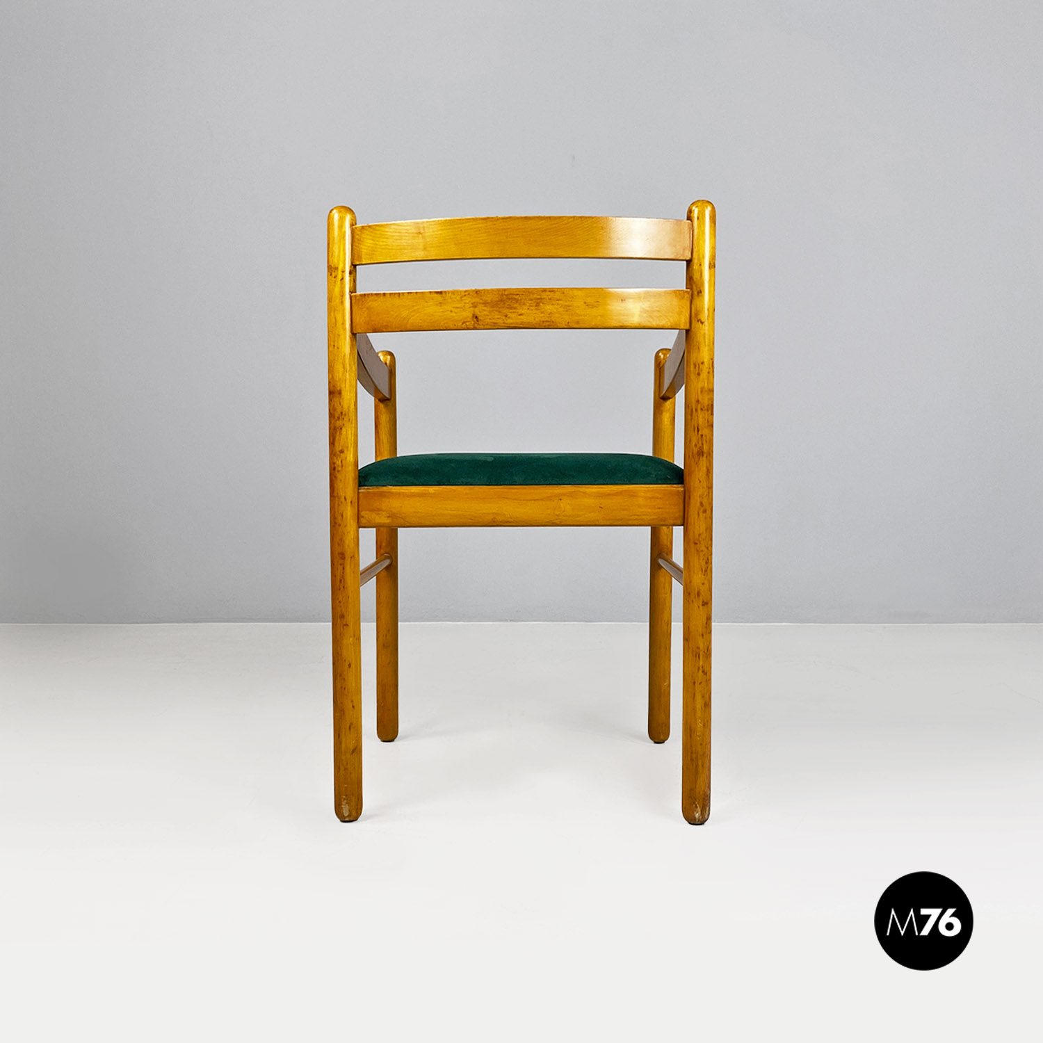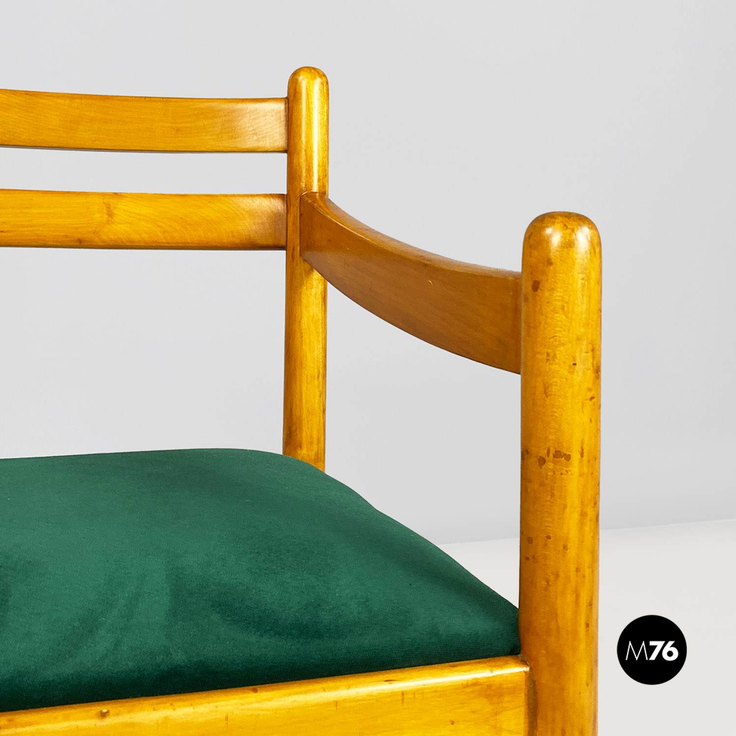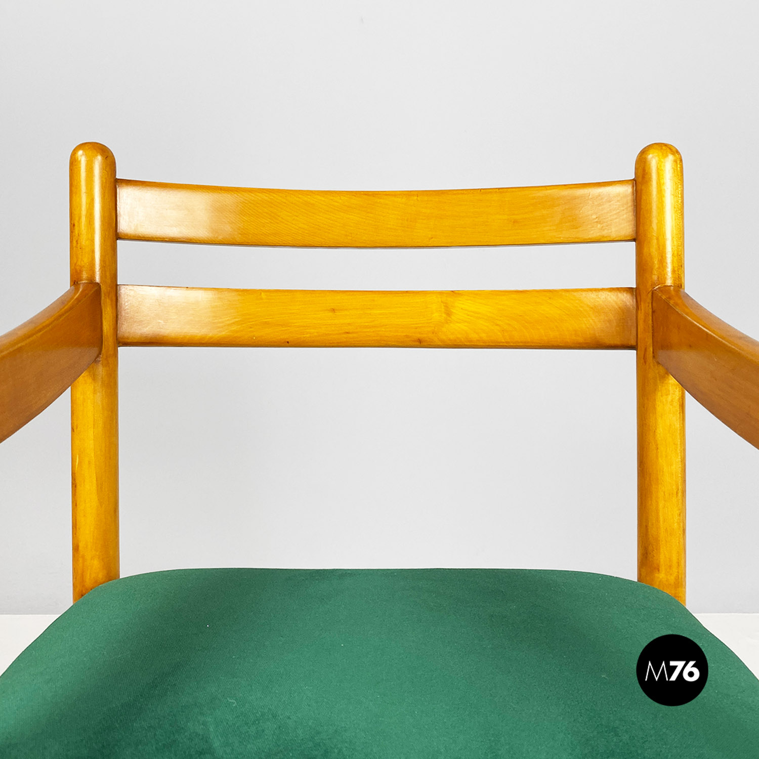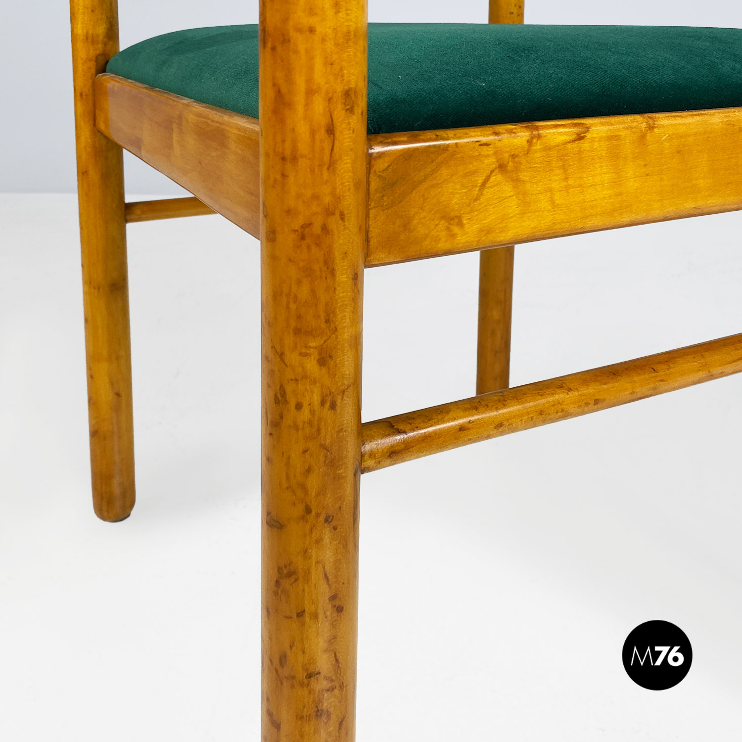 Sedia in legno con braccioli curvi con seduta rettangolare in velluto verde bosco. Con zampe a sezione tonda.