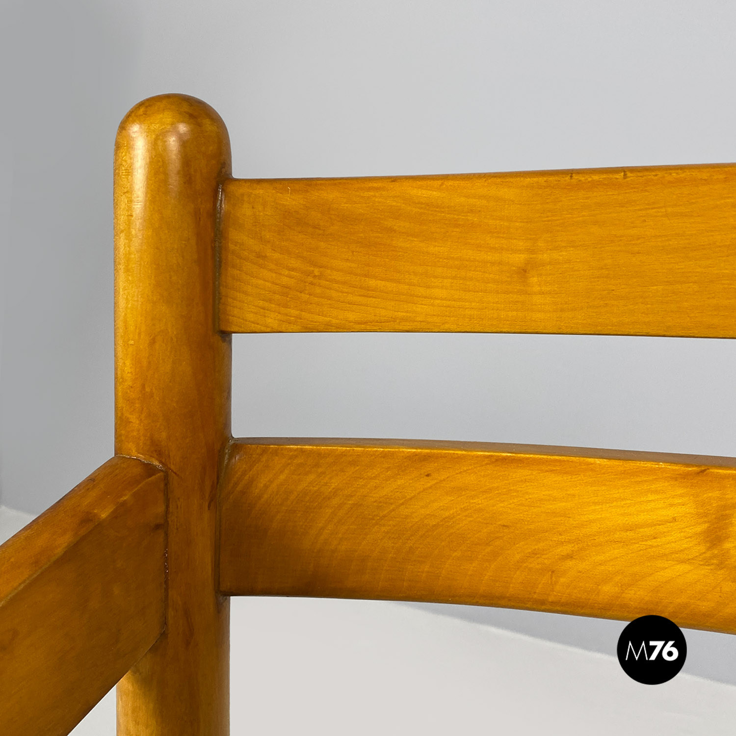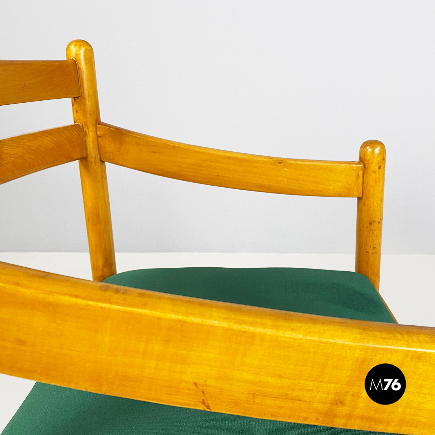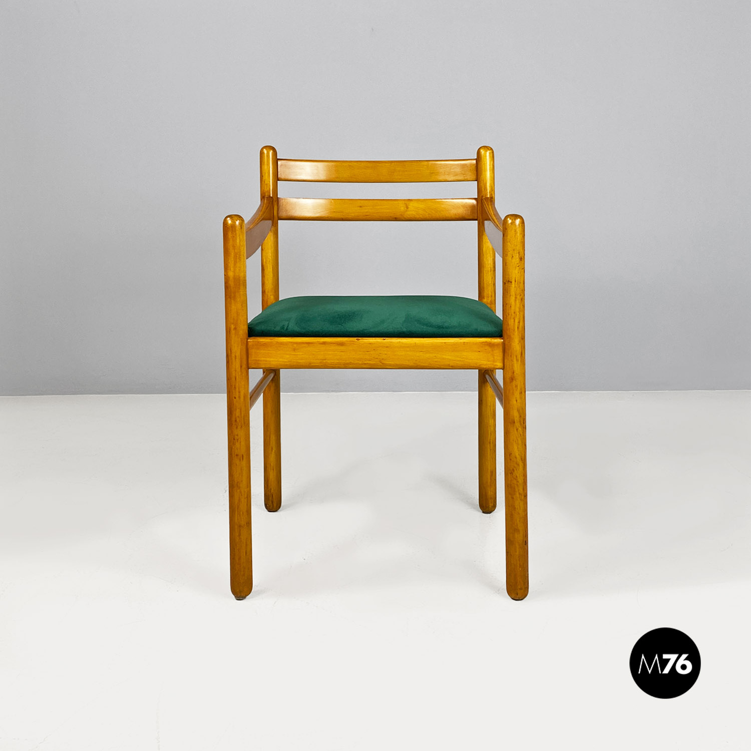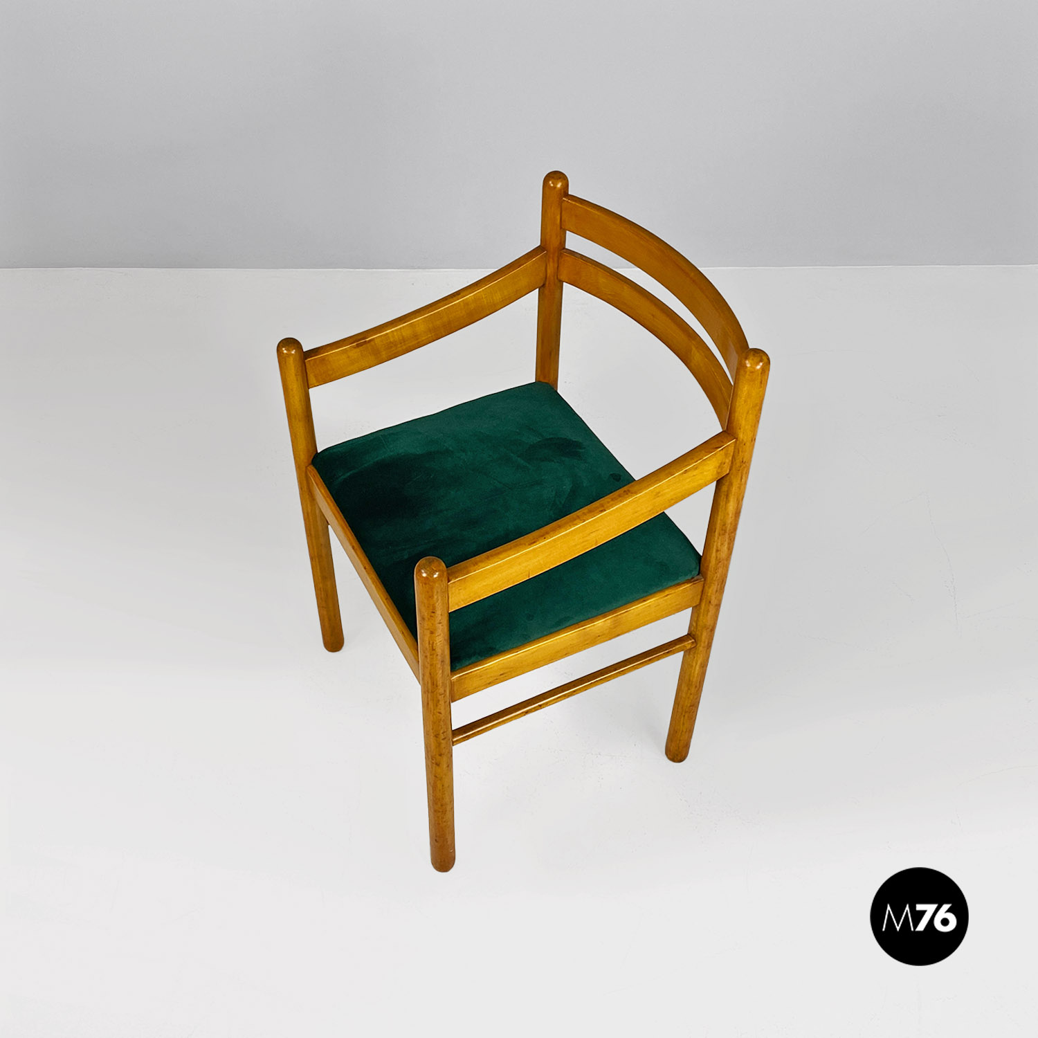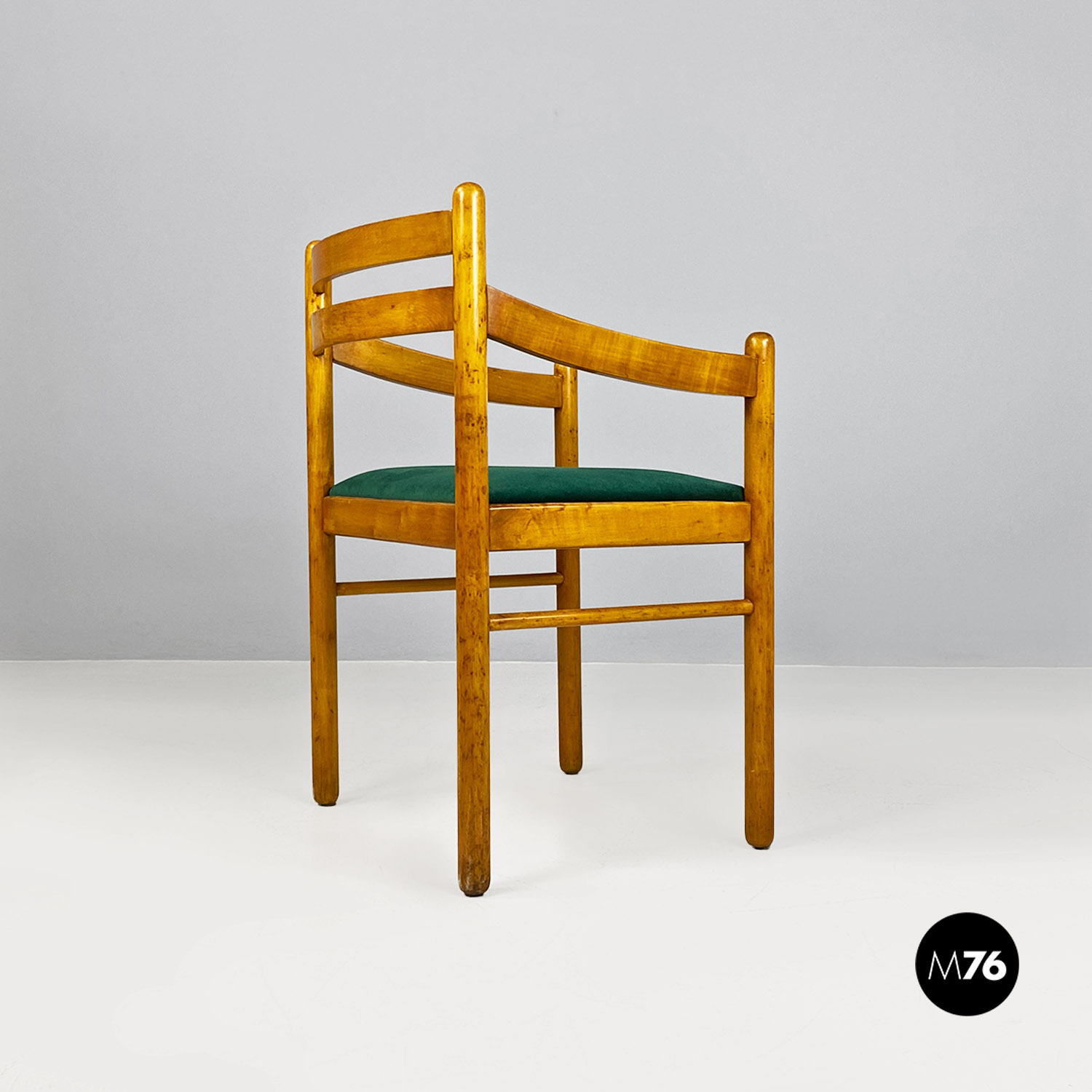 Sedia in legno con braccioli curvi con seduta rettangolare in velluto verde bosco. Con zampe a sezione tonda.