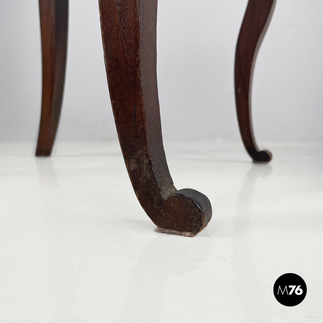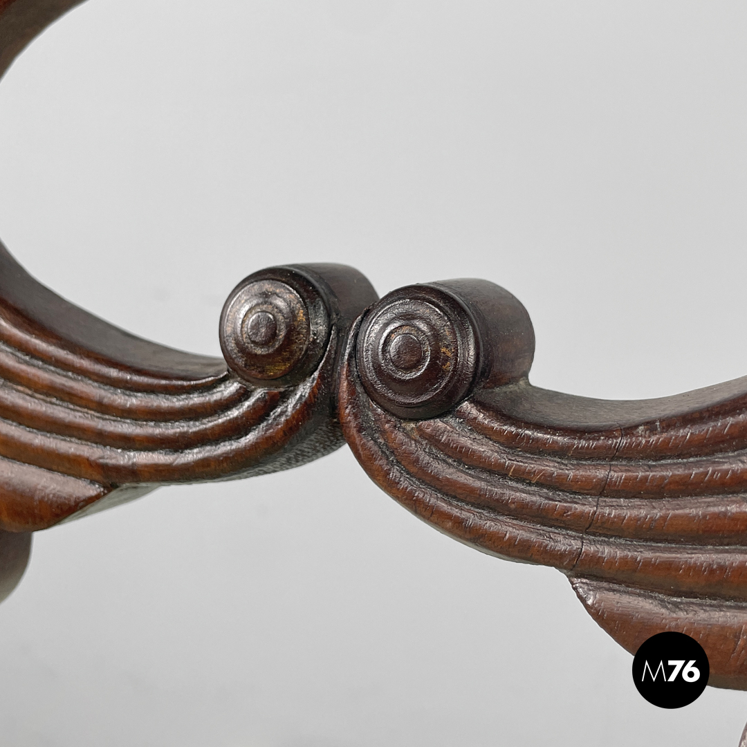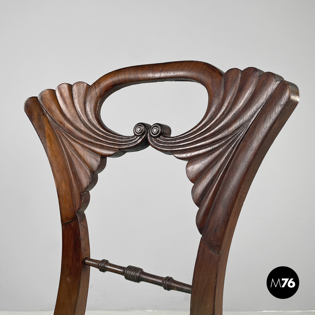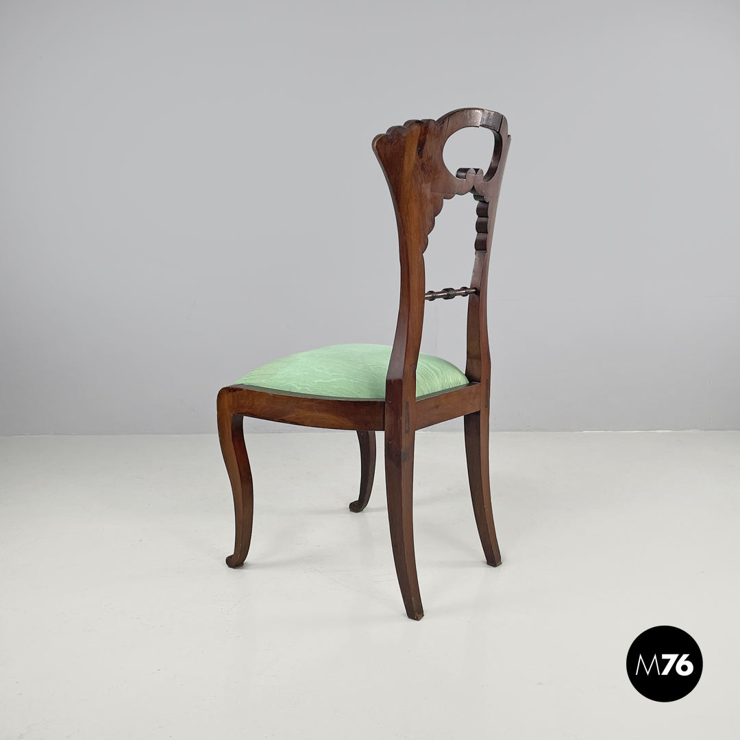 Sedia in legno in stile Biedermeier. La struttura segue linee curve tondeggiante in particolare lo schienale presenta nella parte alta decorazioni che richiamano la forma di due ali o forme naturali che terminano con due spirali a formare un foro. La seduta è rivestita con un tessuto verde satinato con decorazioni dalle forme geometriche organiche.