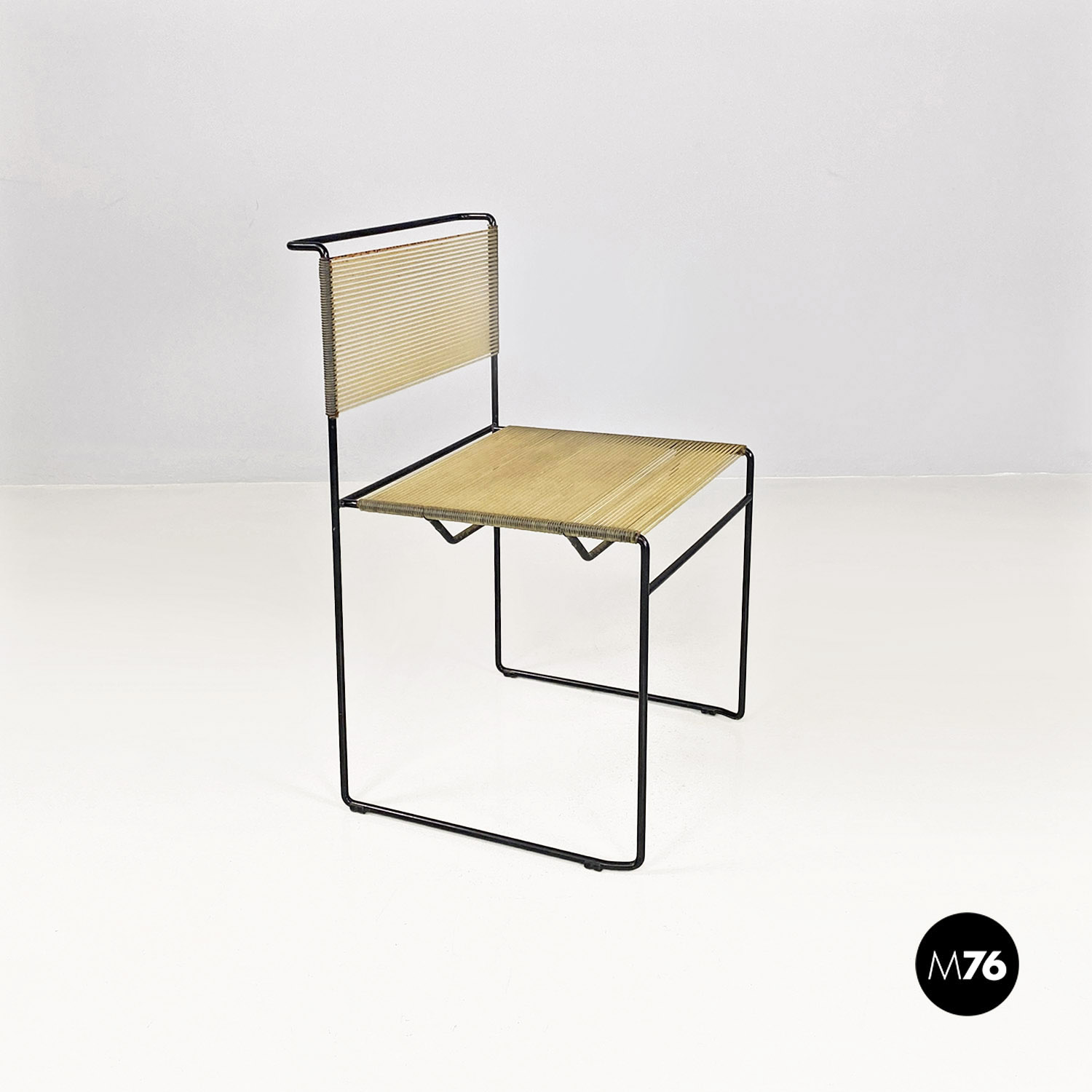 Sedia con struttura in tondino di metallo nero e seduta e schienale creati con fili di plastica trasparenti.