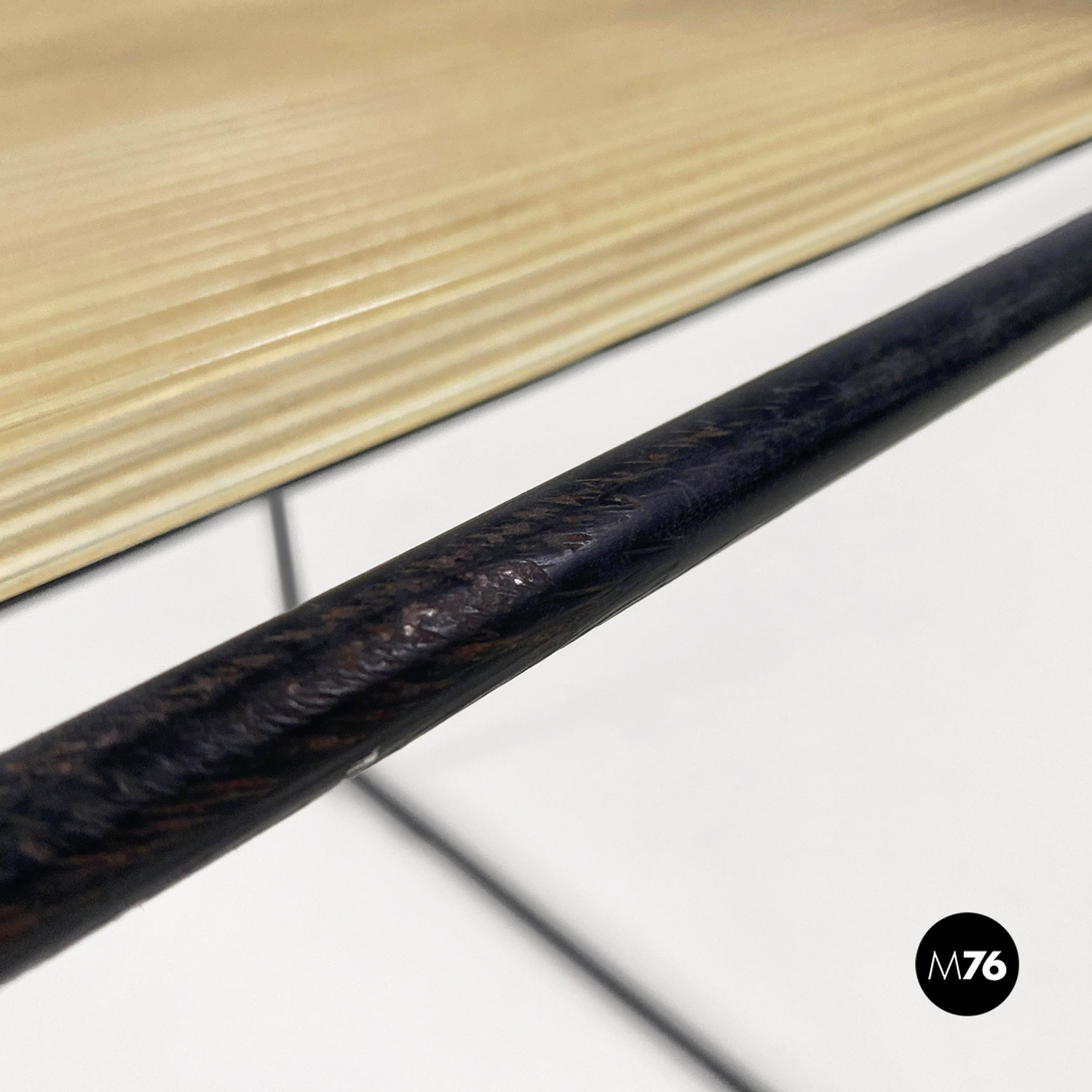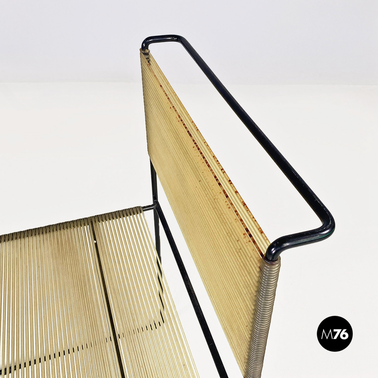 Condizioni discrete con segni dell’uso e del tempo con ossidazione presente all’interno dell’ultima corda in alto dello schienale.