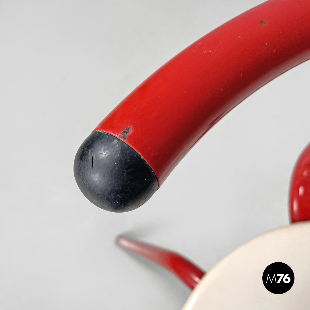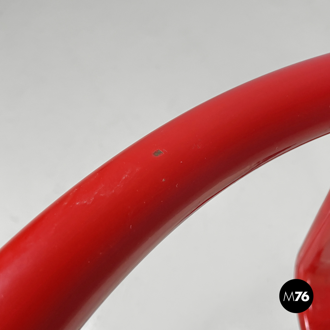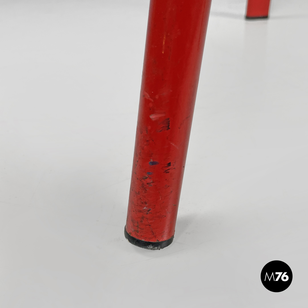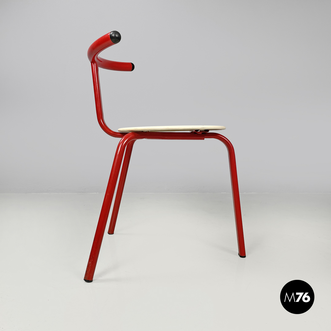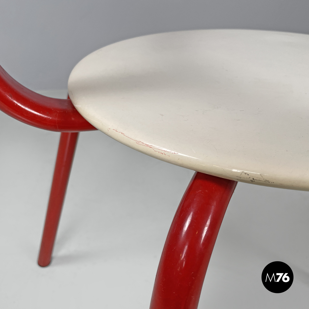 Sedia con seduta tonda in metallo verniciato bianco. La struttura è in metallo verniciato di rosso lo schienale è in tubolare di metallo ed è curvo con estremità in plastica nera. Presenta tre gambe le due posteriori in tondino di metallo e la frontale centrale a sezione rettangolare.