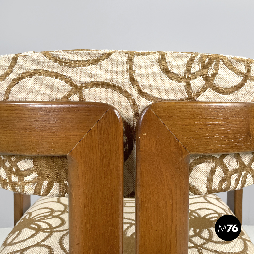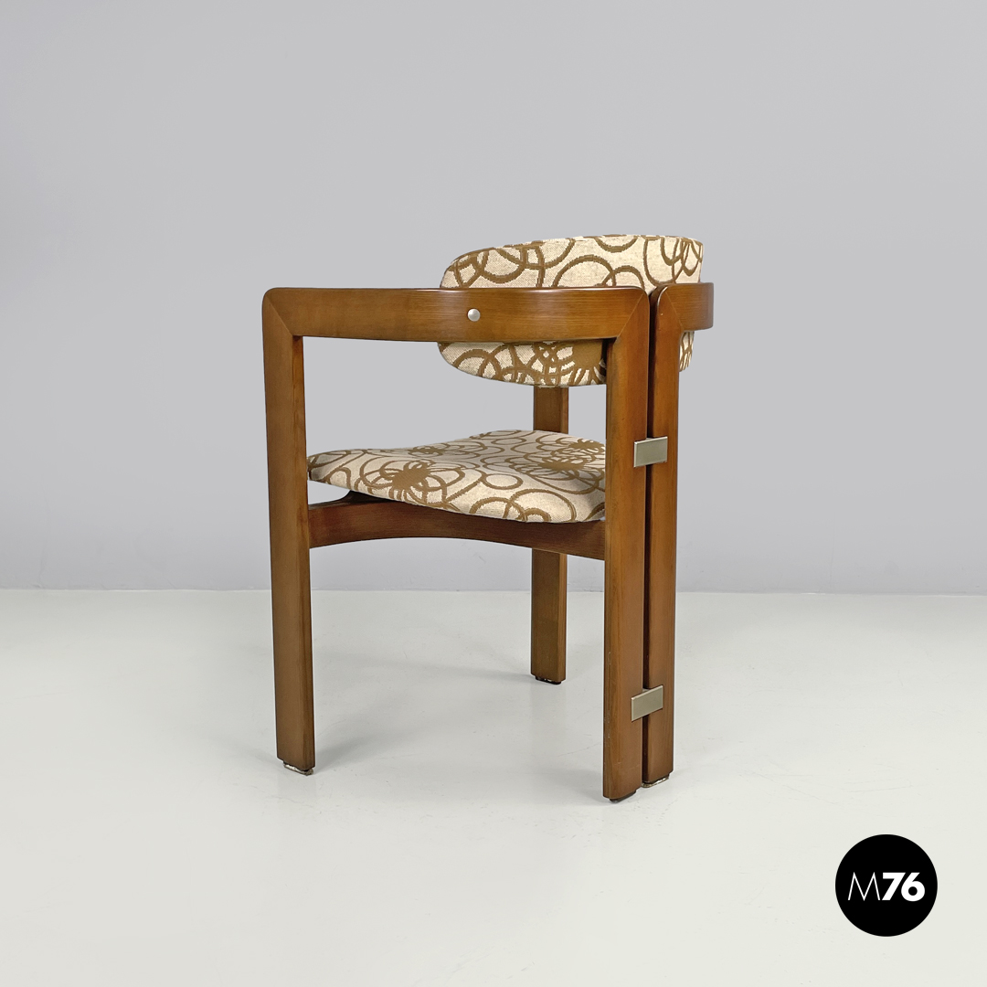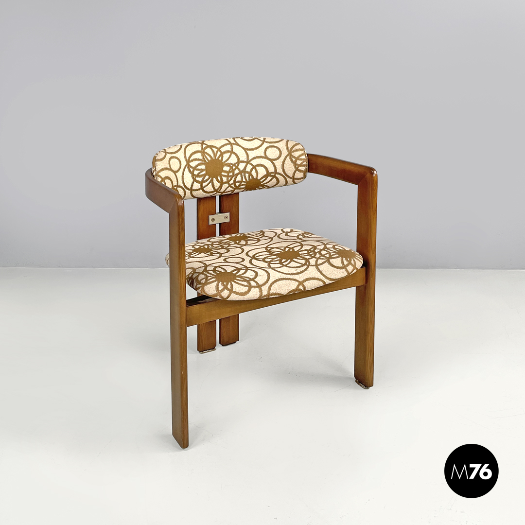 Sedia modello Pamplona a pozzetto in legno e tessuto. La struttura curva nella parte superiore a formare lo schienale e i braccioli. Le quattro gambe a sezione rettangolare sono due anteriori ai lati della struttura e due posteriori al centro. Lo schienale e la seduta sono tappezzate con tessuto a sfondo beige con decorazione floreale stilizzata marrone.