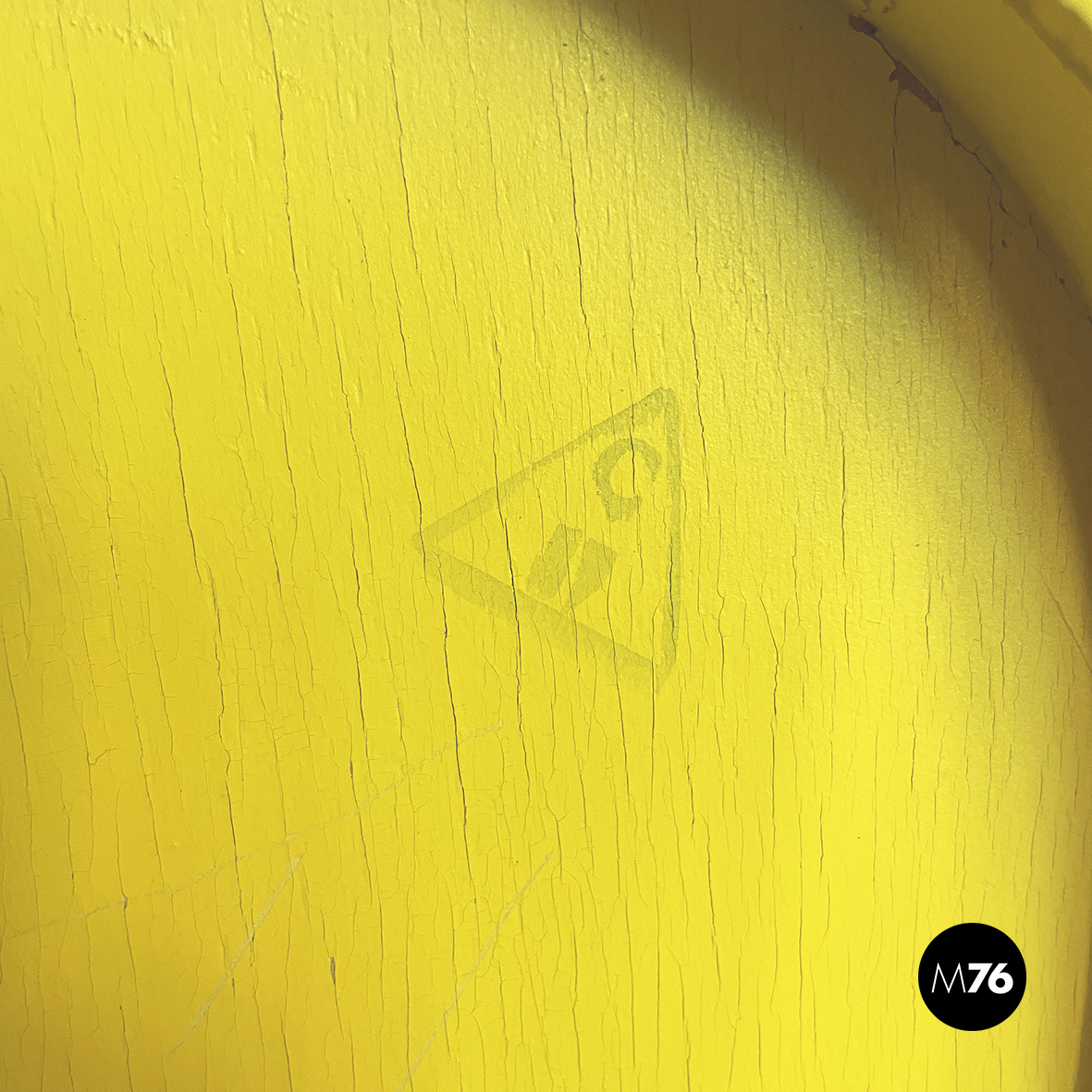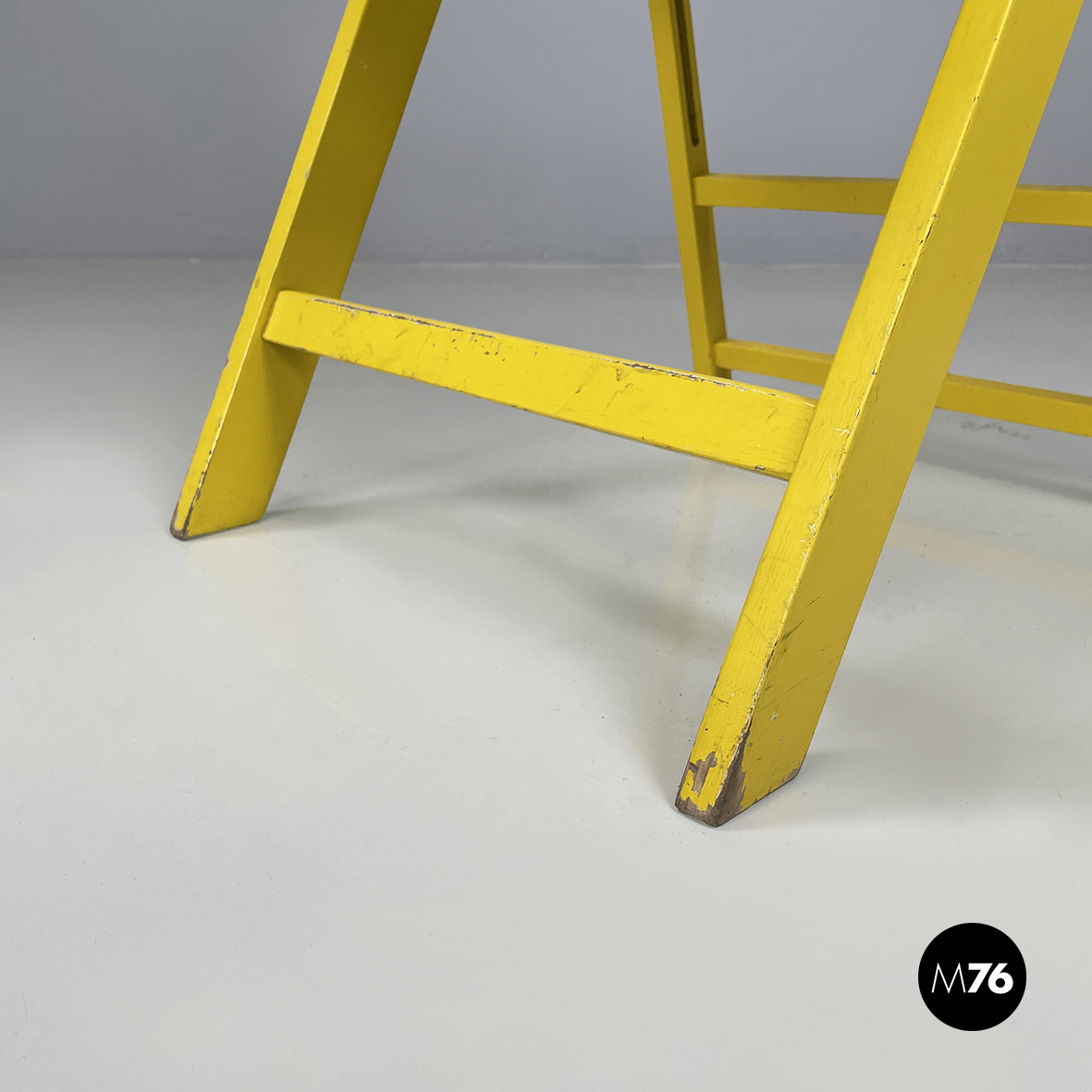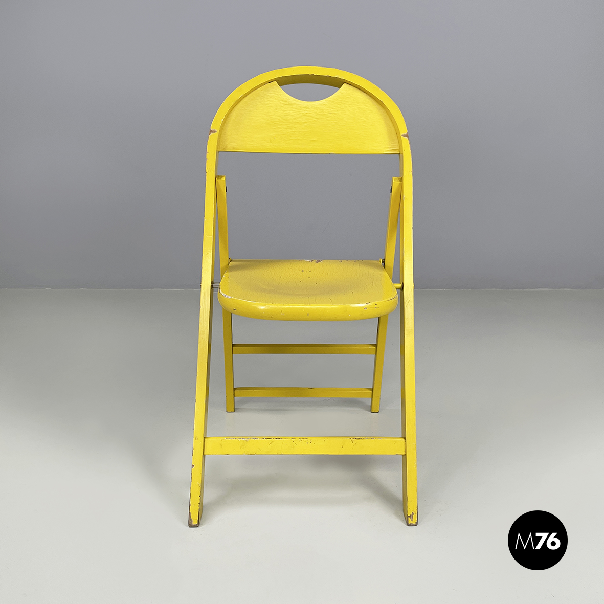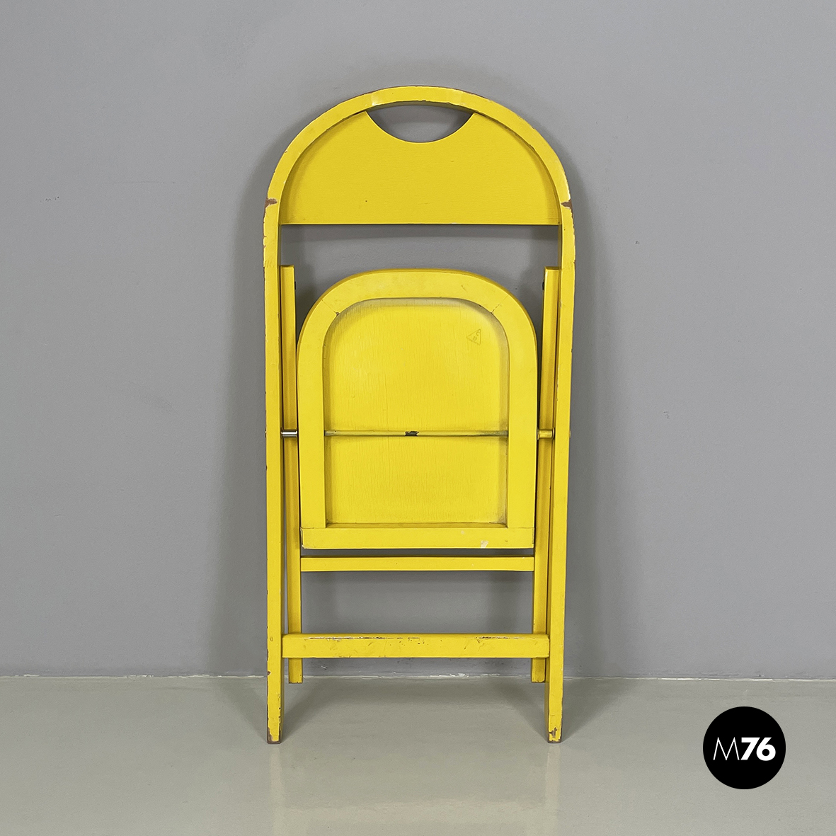 Sedia pieghevole modello Tric interamente in legno verniciato in color giallo brillante. La seduta e lo schienale sono di forma tondeggiante. Le zampe sono a sezione rettangolare.