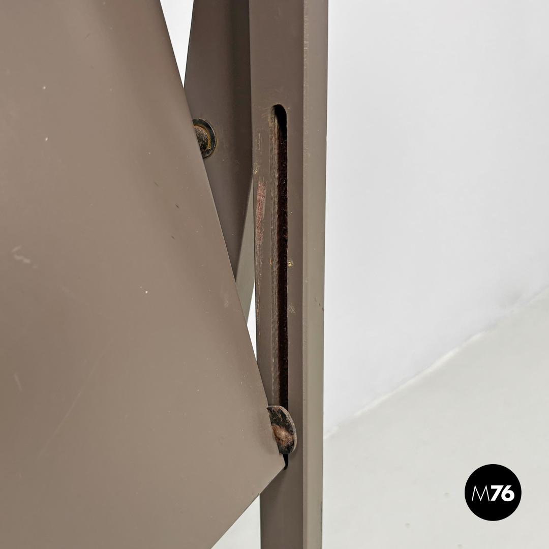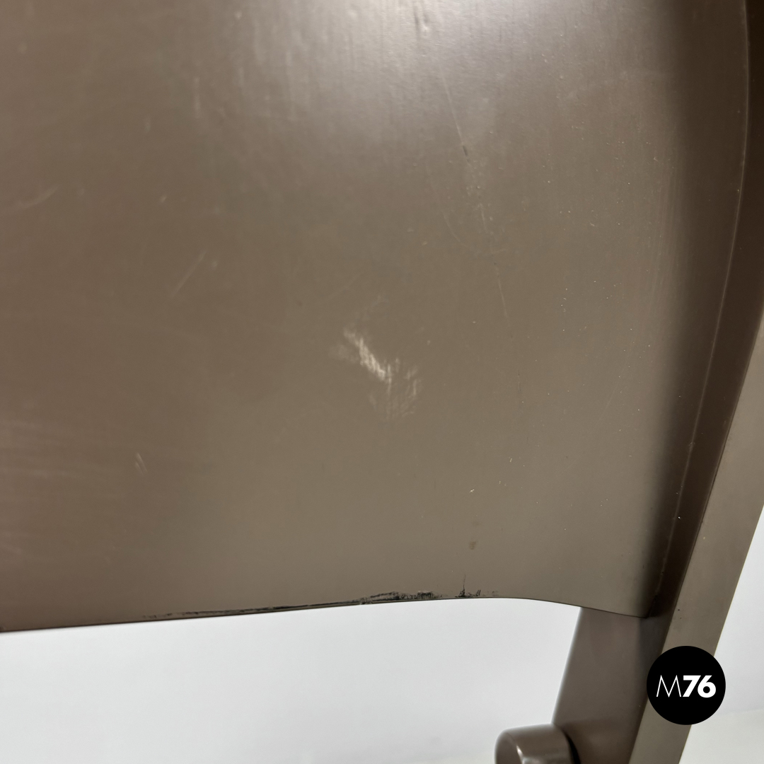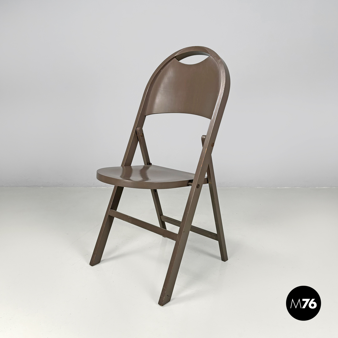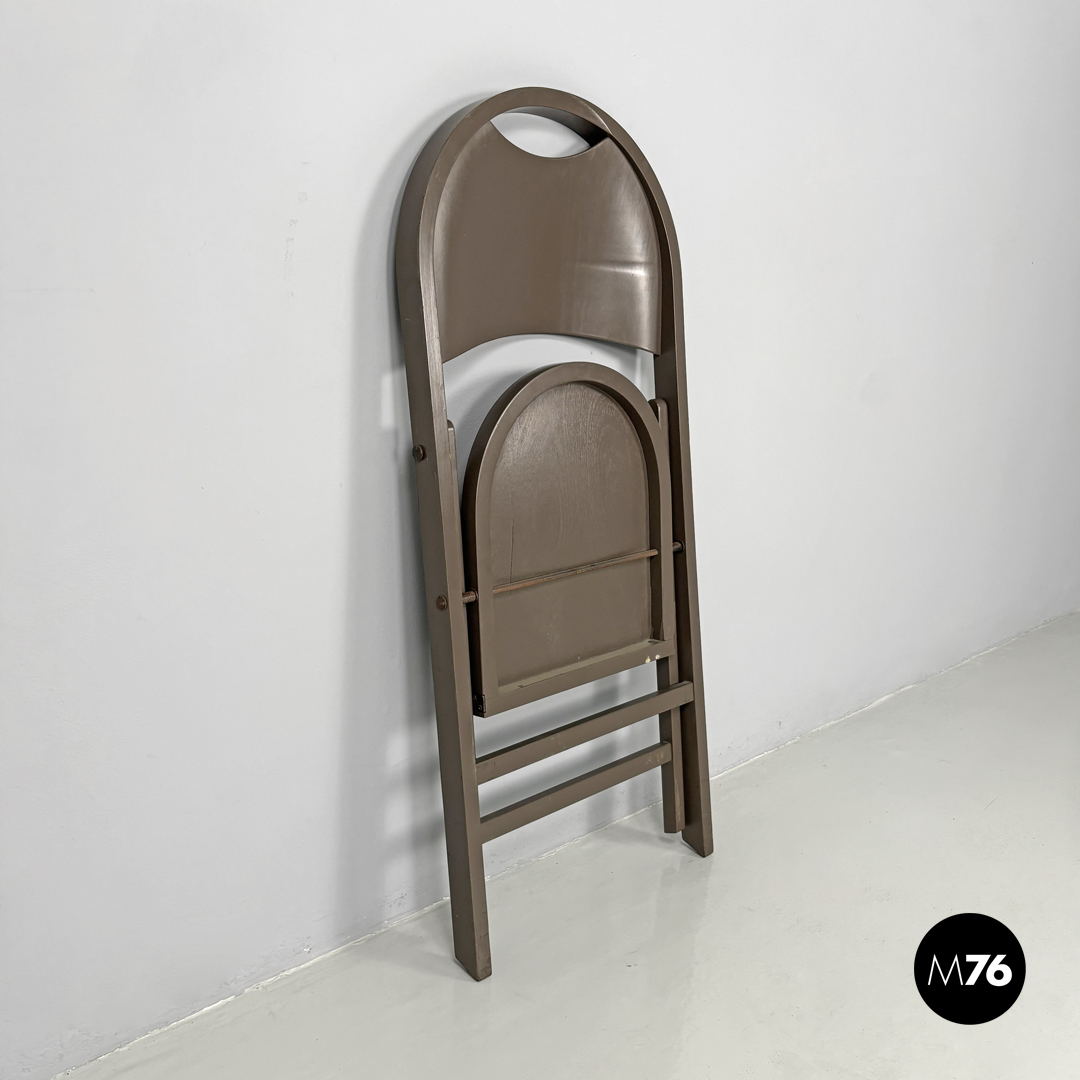 Sedia pieghevole modello Tric interamente in legno verniciato marrone tortora. La seduta e lo schienale sono di forma tondeggiante. Le zampe sono a sezione rettangolare.