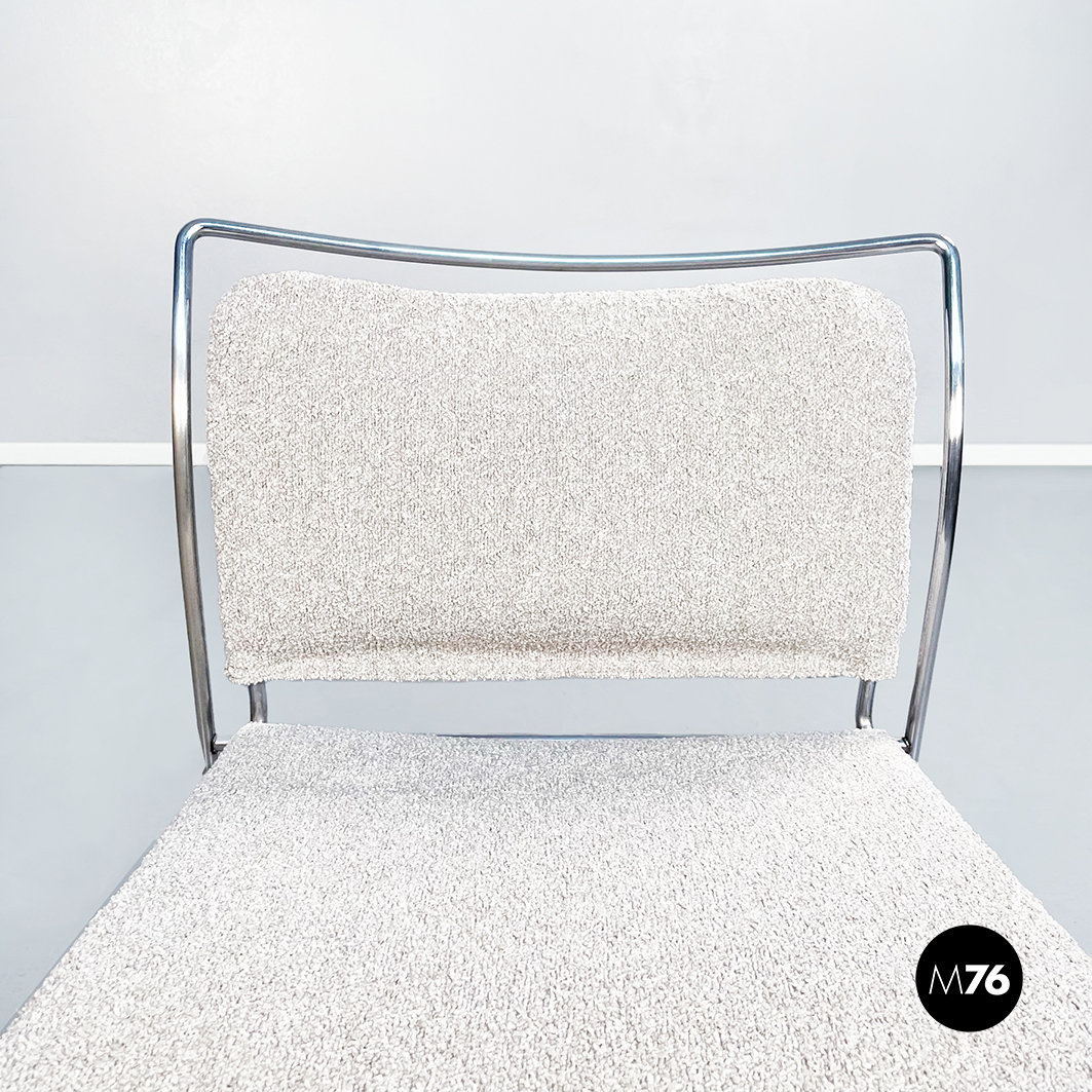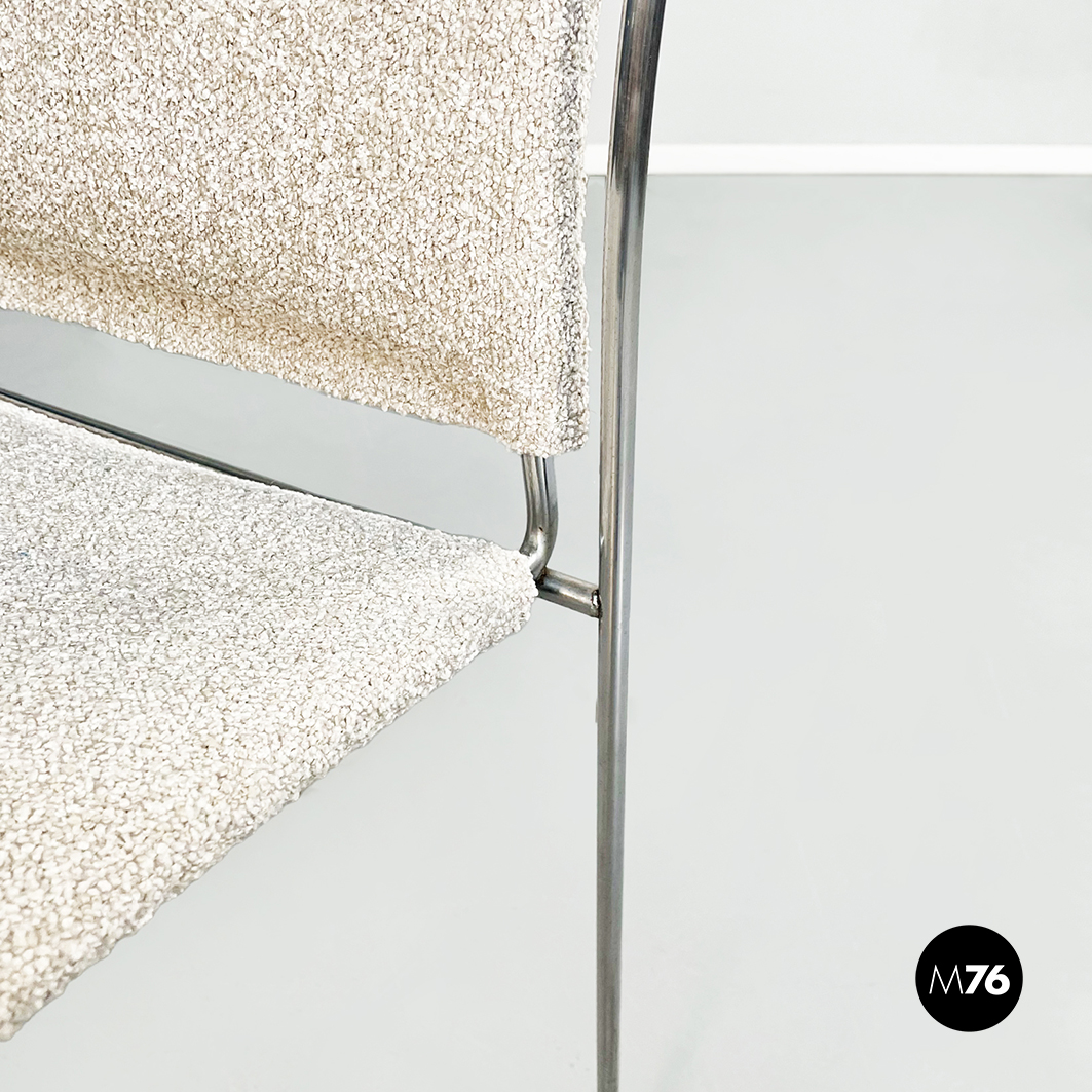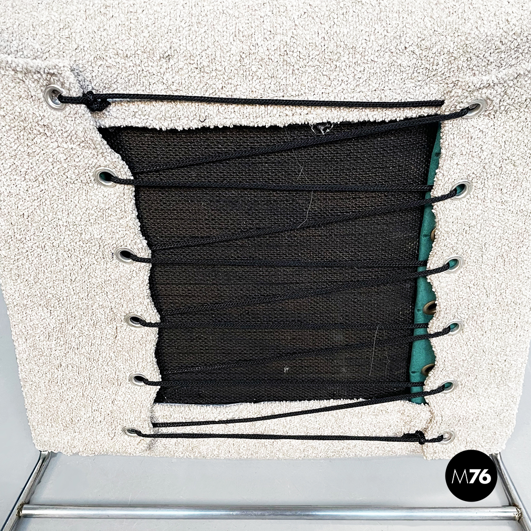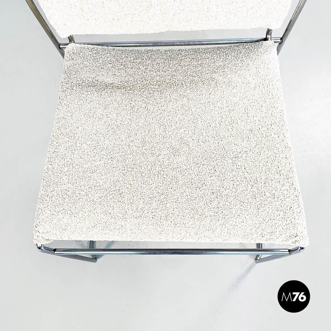 Sedia modello Tulu con struttura in tubolare di acciaio inox e con seduta rettangolare imbottita e rivestita in tessuto bouclè bianco sostenuta da sotto attraverso delle cinghie elastiche nere.