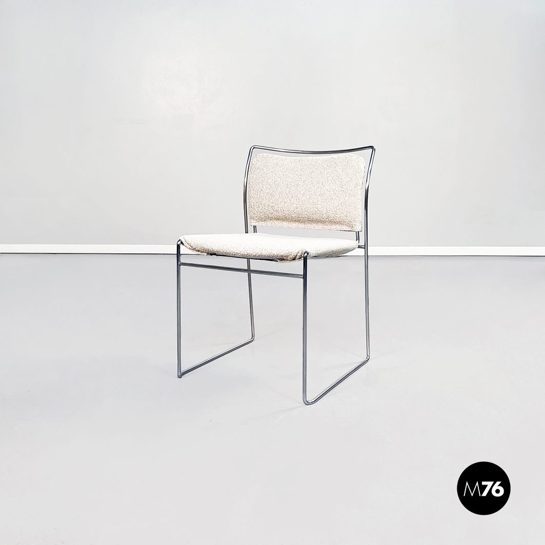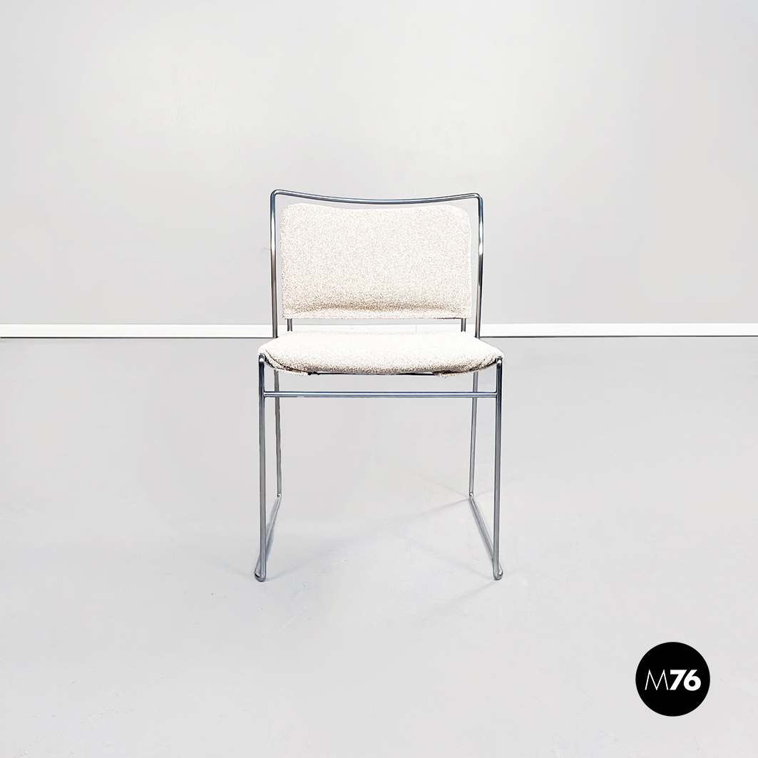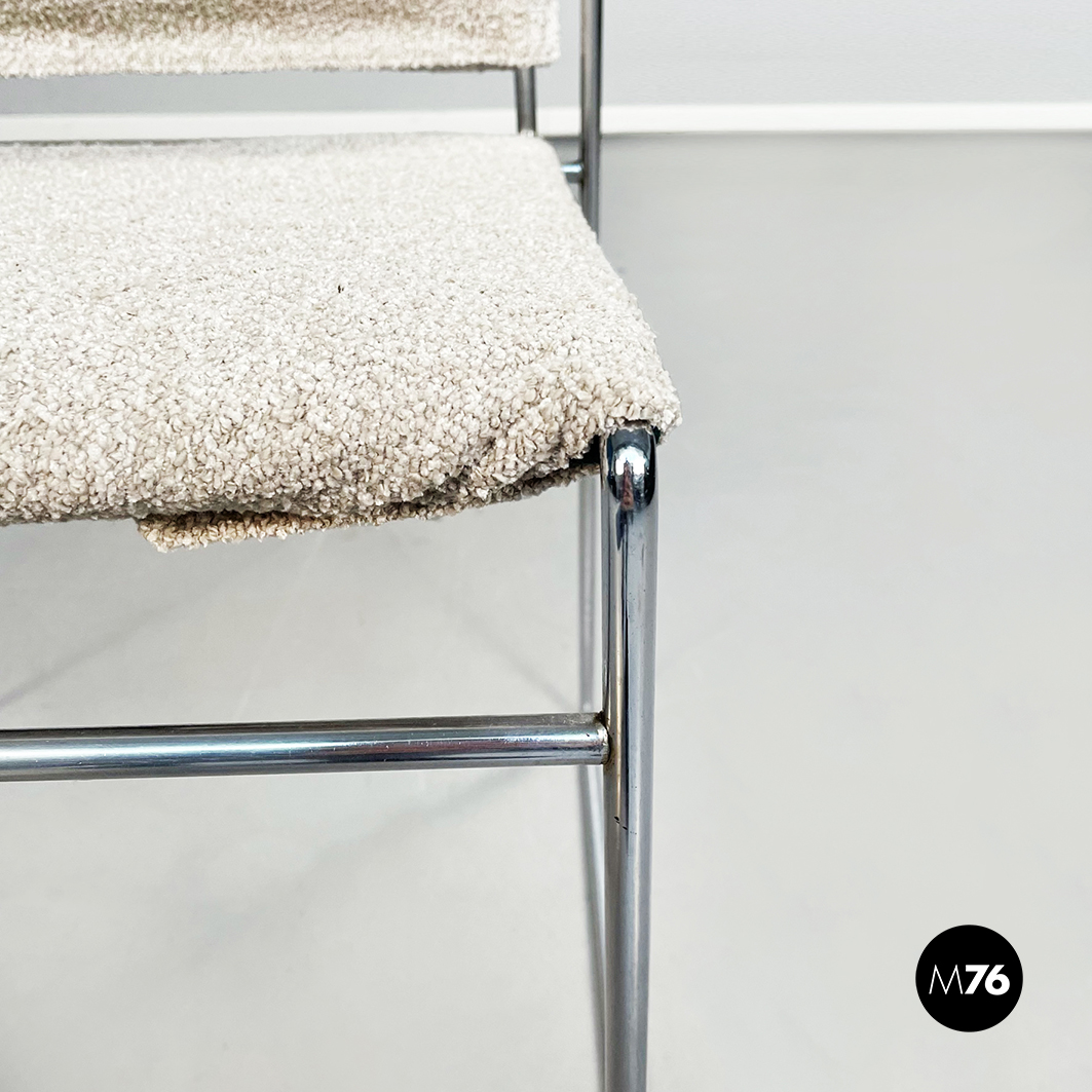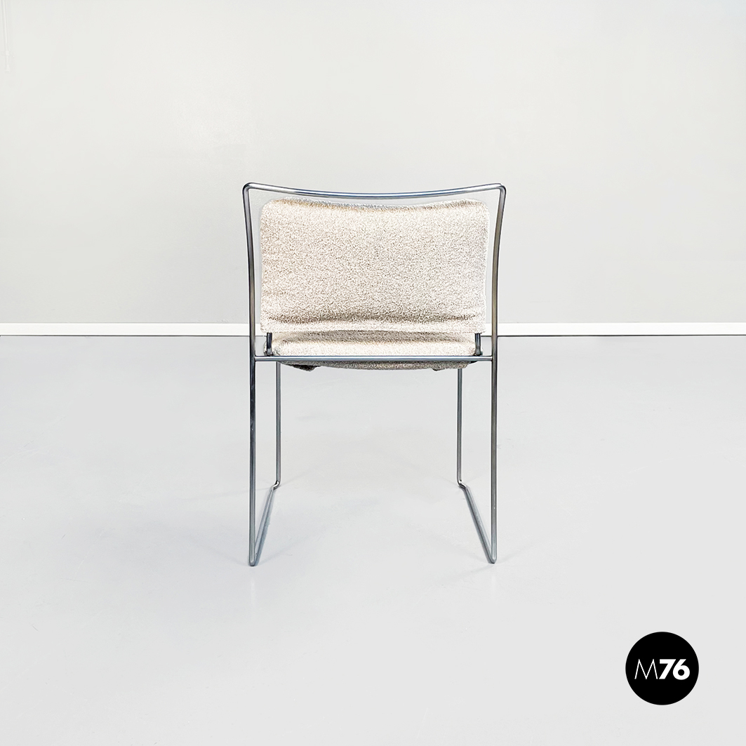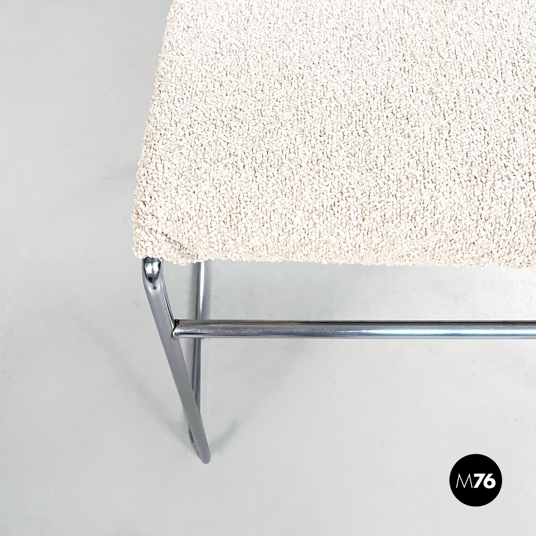 Sedia modello Tulu con struttura in tubolare di acciaio inox e con seduta rettangolare imbottita e rivestita in tessuto bouclè bianco sostenuta da sotto attraverso delle cinghie elastiche nere.