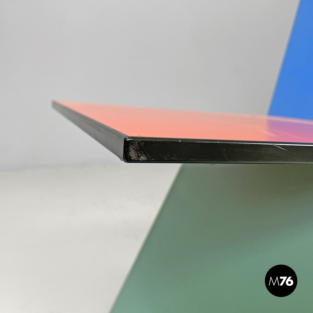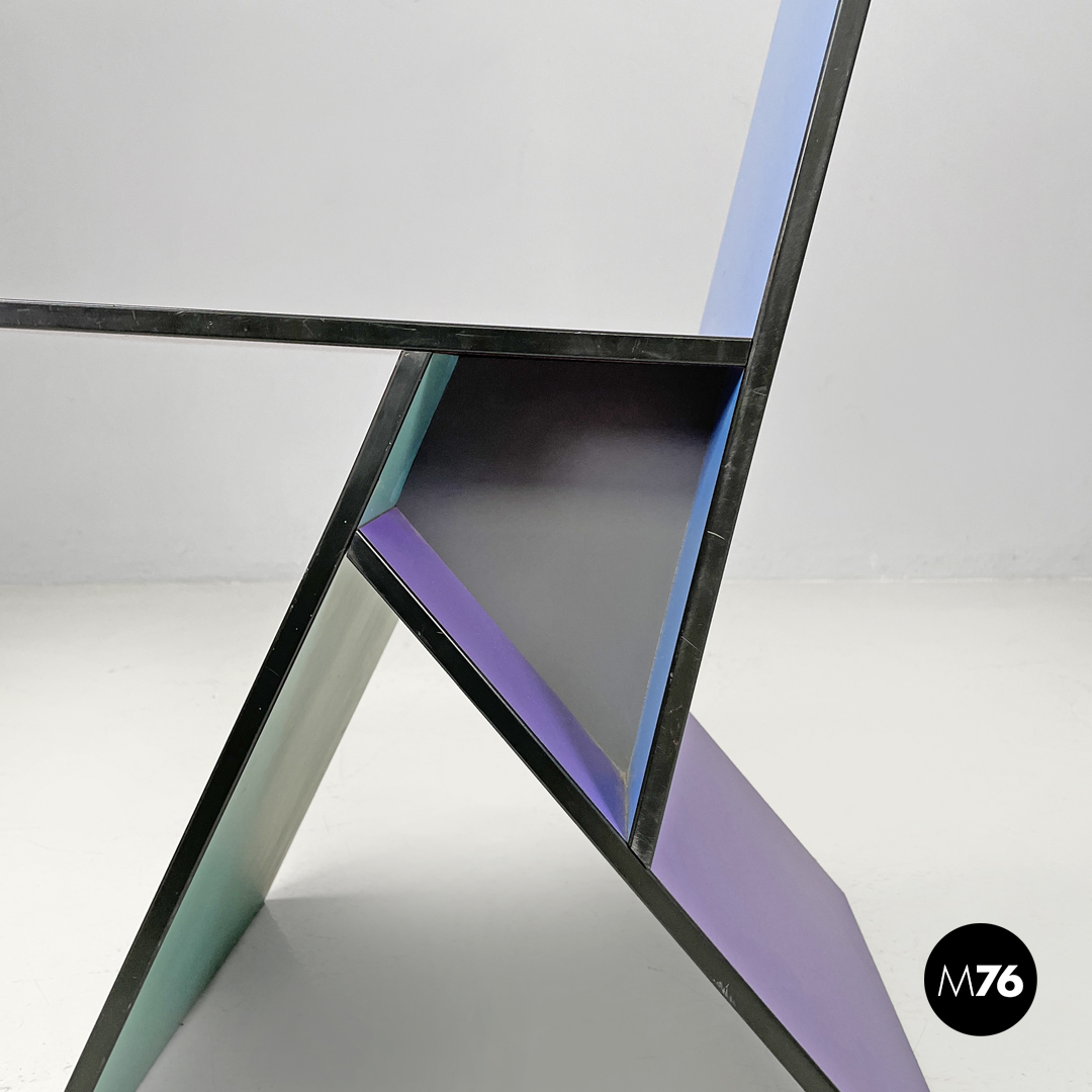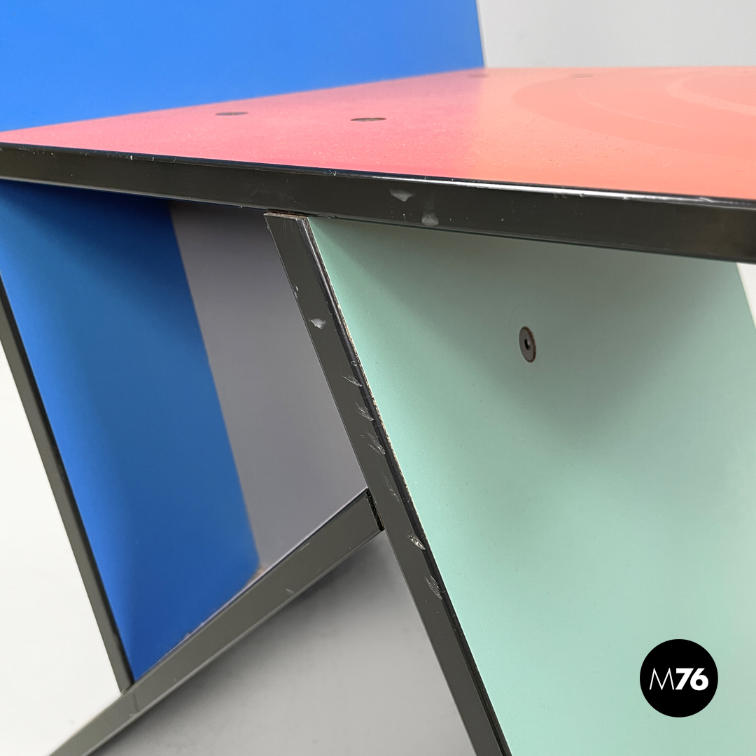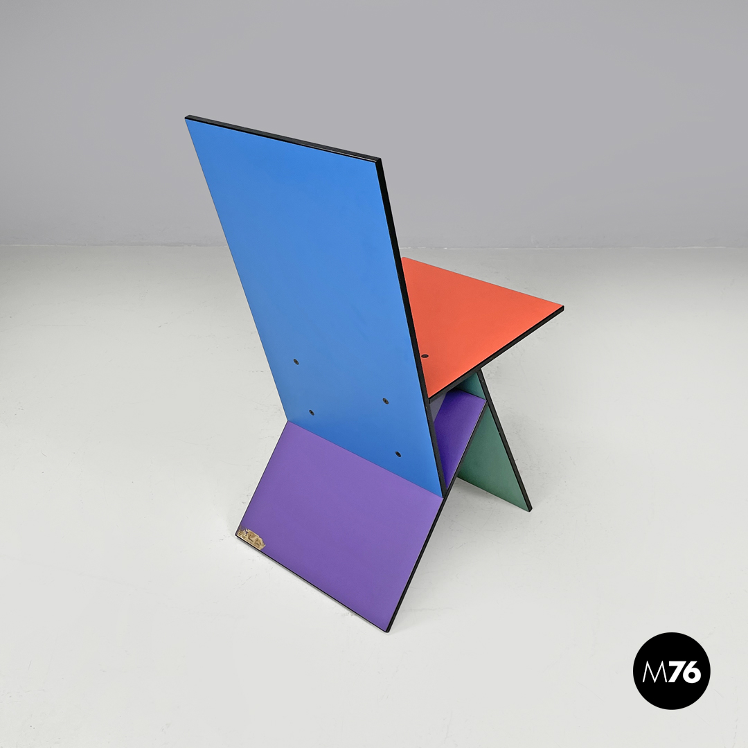 Sedia modello Vilbert in formica blu viola verde rossa e grigia con bordi neri. La struttura segue linee geometriche e regolari ed è composta da tavole rettangolari che si incrociano a formare schienale seduta e gambe.