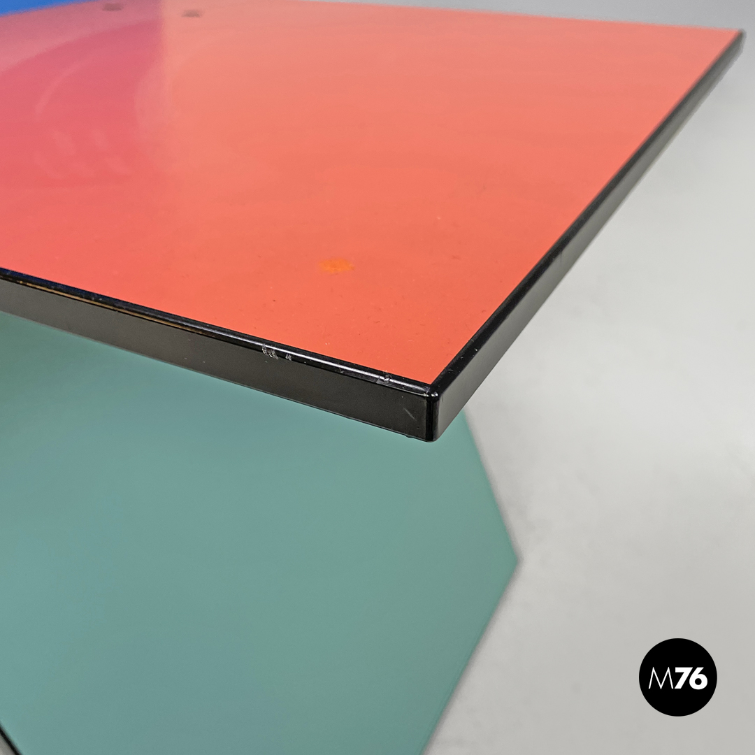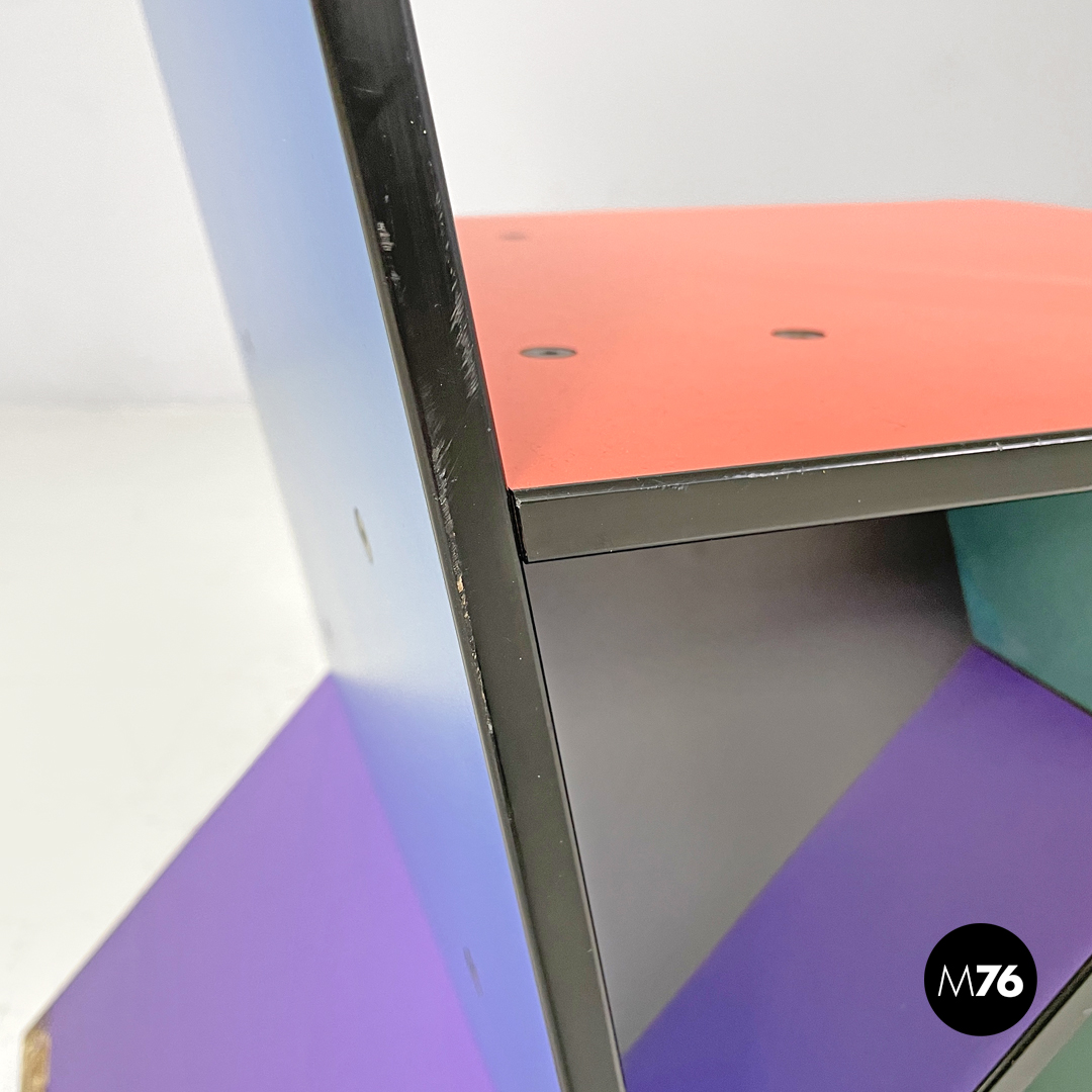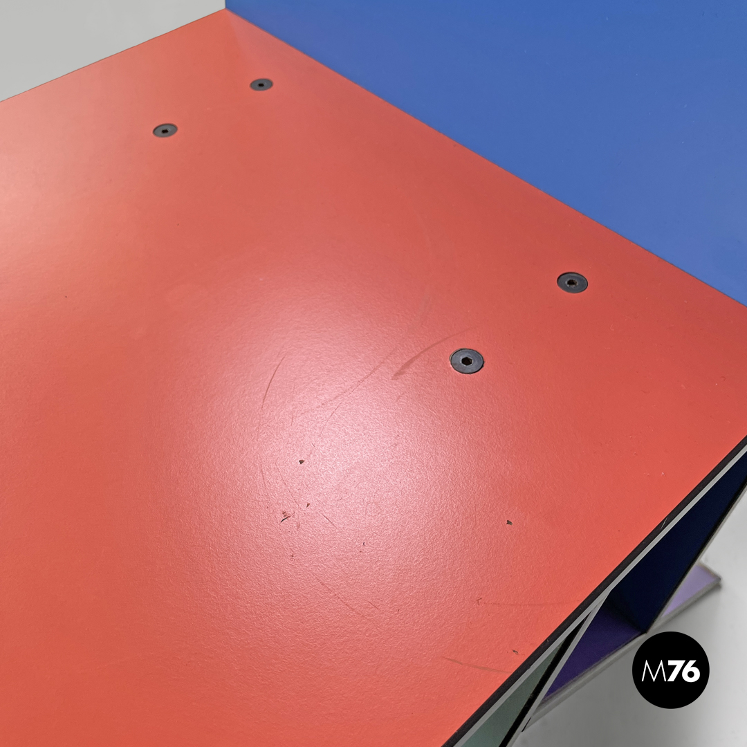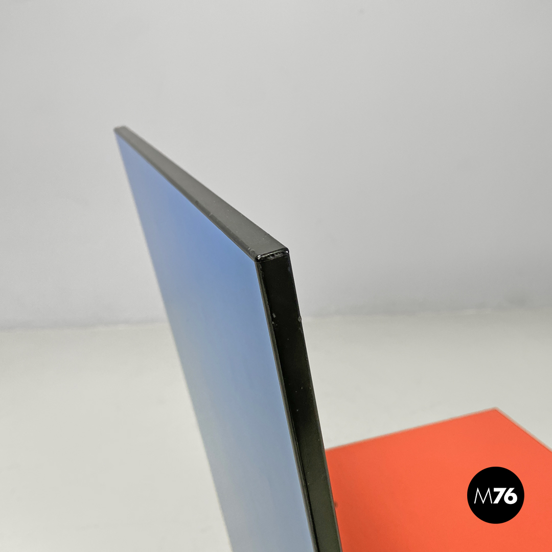 Sedia modello Vilbert in formica blu viola verde rossa e grigia con bordi neri. La struttura segue linee geometriche e regolari ed è composta da tavole rettangolari che si incrociano a formare schienale seduta e gambe.