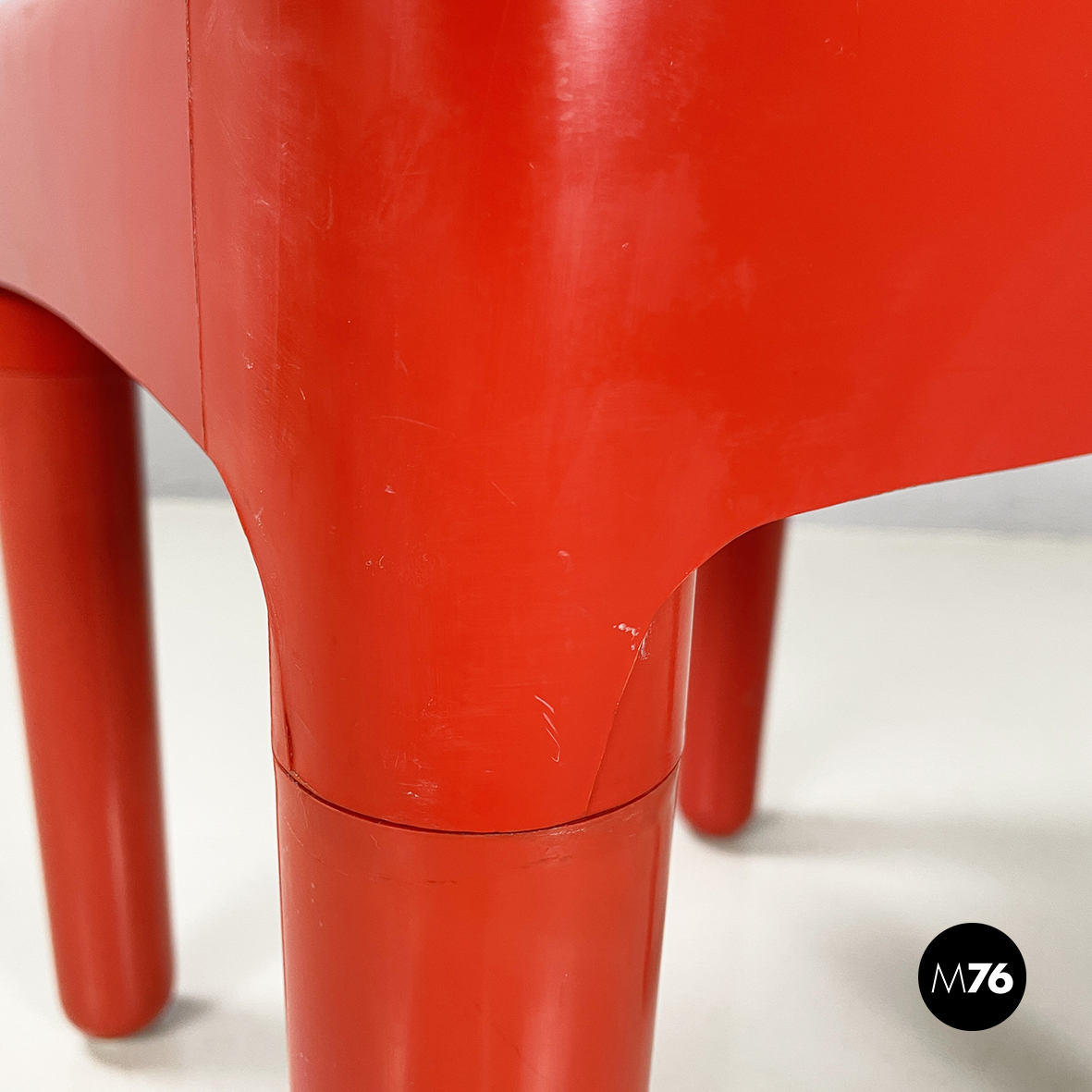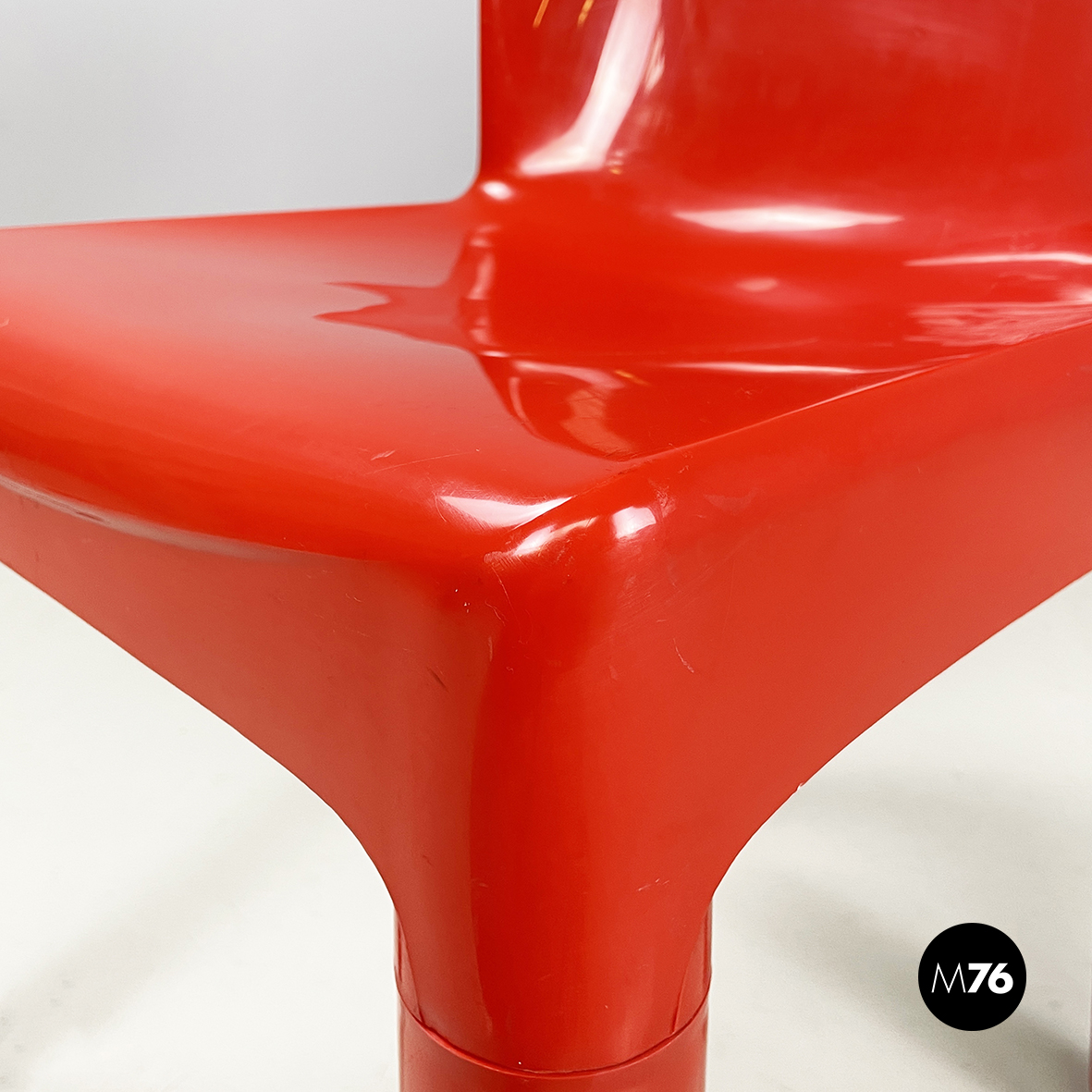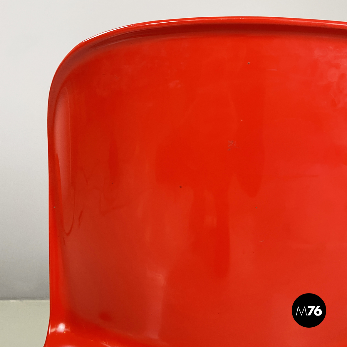 Coppia di sedie modello 1050 interamente in plastica rosso brillante. La seduta e lo schienale presentano una linea curva e tondeggiante. Le zampe sono a sezione tonda.