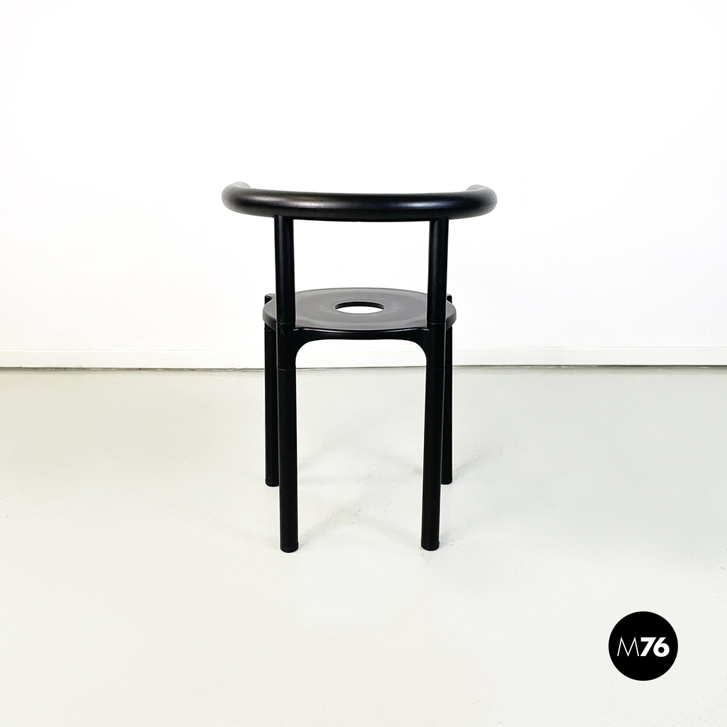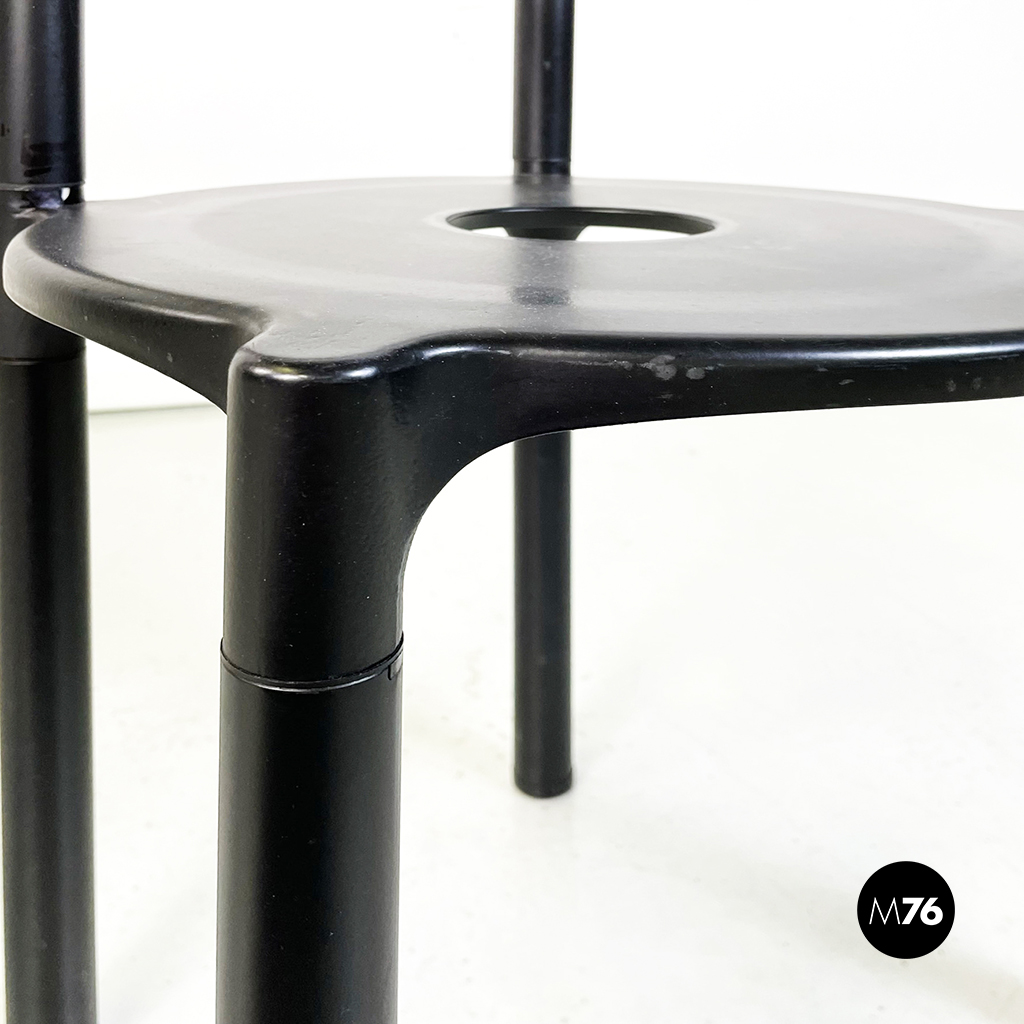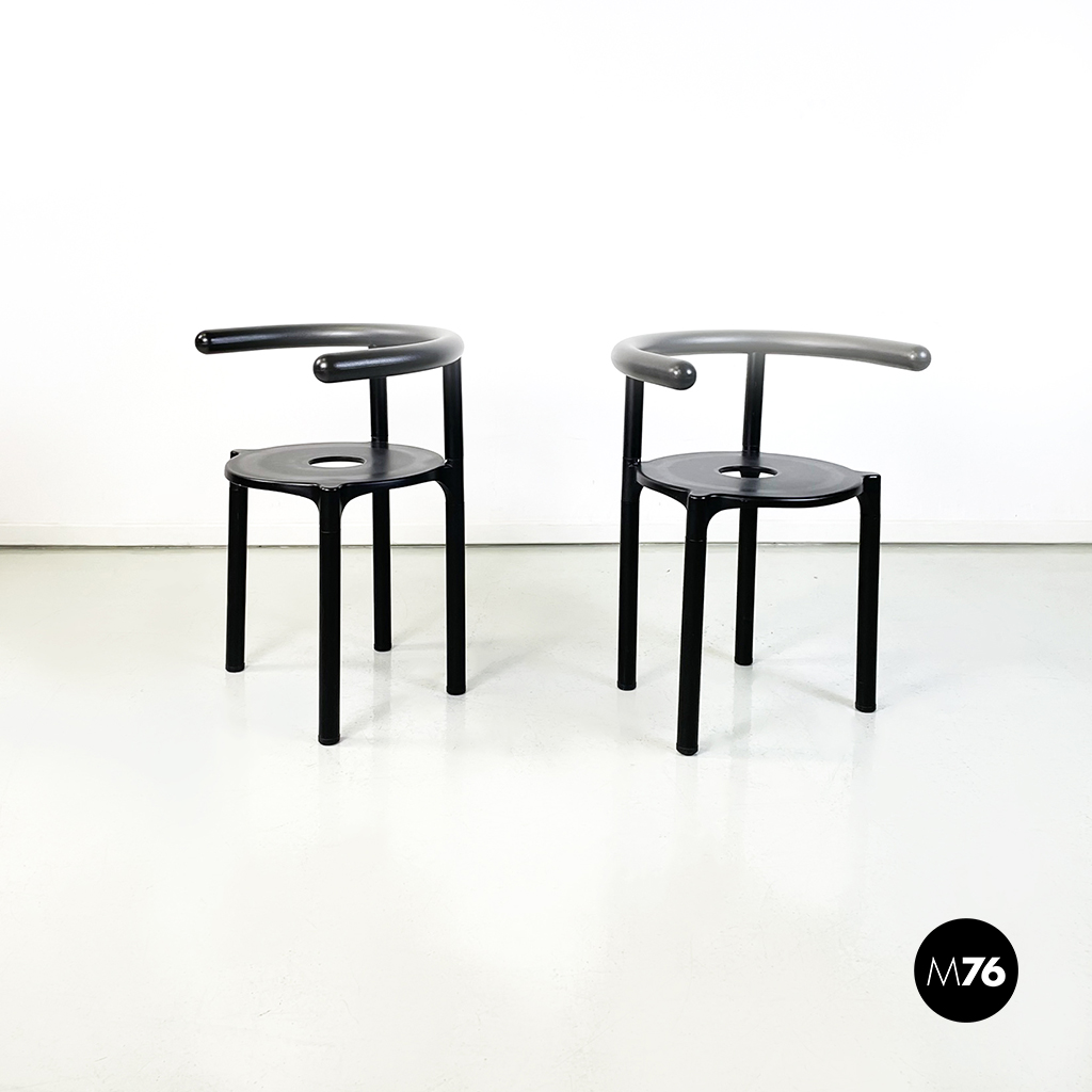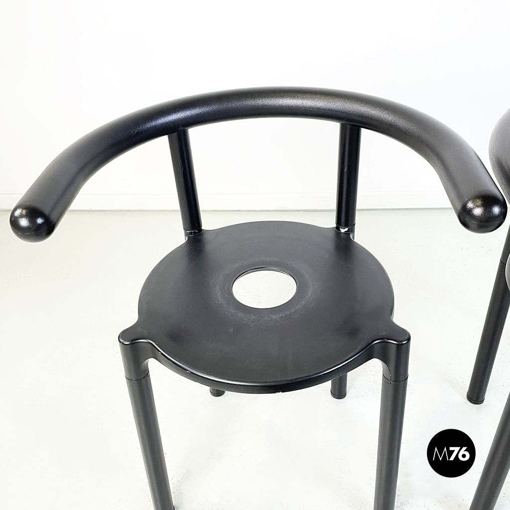 Coppia sedie modello 4855 con seduta tonda forata al centro in plastica e metallo nero. La struttura a forma di pozzetto presenta dei braccioli curvati a sezione tonda. I braccioli e lo schienale presentano una texture ruvida. Zampe a sezione tonda smontabili con piedini in gomma nera.