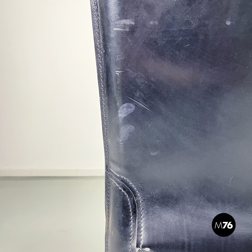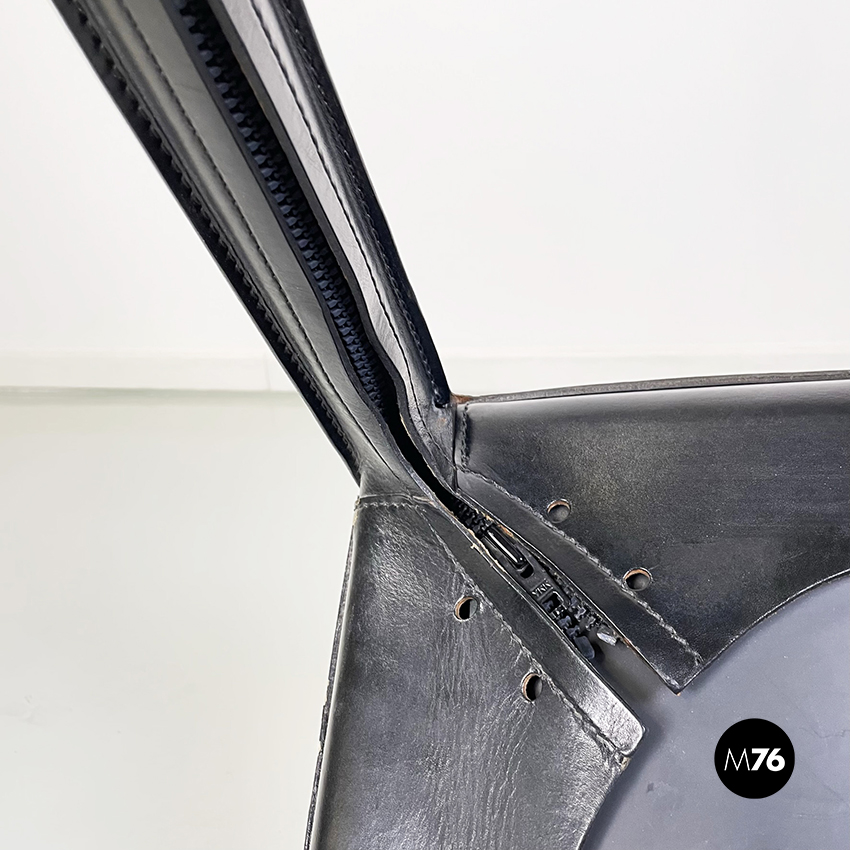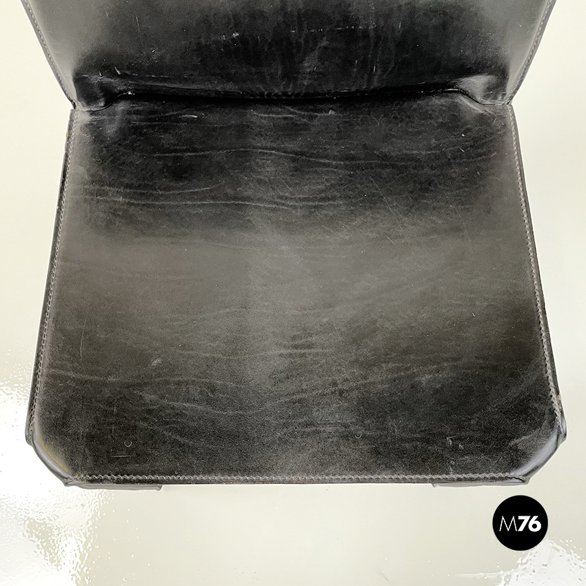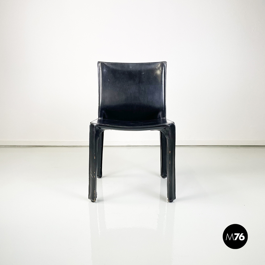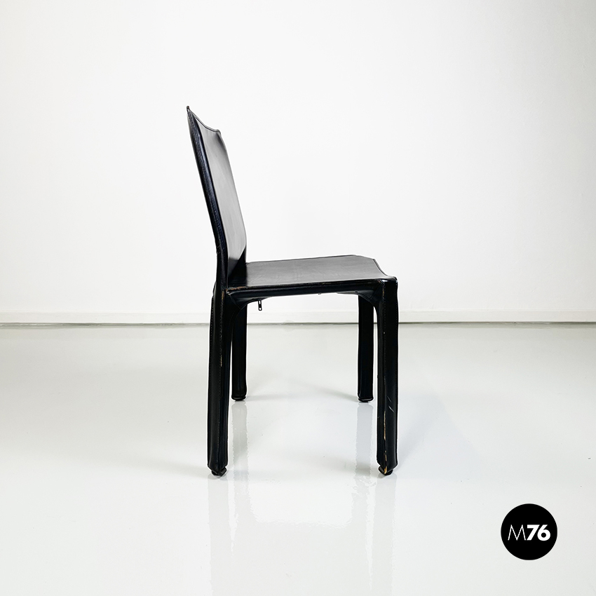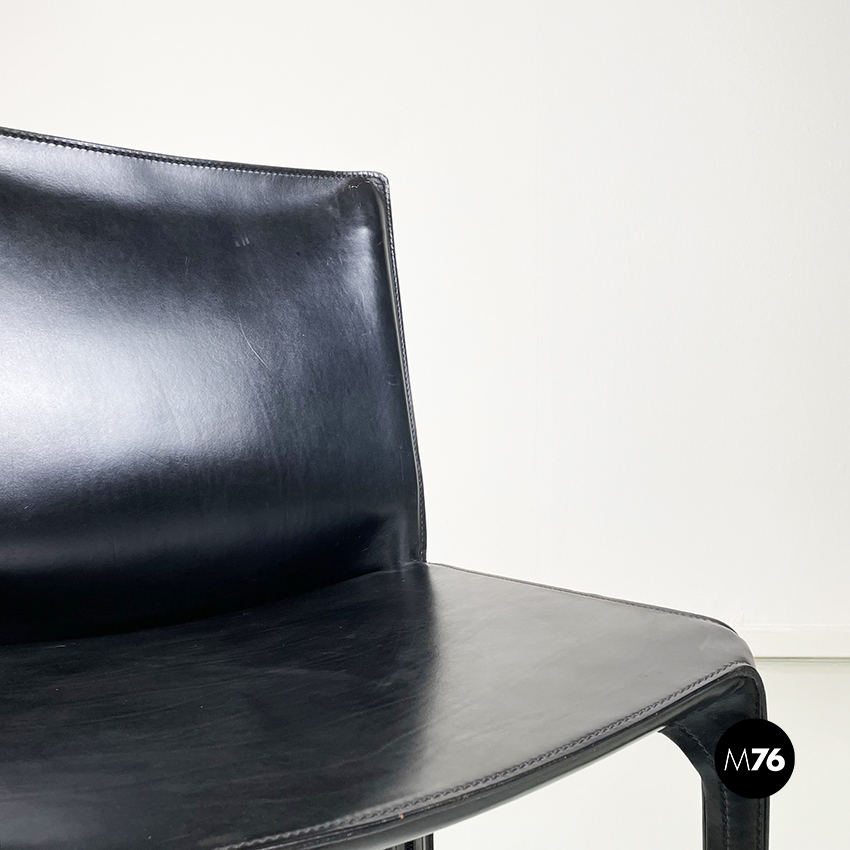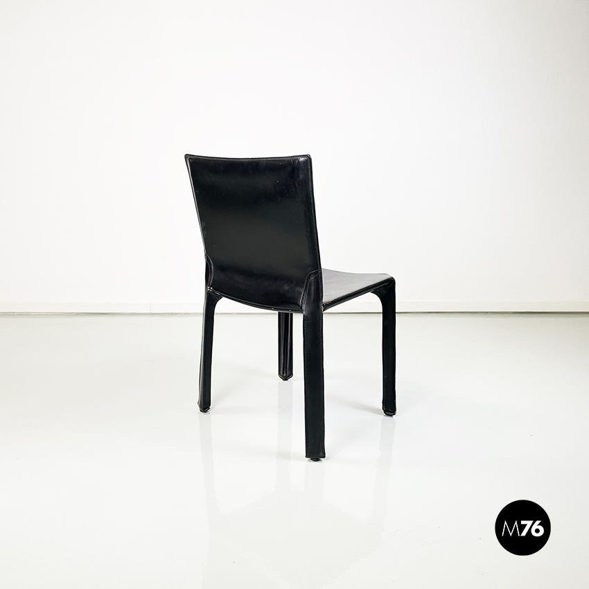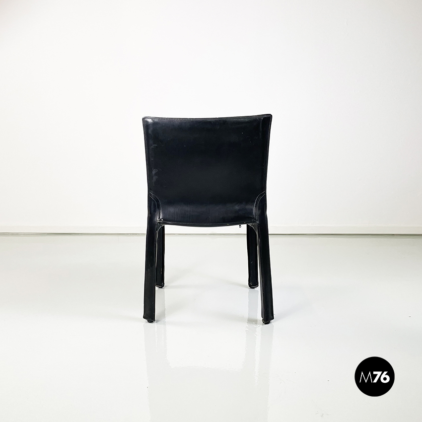 Set di sei sedie model CAB 412 in pelle nera. Il cuoio segue le forme della seduta dello schienale e delle gambe. Cuciture a vista. Sotto la seduta sono presenti delle cerniere che chiudono la pelle.