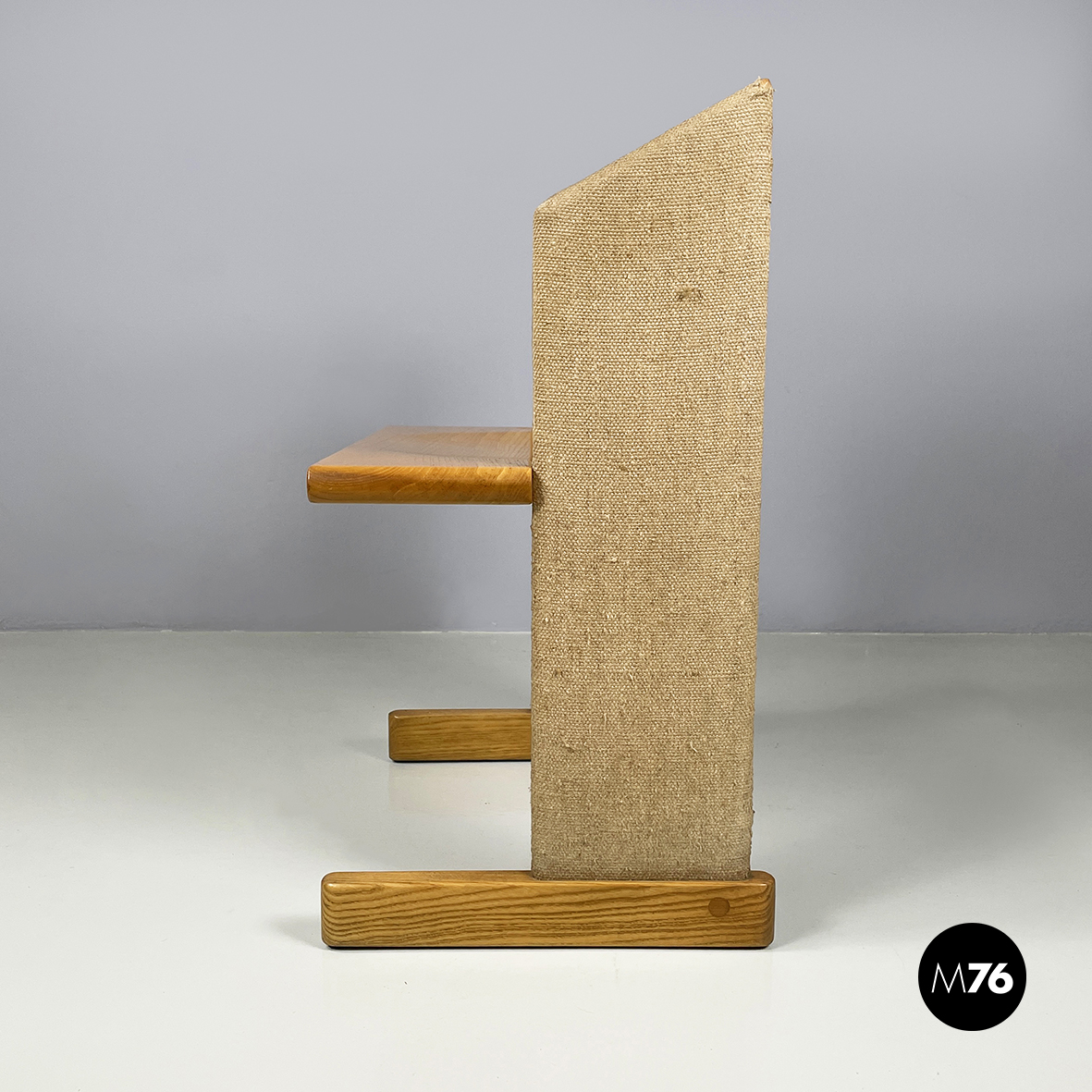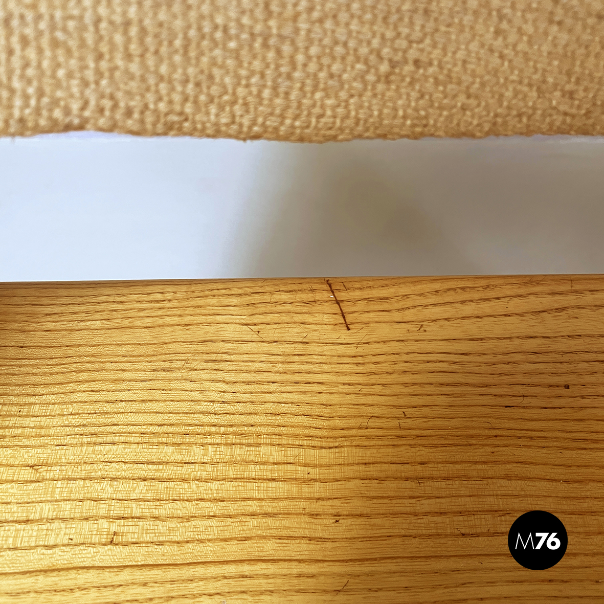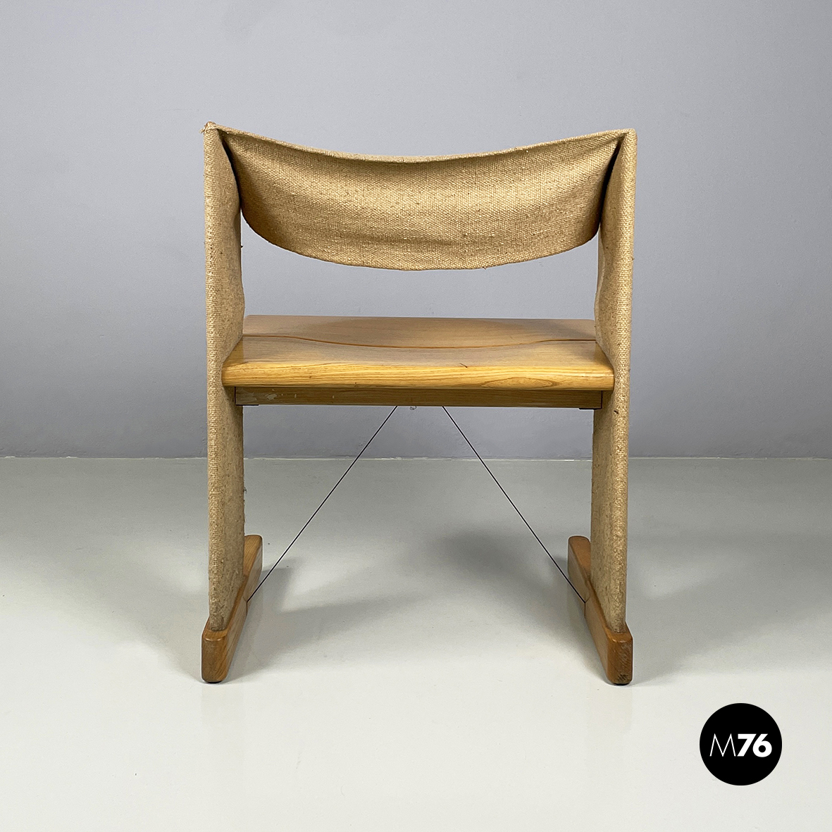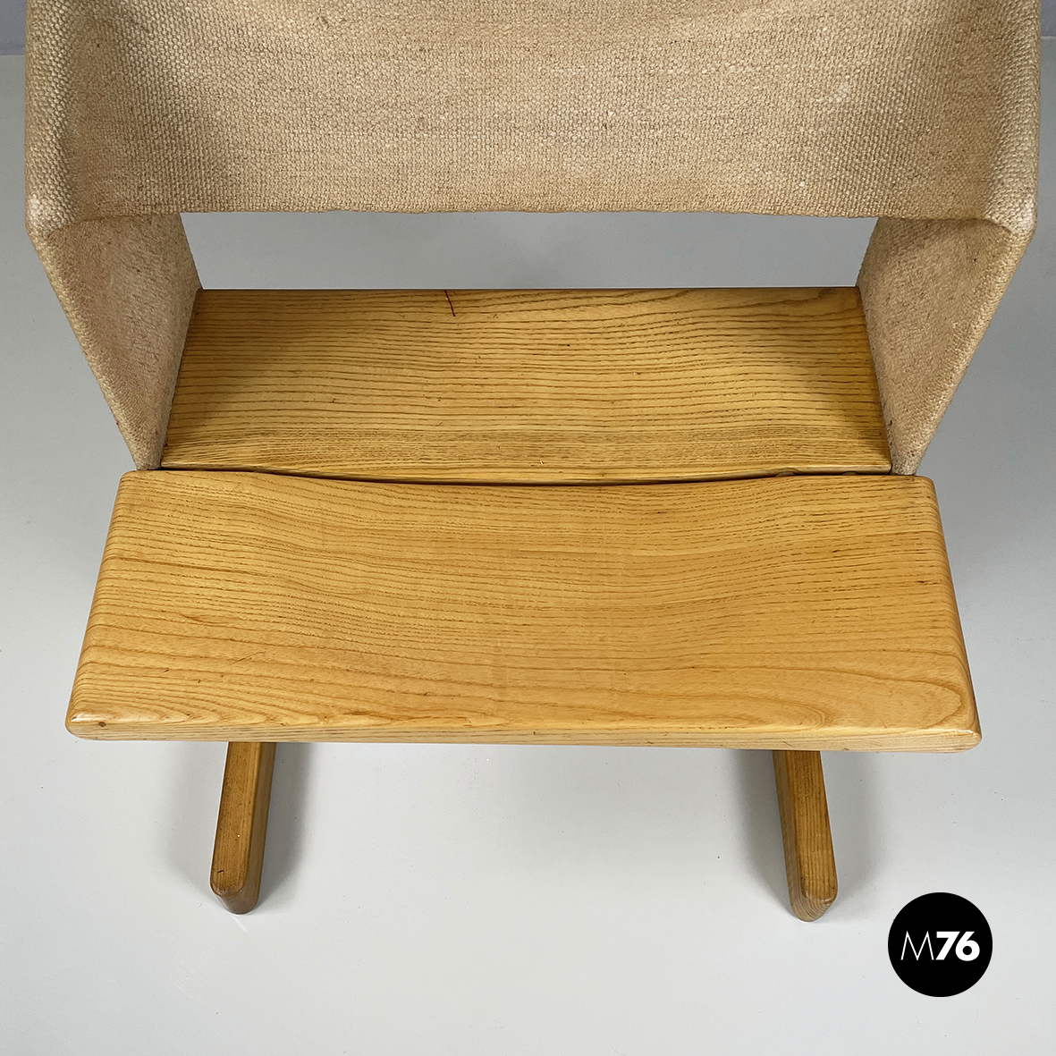 Set di sei sedie modello Canossa con seduta rettangolare ad angoli arrotondati in legno chiaro. Lo schienale in tessuto beige presenta una struttura in legno non visibile. Le due zampe sono in legno rivestite in tessuto e presentano al centro due fili metallici di supporto. Piedini ovali in legno chiaro.
