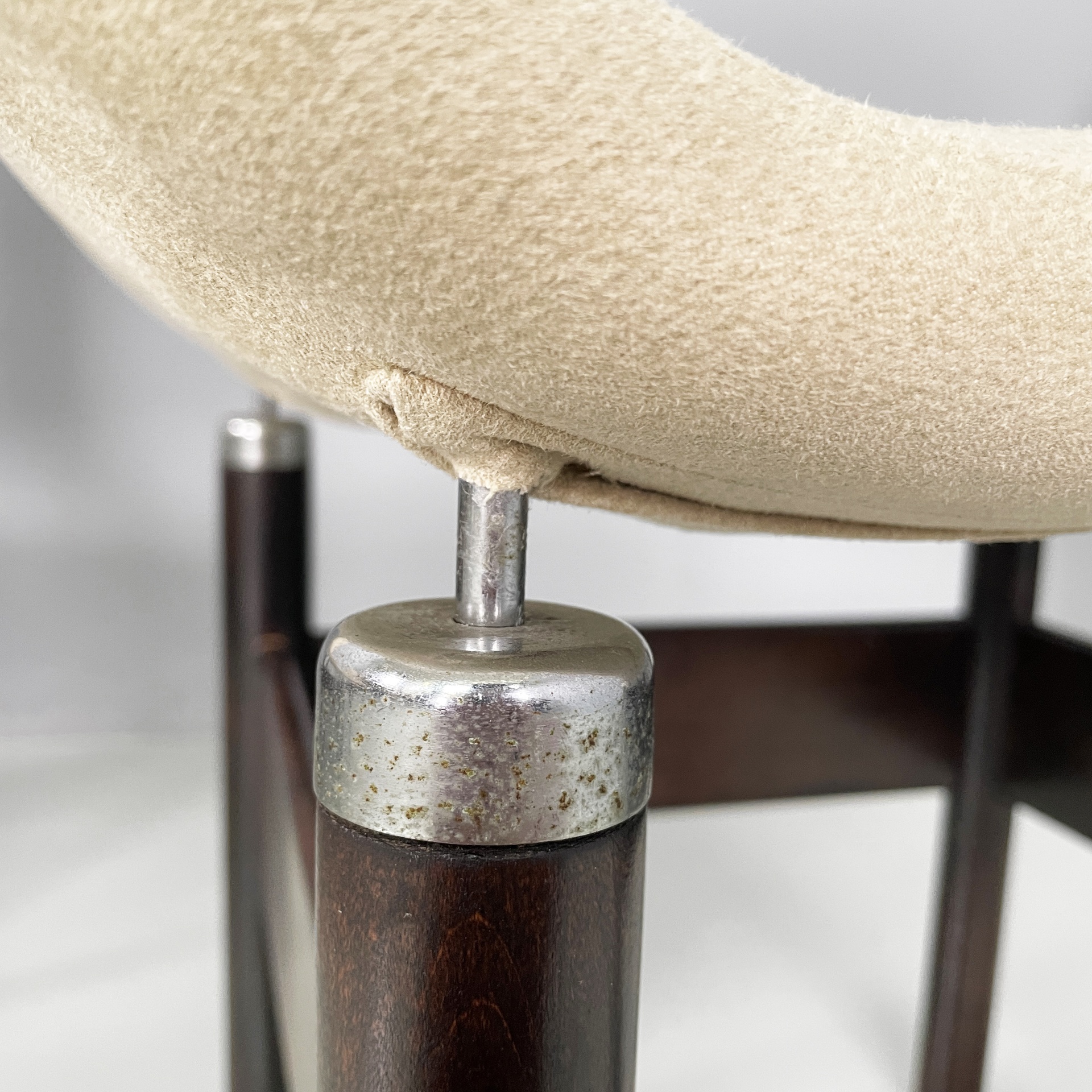 Buone condizioni, il legno e il metallo presentano segni dati dal tempo. La seduta e lo schienale sono stati imbottiti e rivestiti a nuovo con pelle finta.