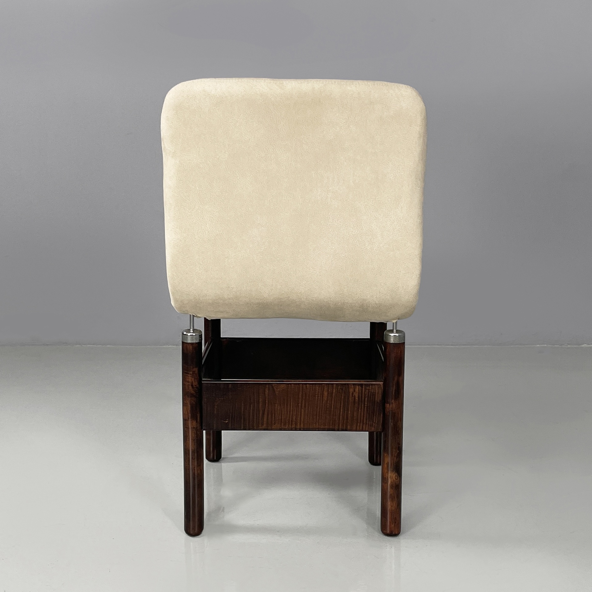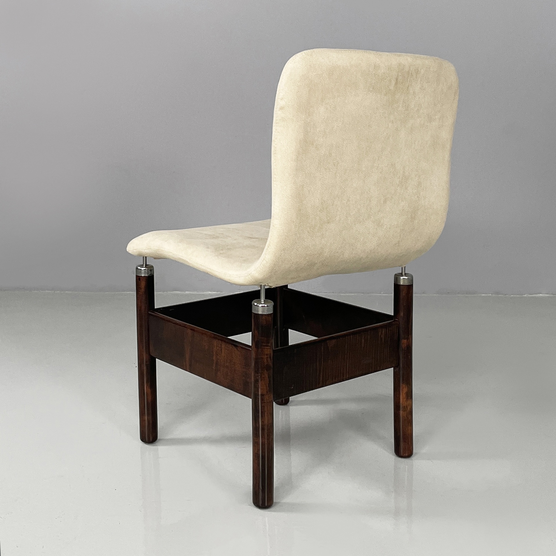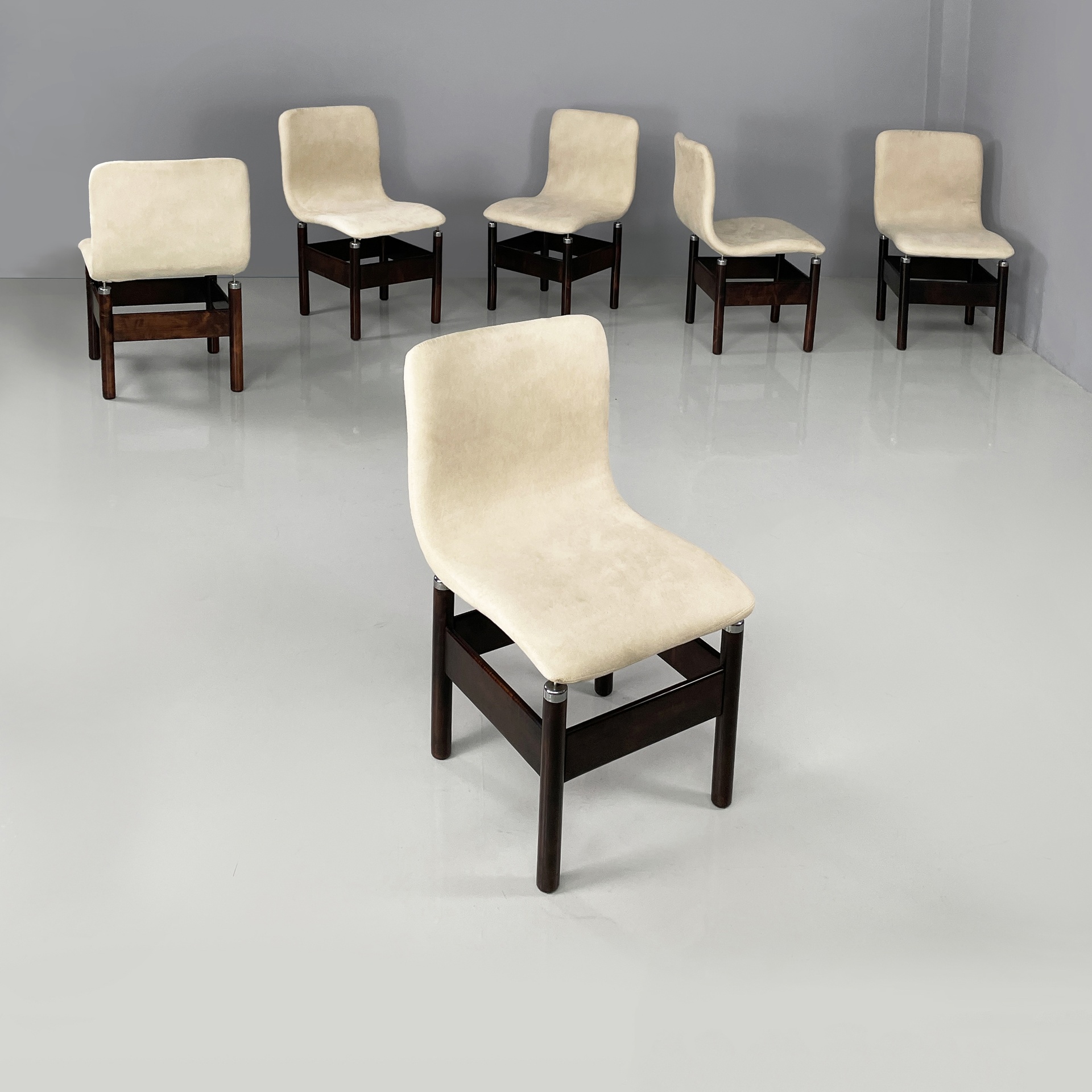 Set di sei sedie modello Chelsea con seduta e schienale sagomati, imbottiti e rivestiti in sky bianco. Le zampe a sezione tonda in legno presentano puntali in metallo cromato sotto la seduta e listelli in legno ad unirle.